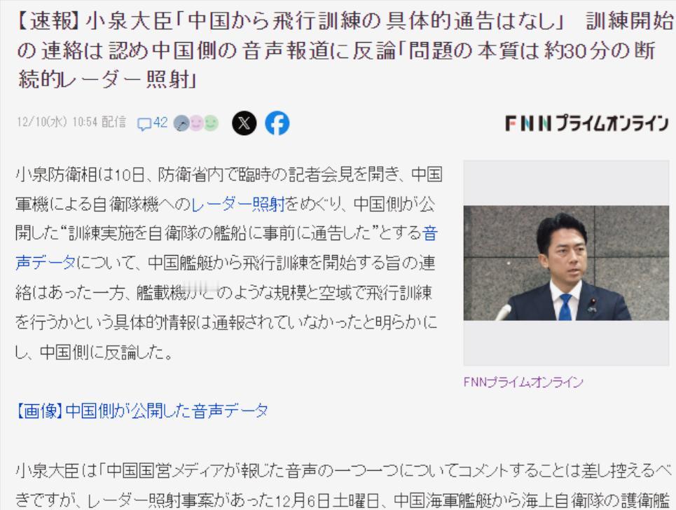 12月10日上午,针对中国发布的录音,日本防卫大臣小泉进次郎召开了新闻发布会。 在会上,他承认日本自卫队的舰艇确实提前得到了关于演练的通知,但他说中国没有告诉他们具体的飞机训练规模和空域信息。而且他强调问题的关键不在于有没有通知,而是在于中国使用了大约30分钟的雷达照射。 为什么我觉得他的话有点滑稽呢?他的逻辑其实挺绕的,简单来说就是:他承认中国提前通知了日本舰艇的演练情况,但只提到舰艇,而不是飞机。 然后他认为,单纯通知演练的情况不够,必须告诉日本具体的规模和其他信息。 既然中国没提供这些信息,日方就有理由派飞机去探查情况。 但不管是不是提前通知了,最关键的是中国用雷达照射了他们,而这个才是他们抗议的焦点。 这逻辑其实有点像两个朋友吵架,一个对另一个说:“我们先不讨论为什么吵架,反正你吵我就是错。”这样的说法,感觉有点不讲理,像是耍脾气。 日本方承认中国提前通知了他们,但通知的对象是舰艇还是飞机,意义其实差不多。因为我们没办法干涉日本自卫队的内部沟通。如果我们通知了日本舰艇,但他们没把信息转告给飞机,那是日本自己的事。 按国际惯例,提前公布演习情况并不意味着必须提供演习的规模等详细信息。要是日本要求中国公开所有演习数据,那简直是无理取闹。 日本政府现在知道自己理亏,所以开始狡辩和装作委屈。日本一直强调雷达照射是中国的“挑衅”,实际上中国已经公布了相关的技术参数。在50公里范围内,国际上大多数战机的雷达都能覆盖到。我们对日本进行雷达照射,其实只是正当防卫和常规警告而已。 真心建议日本不要再煽动舆论。如果不想造成误判,应该积极解决关于台海问题的错误言论,撤回不当言论,推动更广泛的对话,这才是两国关系的正确发展方向。