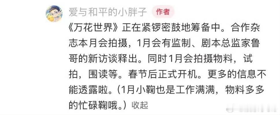 鞠婧祎《万花世界》1月围读试拍,春节后正式开机,这个月还有杂志的拍摄,好忙啊感