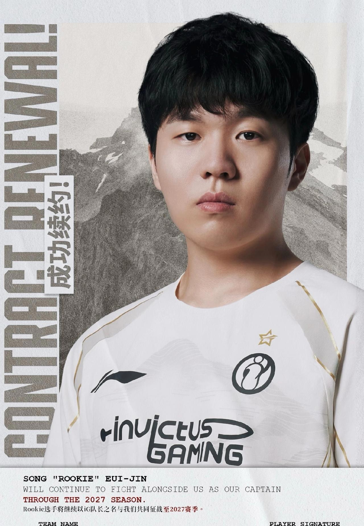 IG官宣:中路选手Rookie续约至2027。 看来宋义进是真的喜欢IG这支队伍,其它兄弟都跑完的跑完,当主播的当主播了,只有他今年这阵容都还愣签了两年 。