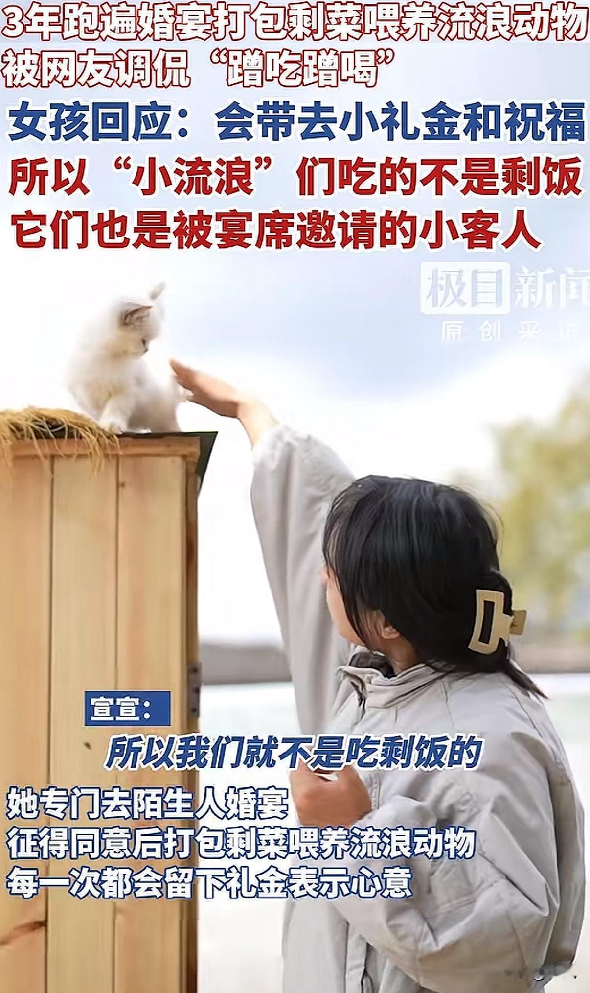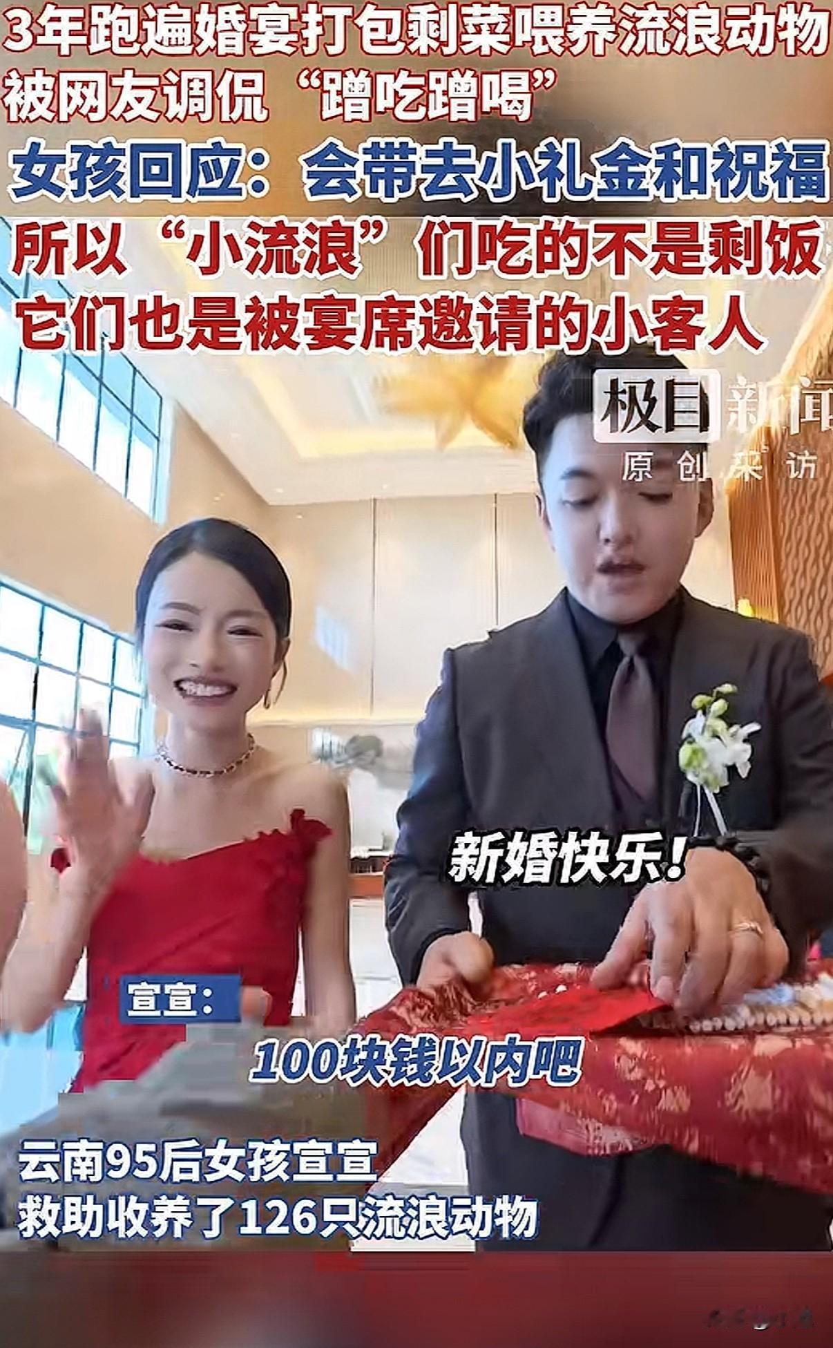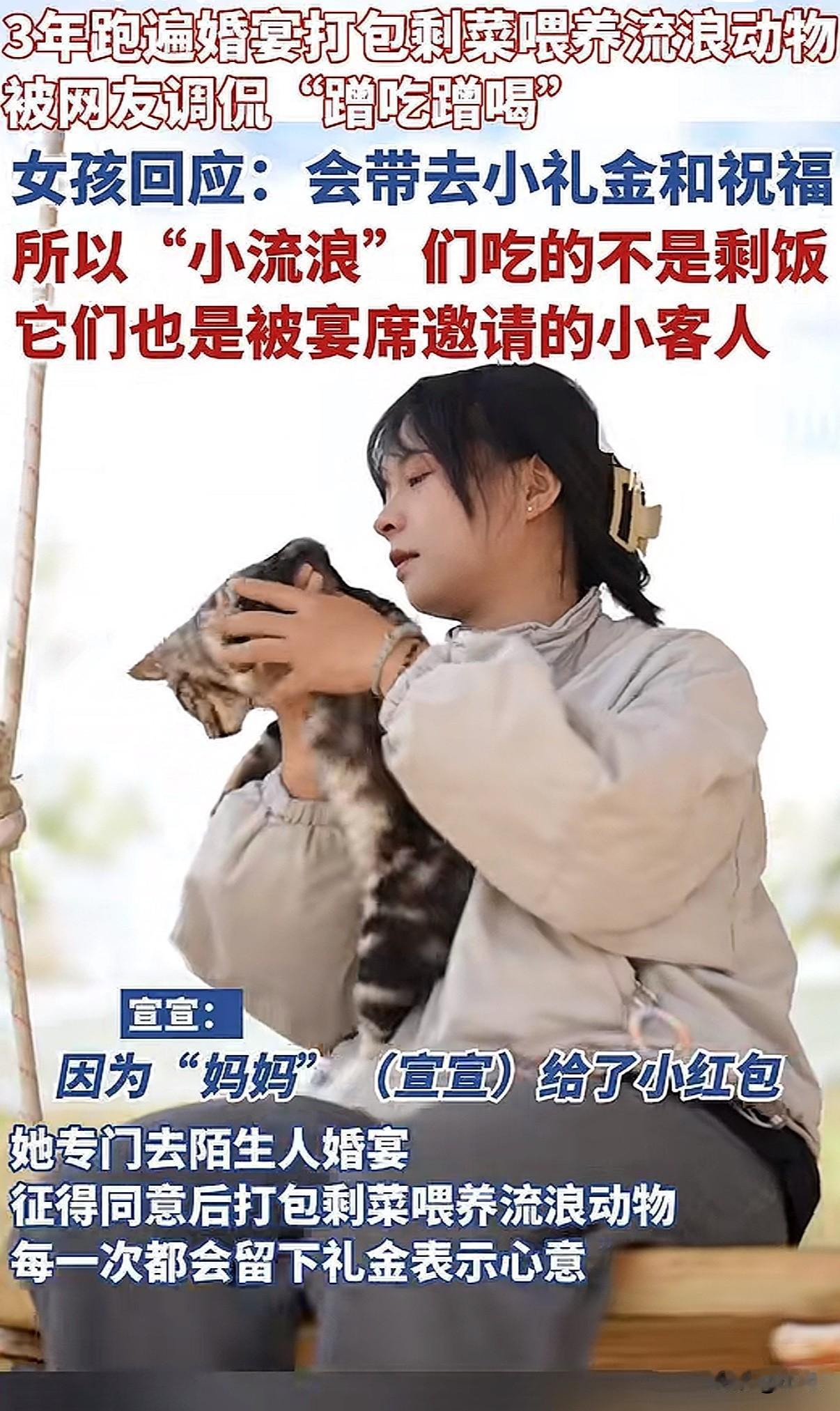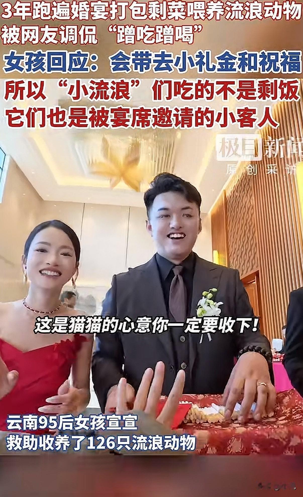 云南一个95后姑娘,一年要“蹭”近百场婚宴。 不是为了吃席,是为了给她收养的126只流浪猫狗找口粮。 这事最近火了,争议也不小。 我仔细看了她的故事,有些细节值得说说。 姑娘叫宣宣。2022年,她捡了第一只流浪猫,之后就停不下来了。 她说一开始觉得就是多添点粮的事,没想到越捡越多。 捡到第十只,家里就放不下了。超过二十只,邻居开始抱怨。 她只好带着猫狗不停搬家,最困难时搬到半山腰的公墓旁住,经济压力巨大,一度靠信用卡维持。 直到租下郊区一个旧养猪场,自己一砖一瓦改造成小院,这一百多个“毛孩子”才算安定下来。 最大的开销是吃。 2022年底,她参加一次婚宴,看到大量剩菜被倒掉,有了主意。 她开始鼓起勇气,在保山街头随机找婚宴,上前和新人商量。 她总会先递上一个红包,说:“这是猫咪们的一点心意,请收下。一会我能不能打包点剩菜?” 大部分新人都同意了。 她就等在角落,散席后快速挑拣出相对清淡的鱼、虾、鸡汤,避开辛辣重油的。 后来,知道她的人多了。有酒店老板主动联系,也有新人提前预约她。 很多新人会邀请她一起坐席,这时她会再补一份当地惯常的份子钱。 新人推辞,她就说:“这是猫猫的心意。” 有网友说,因为她给了红包,这些猫就不是吃剩饭的流浪猫,而是被宴请的小小嘉宾。 11月底一位张女士结婚,提前邀请了她。 新娘后来拉着她的手掉眼泪,说:“是我没沟通好,看你今天没打包到多少……” 新娘说,宣宣给了流浪猫一个家,而他们能给小猫提供一餐,也让婚礼更有意义。 打包婚宴,每周两三次,每月能省几千元猫粮钱。 这些钱可以用在打疫苗、做绝育上。 晚上回到小院,她会把打包的菜用清水煮一遍,去掉油盐。 然后开直播,叫“深夜小咪食堂”。 猫从四面八方聚过来。 她给每只猫都取了名字。她说,有名字就是有身份了,是家人,不再是“小流浪”。 上个月突然走红后,她直播在线人数从几百涨到上万。 收入有些改善,给猫的伙食从猪肺升级到了鸡胸肉和罐头。 当然也有质疑。 有人说投喂会让流浪动物越来越多。 她的小院里有隔离间,新来的猫狗会先观察、打疫苗,然后安排绝育。 她说,不能让它们无止境地生下去。 有人说她立人设赚钱。 她不否认直播有收入,偶尔接点小广告。 她说,做救助是一条没有尽头的路,能力越大,看到需要帮助的越多。她只想在力所能及范围内,让它们吃好喝好。 有人说她根本不“社恐”。 她说,是这些猫狗给了她勇气,让她敢去开口要剩菜,敢去直播、拍视频。 她妈妈每天帮她打理猫舍,嘴上说不理解,却心疼她:“她好像爱这些流浪猫狗爱到了骨子里。” 她爸爸仍不太接受,觉得这不靠谱,还是该有份正经工作。 宣宣说:“或许我们注定成为不了星星,但我们可以成为萤火虫,照亮前方的一点点就可以了。” 看完整件事,我觉得有几个地方很清晰。 她给了流浪猫狗一个地方住,并且给它们绝育,这是负责的做法。 她每次去婚宴都事先沟通、送上礼金,尊重了新人,也给了自己体面。 打包剩菜,减少了食物浪费。 至于背后的动机,是纯粹爱心还是掺杂其他,每个人看法可能不同。 但那一百多只猫狗确实因此有了栖身之所和一口饭吃。 这件事里,我看到的是一个年轻女孩,在能力范围内,用一种特别的方式,默默承担起一群生命的分量。 而很多陌生新人的善意,也让这场救助变成了温暖的接力。 你怎么看呢?