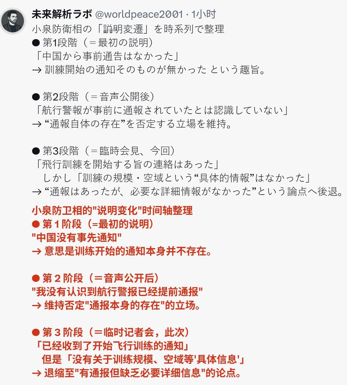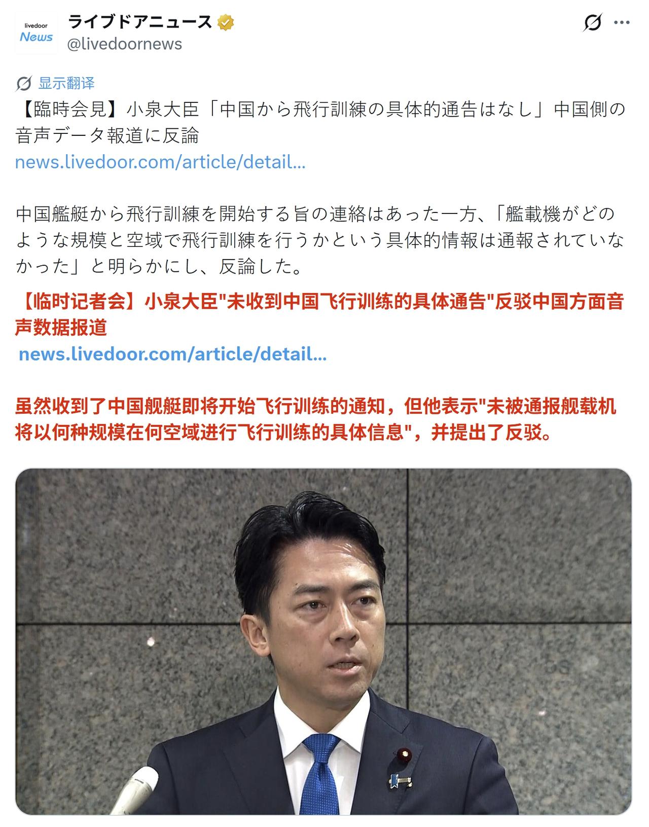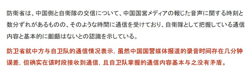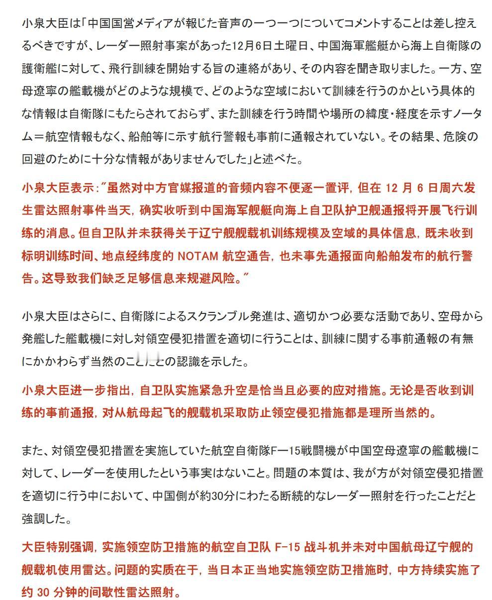 昨天的今天的小泉进次郎变化很大,前一天还在否认收到中方舰艇报,后一天随着录音公开只能承认事先收到通报。不过还在狡辩,声称虽然通话录音是真的,中方也有事先通报,但传达信息不够详细。 比如中方虽然事先联系日本军舰,但通报信息并没有包括辽宁舰上飞机型号、训练空域等信息,也没有注明训练时间和地点经纬度的航行通告。因此自卫队缺乏足够的信息来规避危险,而且不论事先有没有收到通报,日本都会对中国海军舰艇采取相关措施。所以找不到合适理由,日本又开始耍赖了。