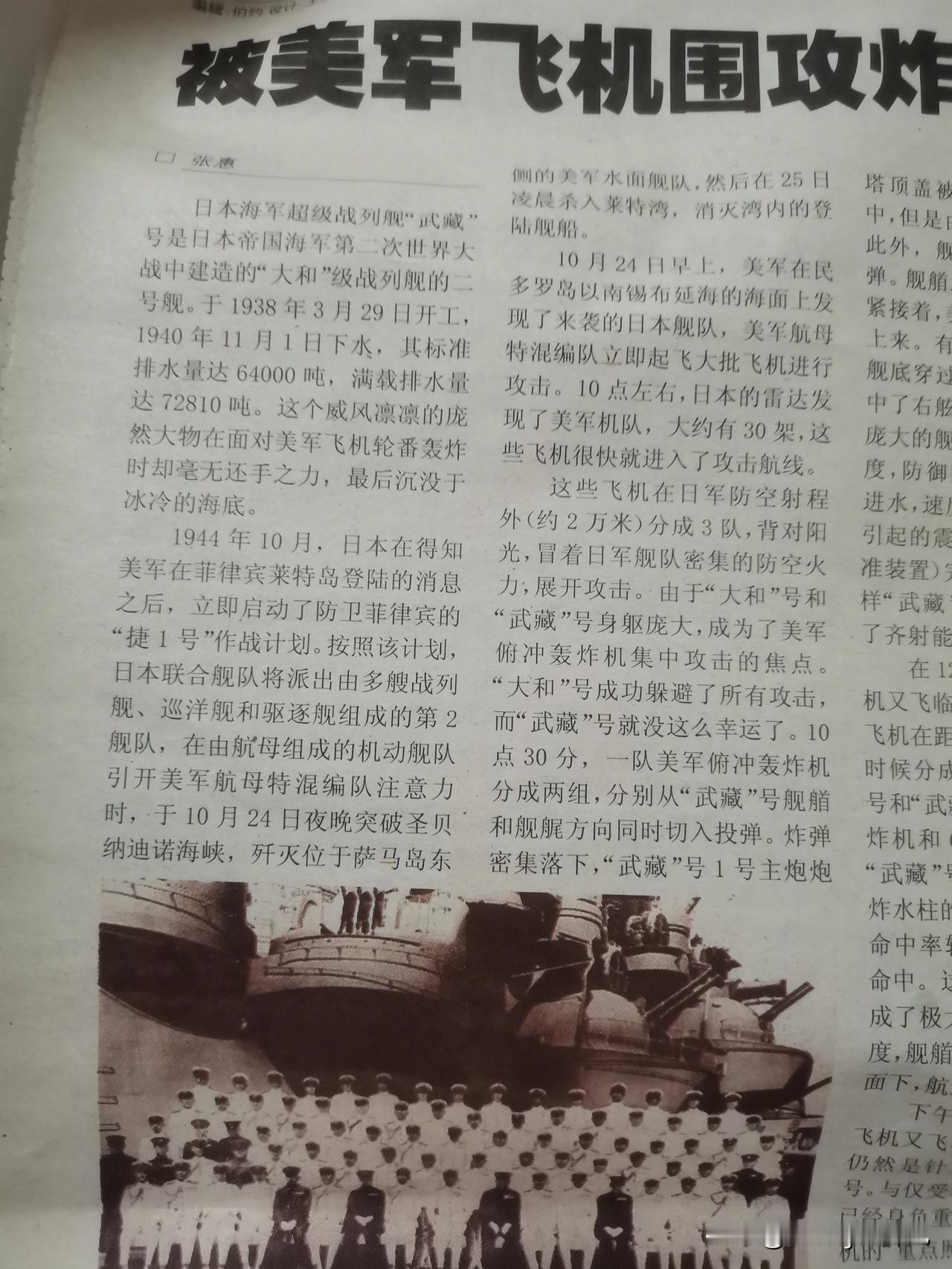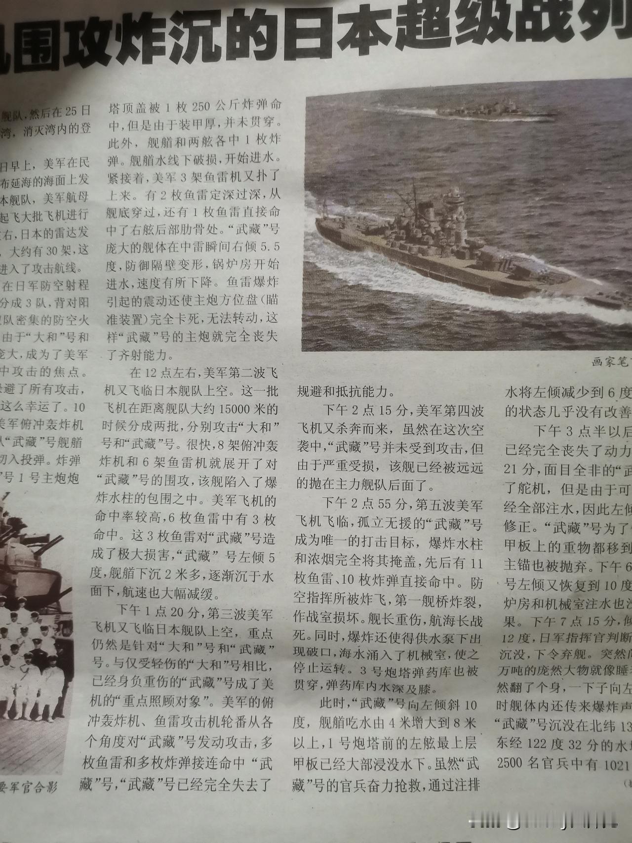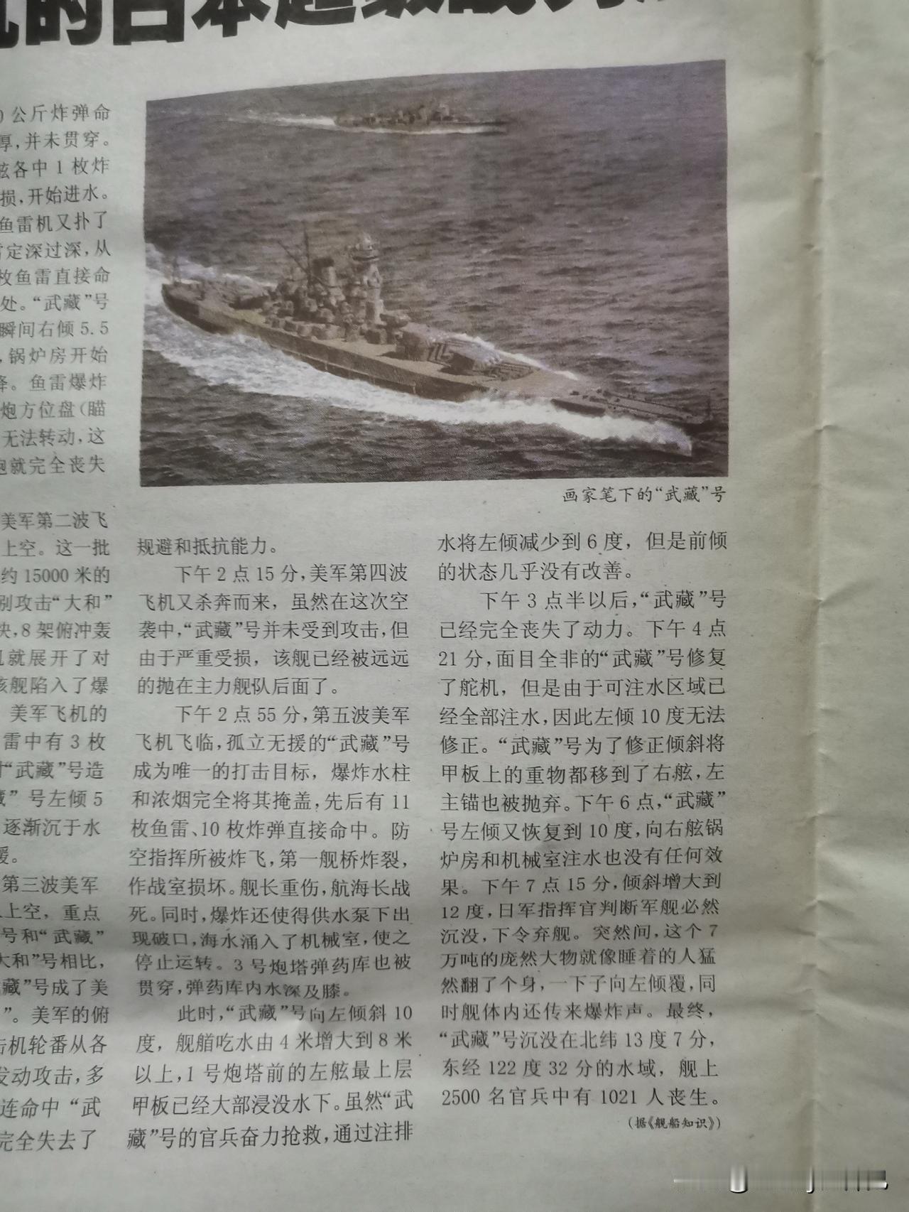 下图是2010年3月8日的《国防时报》,讲的二战被美-军击沉的本子战-列舰“武藏”号。 其标准排水量达64000吨,满载排水量72810吨。在美-军飞机的轰炸下,舰上2500名官兵有1021人丧生。 今年11月5日我国福建舰服役,成为亚洲最大的战舰,超越的就是这艘战-列舰。 本子近期有所抬头,有没有可能让其再尝尝苦果? 二战日本航母 击沉战列舰
