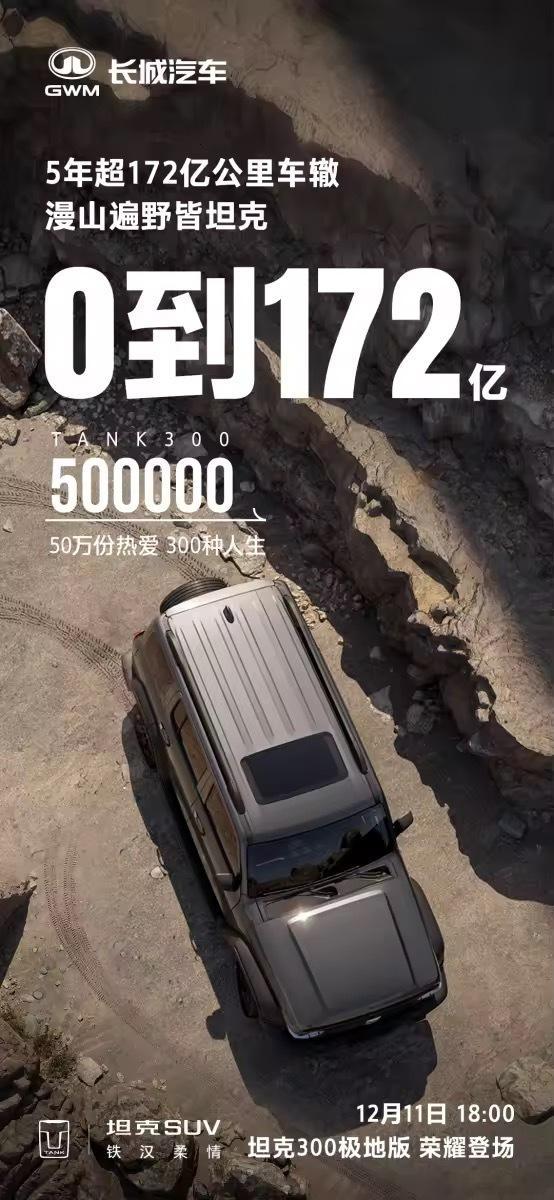 5年50个国度14个版本172亿里程数字见证 50万热爱 300种人生12月11日 18:00 坦克300极地版 荣耀登场!坦克300中国越野极地荣耀买一台车交一群朋友从长城车到长城站