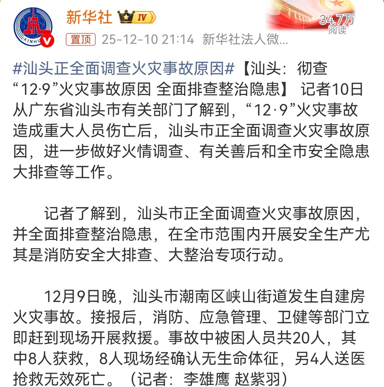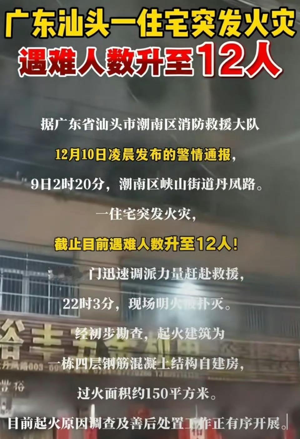 12月9日晚,广东省汕头市潮南区峡山街道丹凤路一栋四层自建房发生火灾,造成12人死亡。其中8人当场遇难,4人虽被救出但因伤势过重,经抢救无效死亡。目前,广东省已成立多部门事故调查组,正彻查火灾原因。初步分析,事故可能与自建房“下店上宅”结构、电气线路老化、防盗窗阻碍逃生等因素有关。汕头正全面调查火灾事故原因一场火灾父母奶奶弟弟孩子都没了据官方通报,火灾发生在12月9日晚21时20分,明火于22时03分被扑灭。该建筑为钢筋混凝土结构,过火面积约150平方米,火灾发生时,楼内共困住20人,多为老人、儿童等弱势群体,最终仅8人获救成功。根据家属透露,12名遇难者均为同一家人,包括三代人,仅一名嫂子成功逃生。目前,起火原因调查及善后处置工作正有序开展,同时汕头市已同步启动全市范围内的安全隐患大排查、大整治专项行动,重点聚焦自建房、尤其是“下店上宅”类场所的消防风险。火灾为何造成重大伤亡?首先是火势迅猛,一楼店铺堆放的电锯、电机、液压油等物品易燃,火势瞬间蔓延;其次是浓烟致命,建筑楼梯未做防火分隔,有毒浓烟通过楼梯迅速扩散到全楼,切断逃生通道;接着是逃生受阻,所有窗户安装了全封闭防盗网,无逃生口,被困人员无法从窗户逃生或等待救援;最后是缺乏消防设施,房子里没有烟雾报警器、灭火器等基础消防设备。网页链接