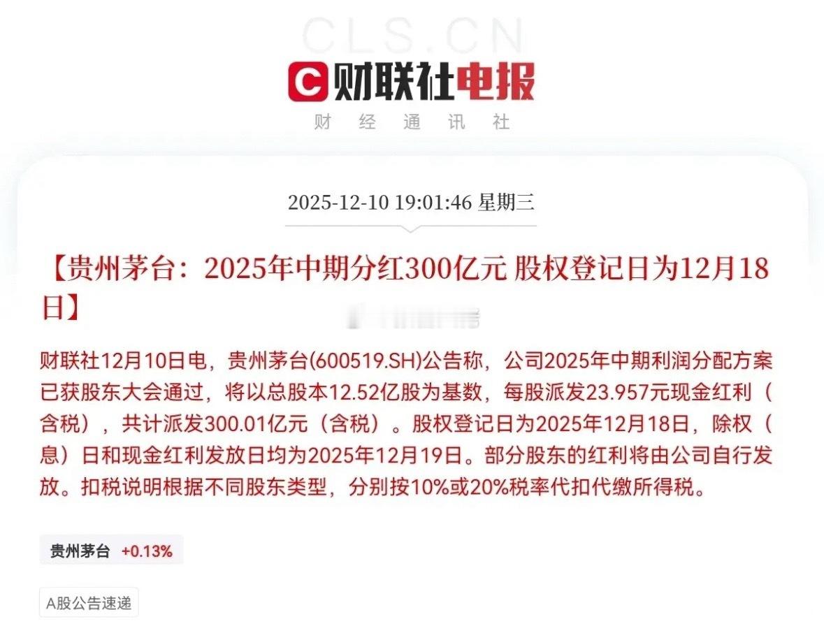 白酒明日要大涨了!白酒双雄晚间突发重磅利好消息不出意外的话,明日白酒板块要开始大反攻了,持有白酒的股民们明日有望吃顿饺子了…晚间10点40分,深夜看到白酒的一个重要信息,白酒中的大哥、二弟贵州茅台和五粮液双双发布分红公告,贵州茅台宣布,2025年中期分红于12月19日派发,分红金额300亿,五粮液宣布,2025年中期分红于12月18日派发,分红金额100亿,白酒双雄统一时间给中小股东们派发红利绝不是巧合,相信这里面释放了重要的信号,首先给市场传递信心,作为白酒的龙头企业面对不确定的环境依旧具备了强劲的盈利能力和现金管理能力,彰显了龙头企业财务的稳健性,其次同步分红也向投资者表明,龙头公司具有强大的抗压能力,基本面扎实,能够通过持续分红增强股东回报,从而增强中小股东们长期投资的信心!总之今晚贵州茅台和五粮液同步派发中期红利,对于两家公司是大利好,对于白酒板块来说也是重大利好…股民们,坐稳扶好,受此利好消息影响,预计明日贵州茅台和五粮液要高开高走收中大阳线了,白酒板块也要大反弹了!