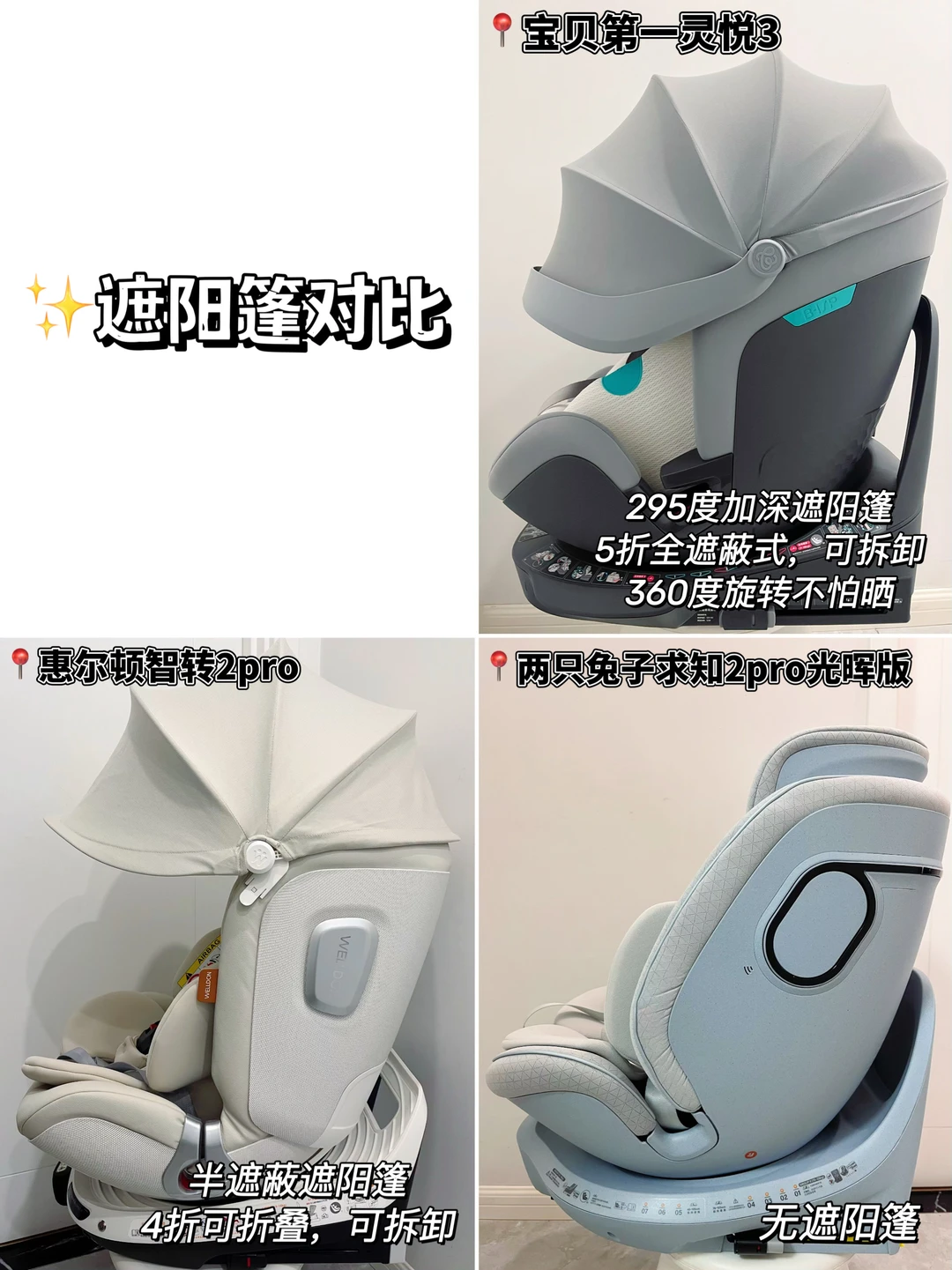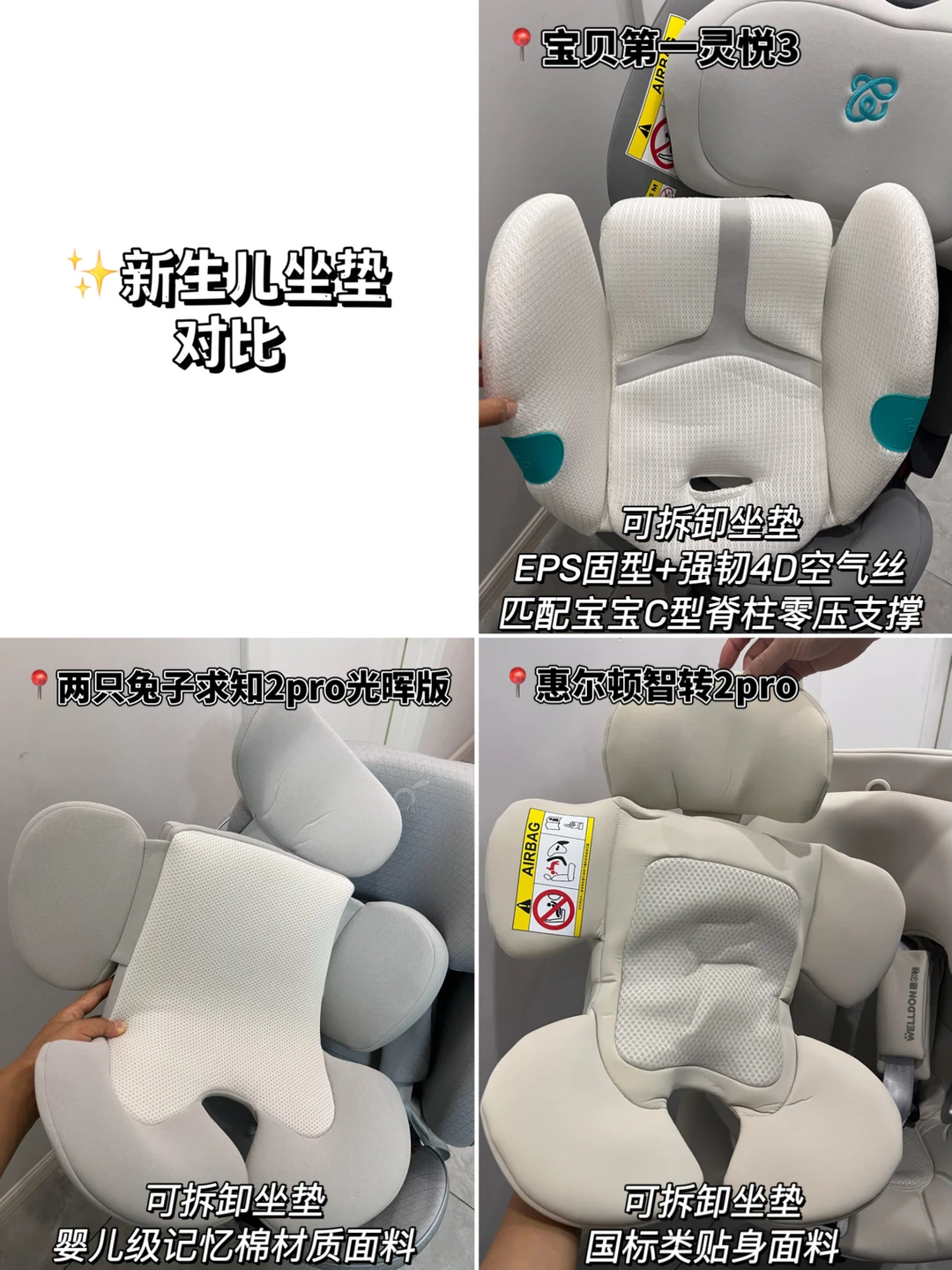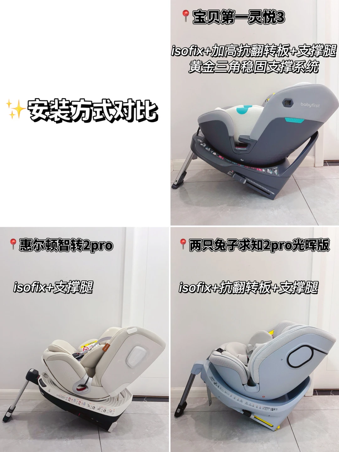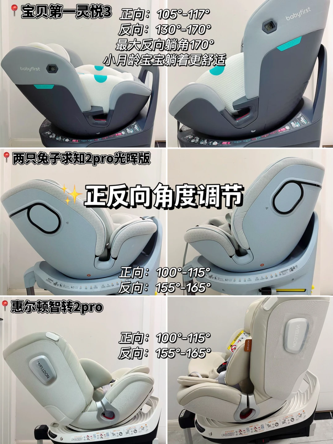 安全座椅有多重要,相信作为爸爸妈妈都知道!但是市面上安全座椅太多,选择起来真的烧脑。 趁双十一活动,我把大热的几款安全座椅都买回来了,到货后马不停蹄安装测试,给大家做一波安全座椅试用测评! ✅测评的产品: -宝贝第一灵悦3 -两只兔子求知2pro星辉版 -惠尔顿智转2pro 具体测评参数详见图片! ✅安全座椅选择关键: ⭐️保障安全 安全座椅保证安全是永远放在第一位的 ✨ 安全认证:3C是标配,还要看有没有通过R129 i-Size全年龄段认证 ✨ 侧防性能:除了isofix+抗翻转板+支撑腿确保座椅和车形成黄金三角稳固连接外,侧防也不容忽视 ⭐️乘坐舒适 安全座椅乘坐舒适性也很重要,毕竟宝宝哭闹坐不住也白搭 ✨ C型坐舱:新生儿脊椎呈C型,柔软缺乏支撑力,C型座舱贴合宝宝脊椎,有效承托保护 ✨ 坐垫材质:透气亲肤、吸湿排汗,宝宝坐上去不闷汗 ✨ 遮阳棚:大角度包裹性强的遮阳头蓬不但防晒,还可以让宝宝乘坐更有安全感 ✨ 座舱躺角:座椅躺角能达到165°-170°的,头颈落差小,不窝脖子,新生儿乘坐接近平躺,更舒适 ✨ 舒睡枕:只有少数品牌有舒睡枕设计,帮助宝宝在睡觉时头部温柔固定,避免晃动前倾 ⭐️测评对比发现,这三款安全座椅都很不错,各有各的优势,妈妈们可以根据自己的需求选择! 我最终果断留下了宝贝第一灵悦3,主要是乘坐舒适,宝宝爱坐!为了让宝宝爱坐,这款安全座椅也是把舒适感强化到了方方面面的细节中。 天然植物真丝网眼的面料,摸上去柔软舒服,透气散热也很好,再叠加双通道三档风速的座椅通风设计,宝宝坐再久也不会热出一背汗!之前带娃出去,总会被太阳晒到,眼睛都睁不开,这款安全座椅295°全罩式遮阳头蓬,轻轻松松化解晒黑晒眼睛的问题。结合EPS+4D空气纤维的护脊坐垫,宝宝就像躺在妈妈怀抱;舒睡枕+170°大躺角头托,舒睡不窝脖子不颠簸,新生儿宝宝乘坐也毫无压力! 安全性方面我同样在意,品牌做到了行业最高i-Size认证,并且0-7岁全岁段通过,同规格的其他品牌真的很难做到,这也是令我安心选择的最好理由!