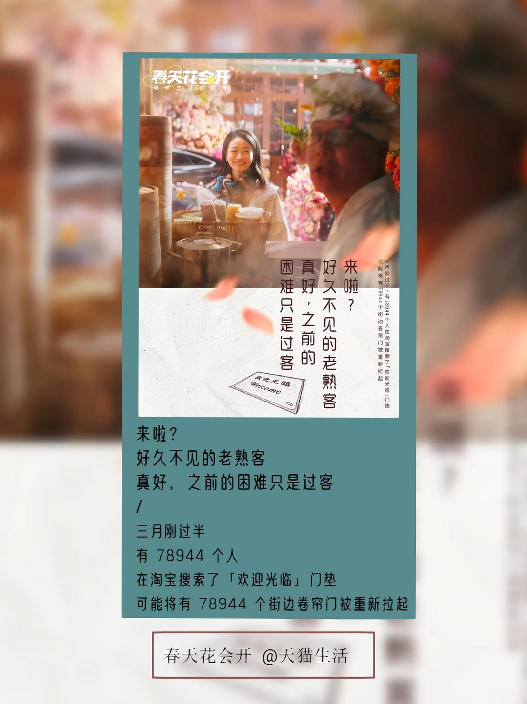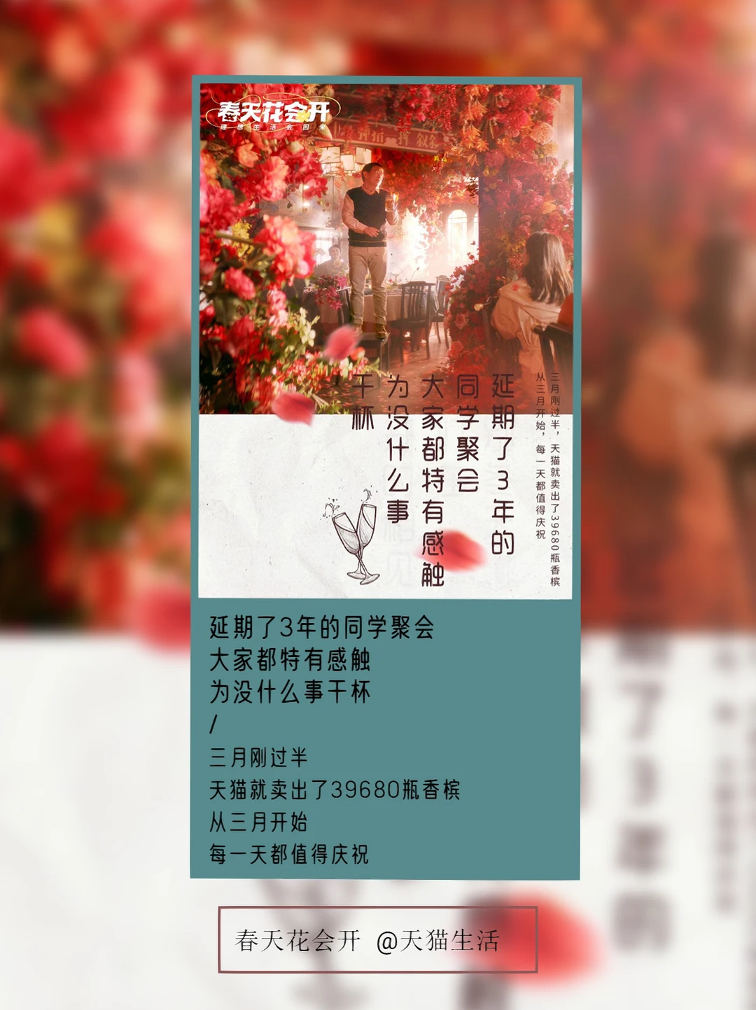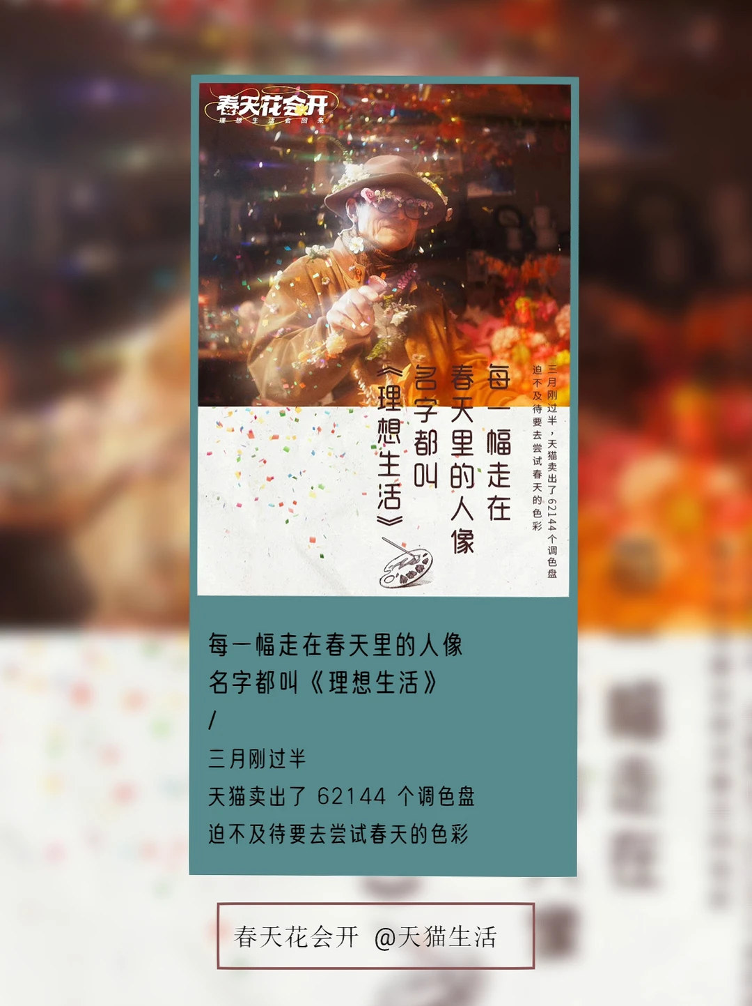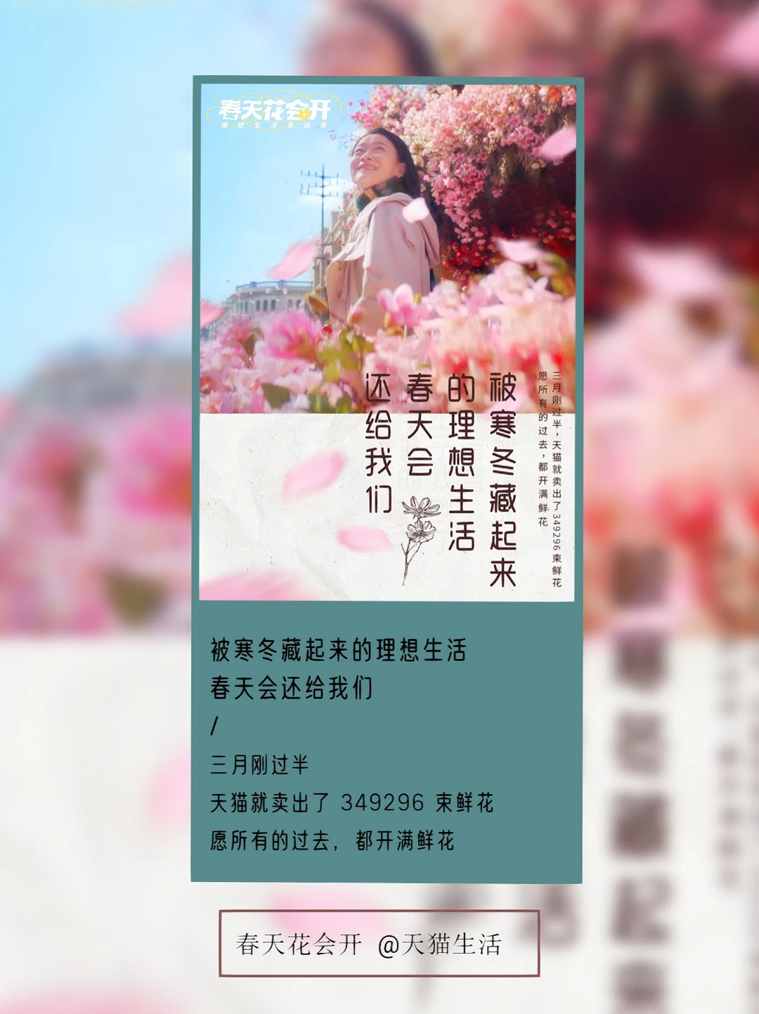 今天是春分,天猫生活有一组特别的数据报告[萌萌哒R] 2023年,走进yiqing后的第一个春天,人们久别重逢,去用力拥抱这迟到3年的春景🍃 天猫生活是懂得洞察人心的,通过统计3 月 1 日—16 日半个月,在其平台上销售出去的鲜花、调色盘、双肩包等日常物品的被搜索次数,走心的文案之下,是为用户创造出的情绪价值❤️ 这些从天猫上售出的小物品,承载了人们希望理想生活回归的愿景,对生活重回正轨的欣喜~ 春天花会开,理想生活已回来🌸 这组文案你觉得可以打多少分?