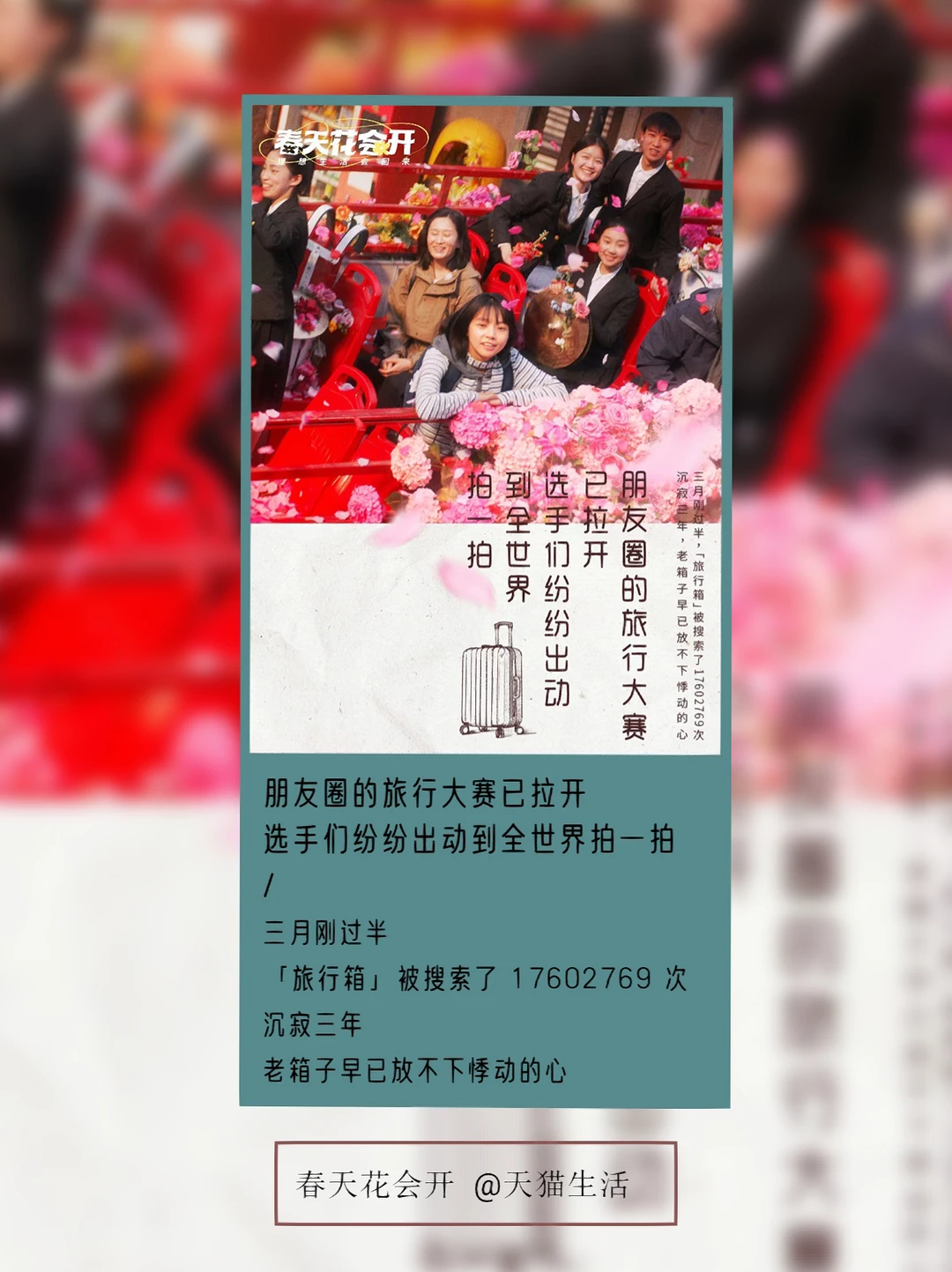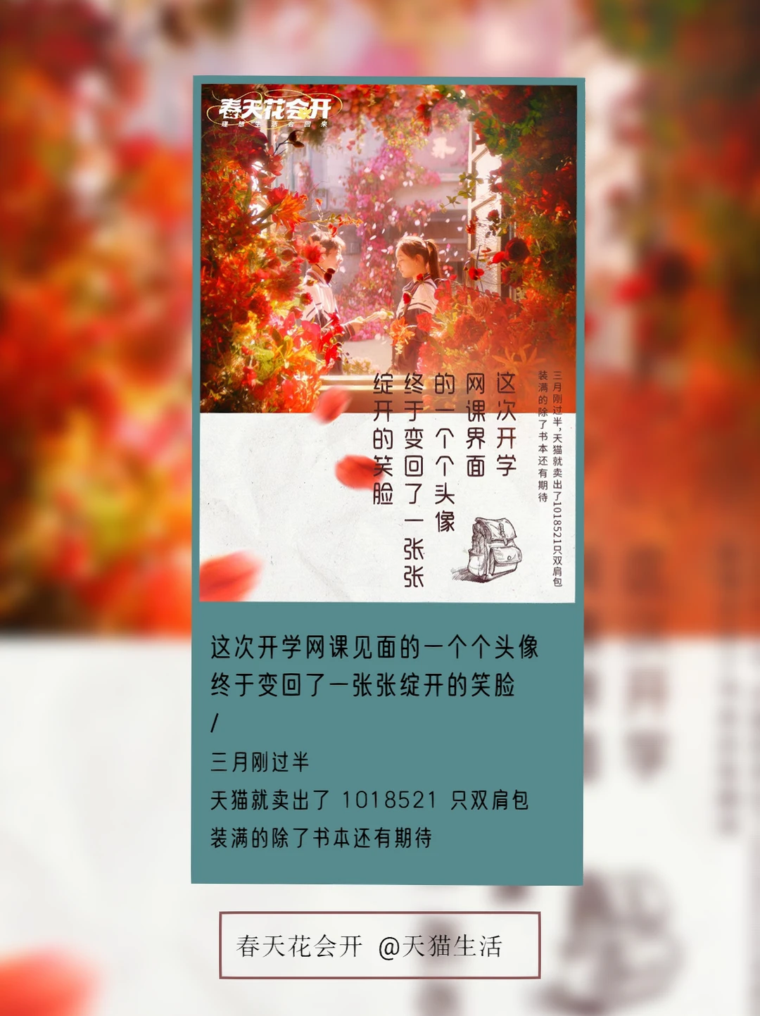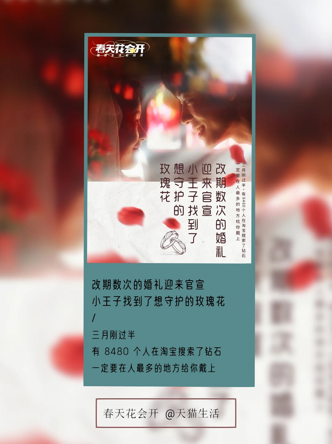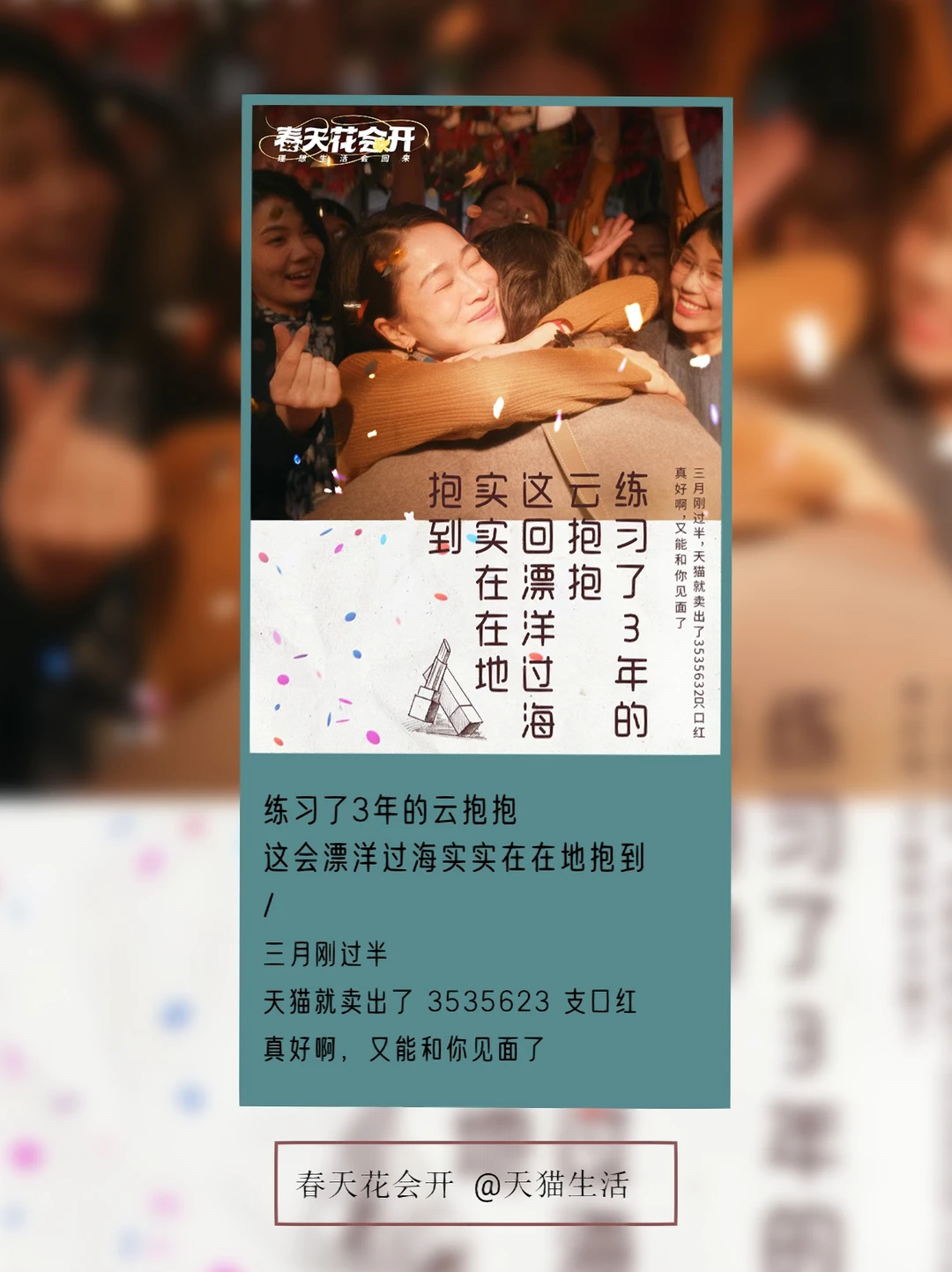 今天是春分,天猫生活有一组特别的数据报告[萌萌哒R] 2023年,走进yiqing后的第一个春天,人们久别重逢,去用力拥抱这迟到3年的春景🍃 天猫生活是懂得洞察人心的,通过统计3 月 1 日—16 日半个月,在其平台上销售出去的鲜花、调色盘、双肩包等日常物品的被搜索次数,走心的文案之下,是为用户创造出的情绪价值❤️ 这些从天猫上售出的小物品,承载了人们希望理想生活回归的愿景,对生活重回正轨的欣喜~ 春天花会开,理想生活已回来🌸 这组文案你觉得可以打多少分?