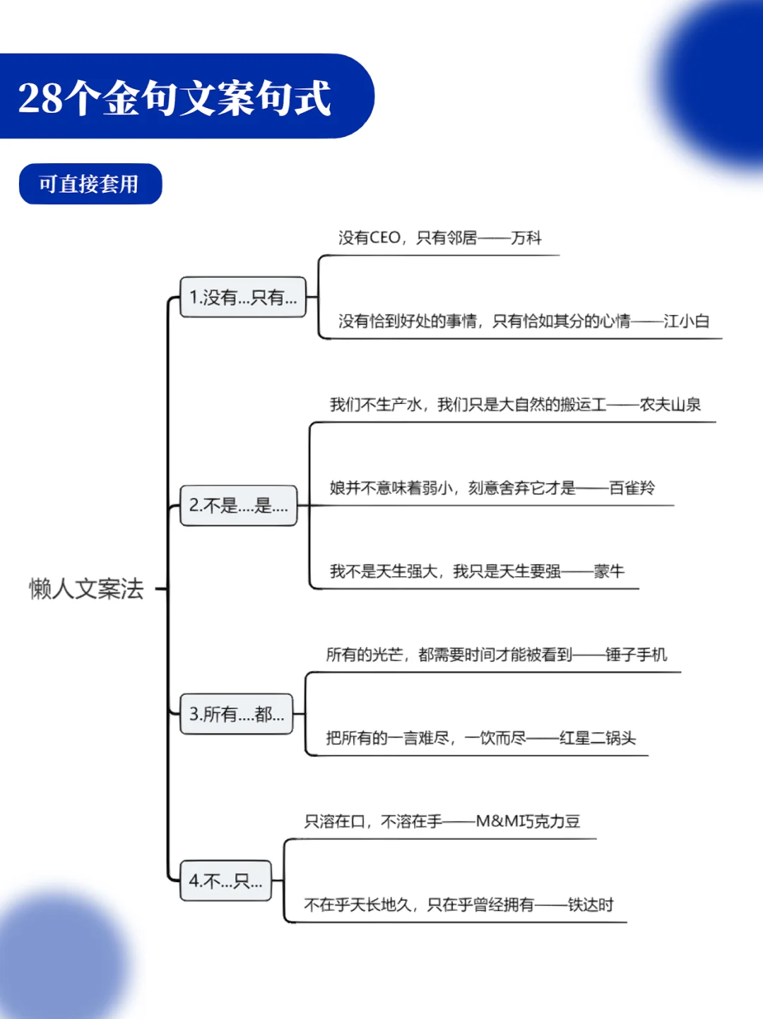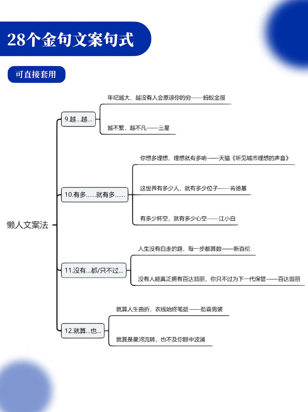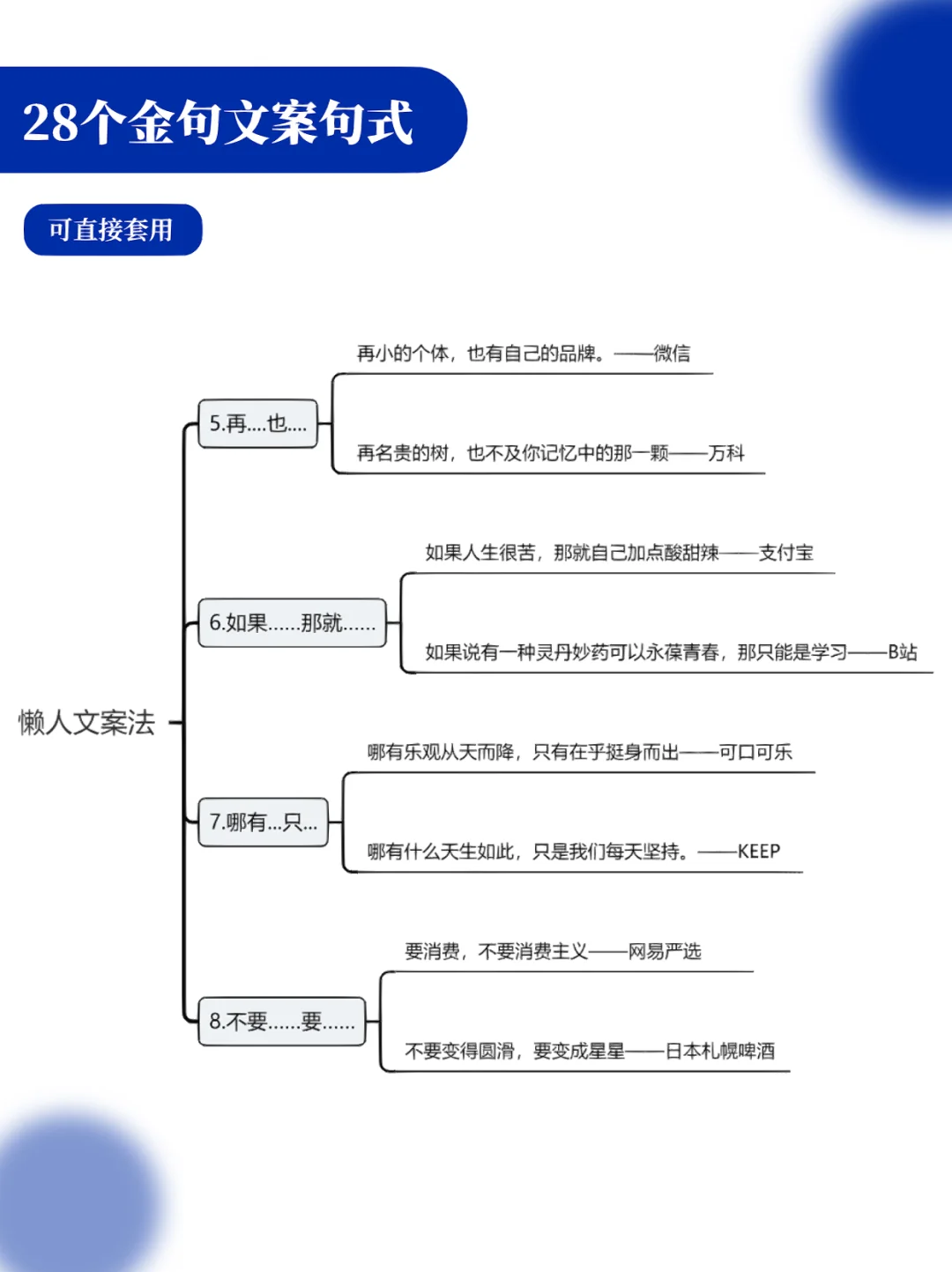 很多人在学习写文案的初期,缺乏创作灵感,头脑一片空白…… 观察很多经典广告发现,很多句式在结构上是一样的,掌握好这条规律,其实写文案并不难,仿造万能句式,直接套用,你也能写出朗朗上口的文案出来[赞R] 今天给宝子们分享28个经典广告句式,附带案例✅ 有时间多读、多写、多练习,懒人文案法,让文案如此简单❤️