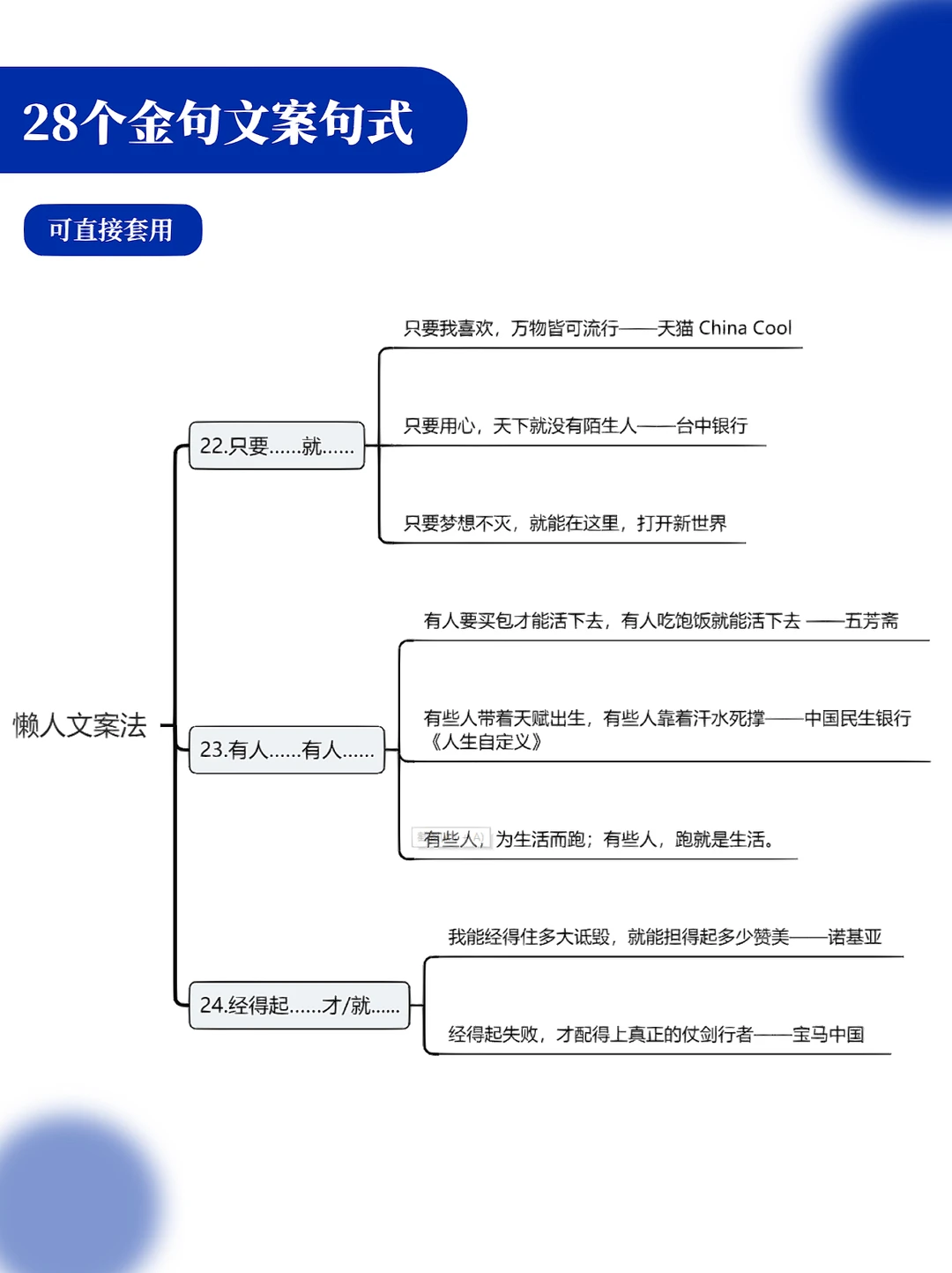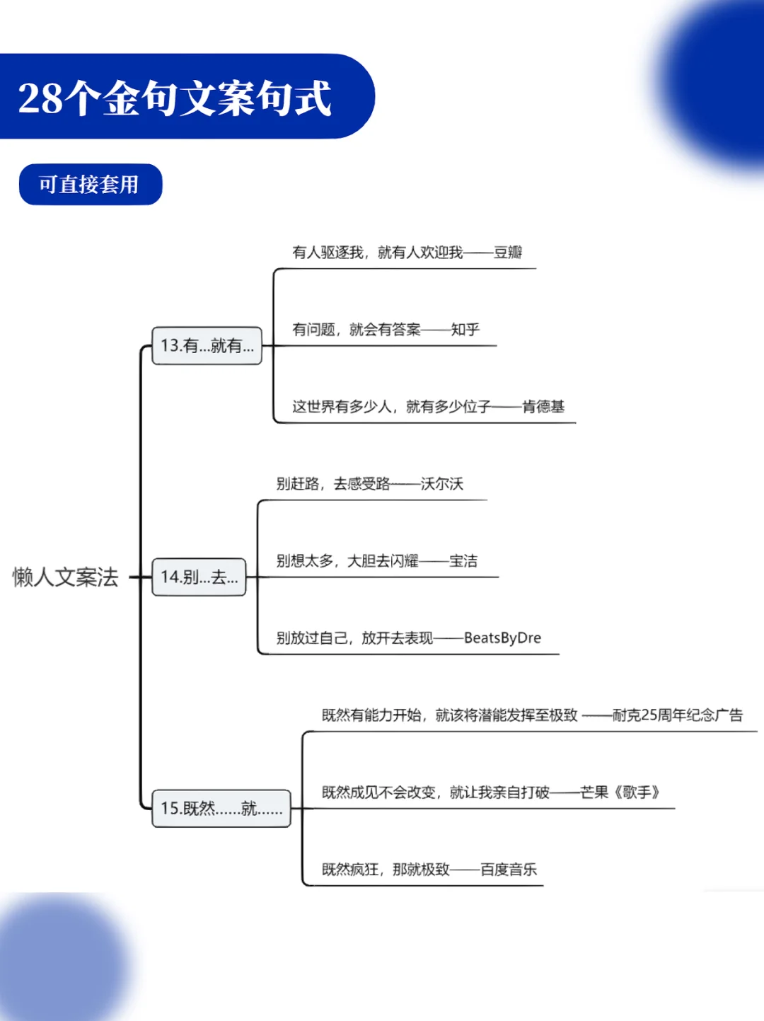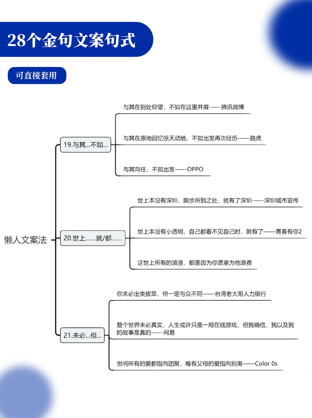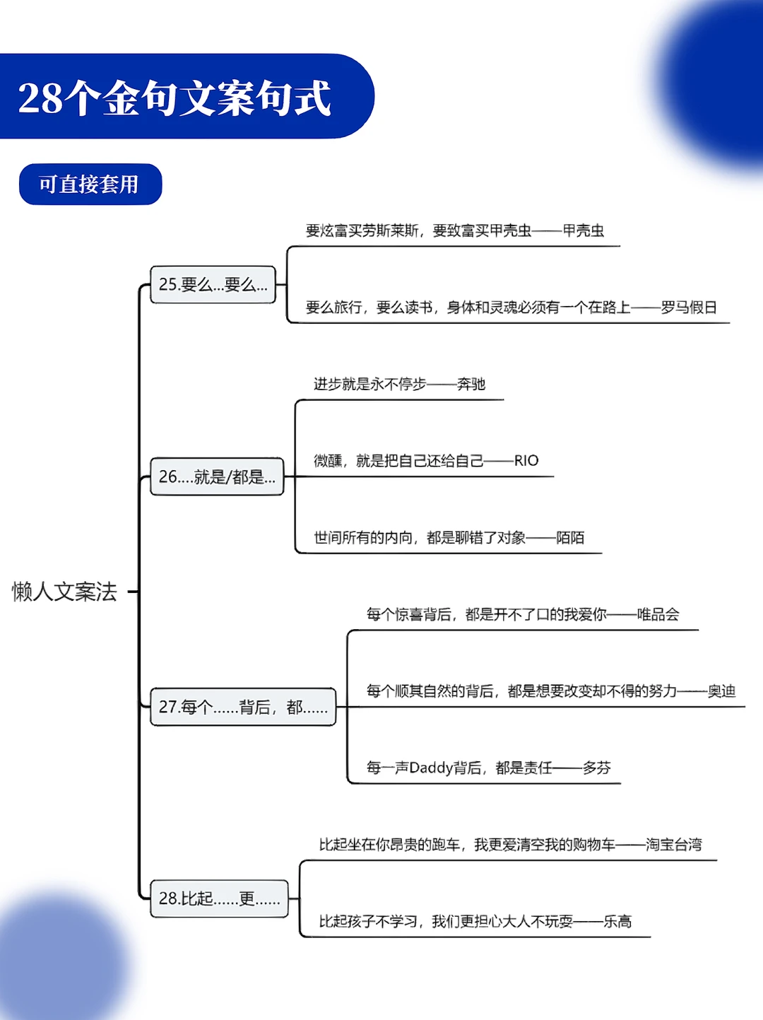 很多人在学习写文案的初期,缺乏创作灵感,头脑一片空白…… 观察很多经典广告发现,很多句式在结构上是一样的,掌握好这条规律,其实写文案并不难,仿造万能句式,直接套用,你也能写出朗朗上口的文案出来[赞R] 今天给宝子们分享28个经典广告句式,附带案例✅ 有时间多读、多写、多练习,懒人文案法,让文案如此简单❤️