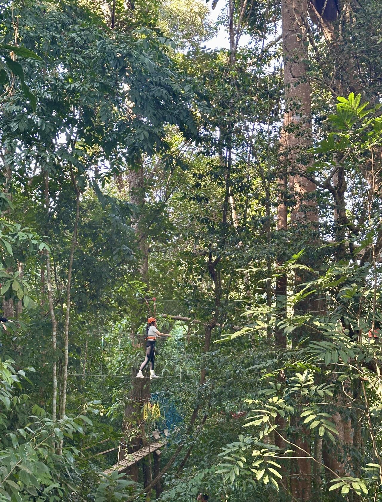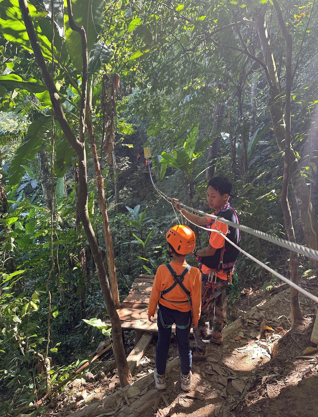 来西双版纳!!雨林徒步究竟值不值得去? 📍西双版纳 去野·雨林徒步(纳板河店) 来西双版纳旅行头半个月!!就在小红书做攻略了!! 徒步路线几百条真的好难选! 过年又人多堵车!担心踩雷! 最后选了个最贵的!!不在基诺山! 是坐快艇去的小团!! 就不用专门去傣族园坐快艇了!!算下来400多一个人也不贵!! 快艇也要三百来块钱!! · 🔍去野雨林徒步 需要提前一天确定人数!!人数不够会帮拼! 8个人独立成团! 不用买雨靴也不用带什么吃的!!这点我超爱‼️ 2月的天气也好没有蚊虫!! · 我们的是个女向导 小白兔!!就是那座山哈尼寨子的村民 热情开朗的性格真的奈斯 2条路线可以选,累or不累的 中午会在营地休息 吃饭!! 也都是村民背上来 现煮汤和烤肉 味道非常好吃!!包烧芭蕉花、烤鸡烤五花还有各种小玉米 品种和口味比告庄那些孔雀手抓饭好吃太多 应该是食材好新鲜吧! · 玩的项目也多!三四十个 攀爬绞杀榕 高空秋千 树降和各种飞拉达 好刺激!!但是克服了还是忍不住再来一次!!