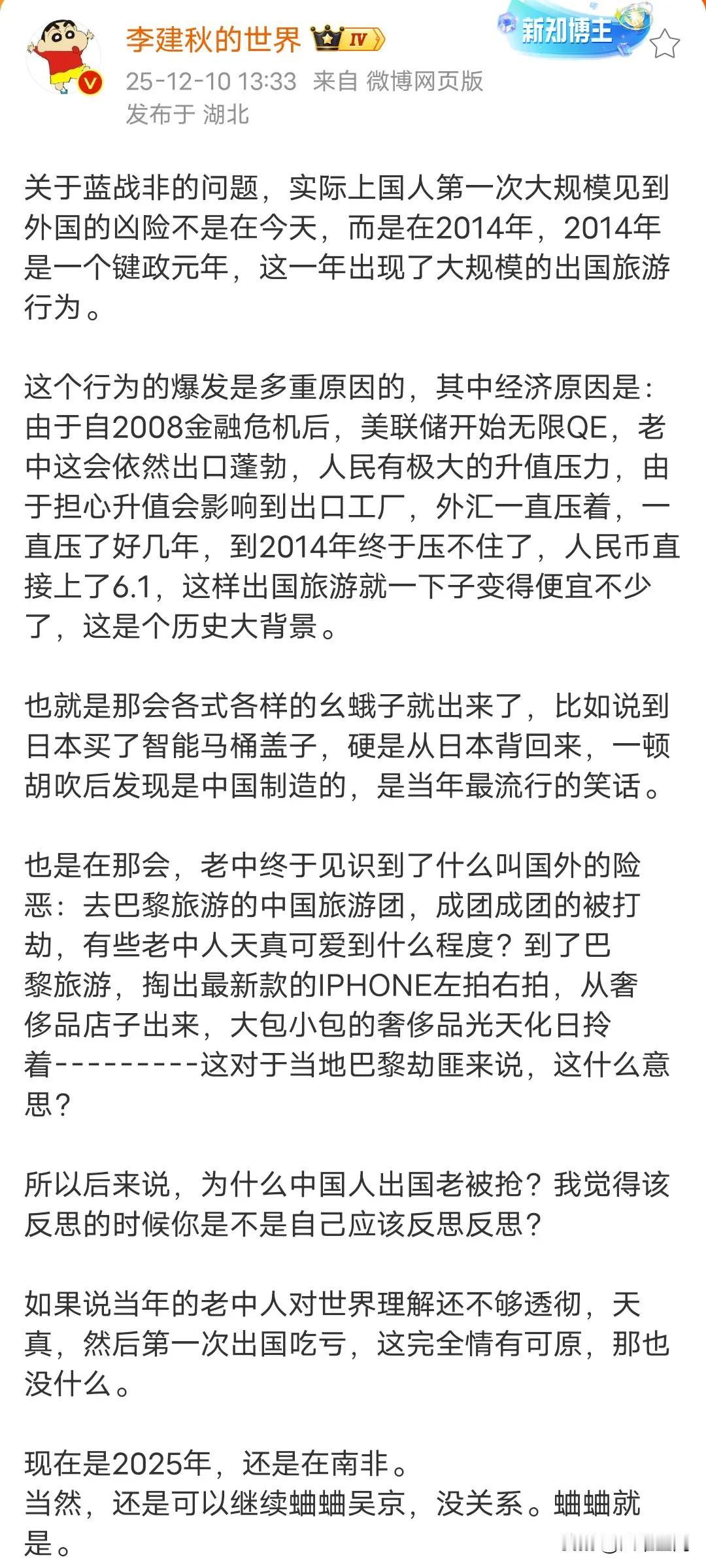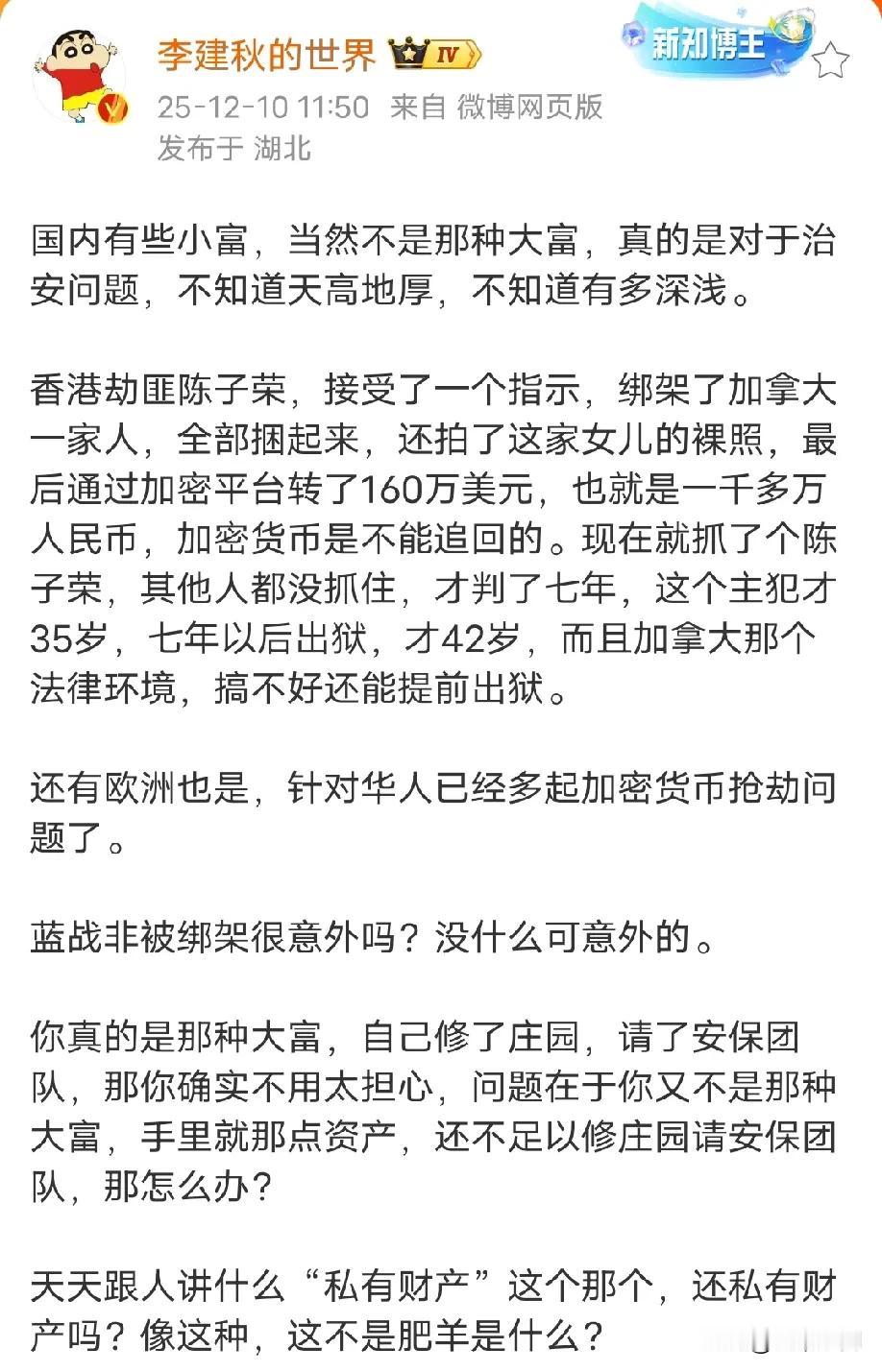 有大V这样谈蓝战非,大V举例甲亢哥虽然表面上看疯癫,但是实际上内心有谱,全世界旅游直播,但是保镖安排得明明白白,而蓝某更像是温室中养出来的巨婴,这么大的网红,在国外完全有没有一点安全意识,也不是请不起保镖! 其实说得太对了,我们国内的很多人总是把国外想象得更国内一样,以为国内的治安好是理所应当的,然后完全没有了那种防人之心不可无的戒备心,所以我们看到很多去欧洲旅游的中国游客,整个团的人被偷东西,甚至还有明星去欧洲录节目,被各种偷抢,就这些活生生的例子摆在我们面前,国内还是有一群公知在吹国外的月亮比较圆,在吹国外那些虚无缥缈的民主自由,你能想象西方很多国家晚上九点十点后,是不能出门的,因为治安不好,这叫什么自由,我们这边凌晨,一个女孩出门都没事,就这样好得治安,前阵子还有一个女导演在抱怨社会无法容忍女性夜跑,这就是巨婴中的巨婴,然后它们把国外想得多么美好!