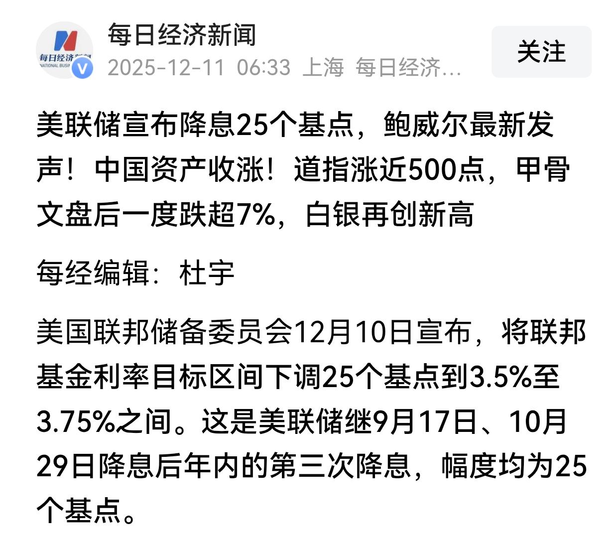 美联储降息25个基点。美股涨。大A今天会继续升势吗? 素材及图片来自网络。 美联储利率决定