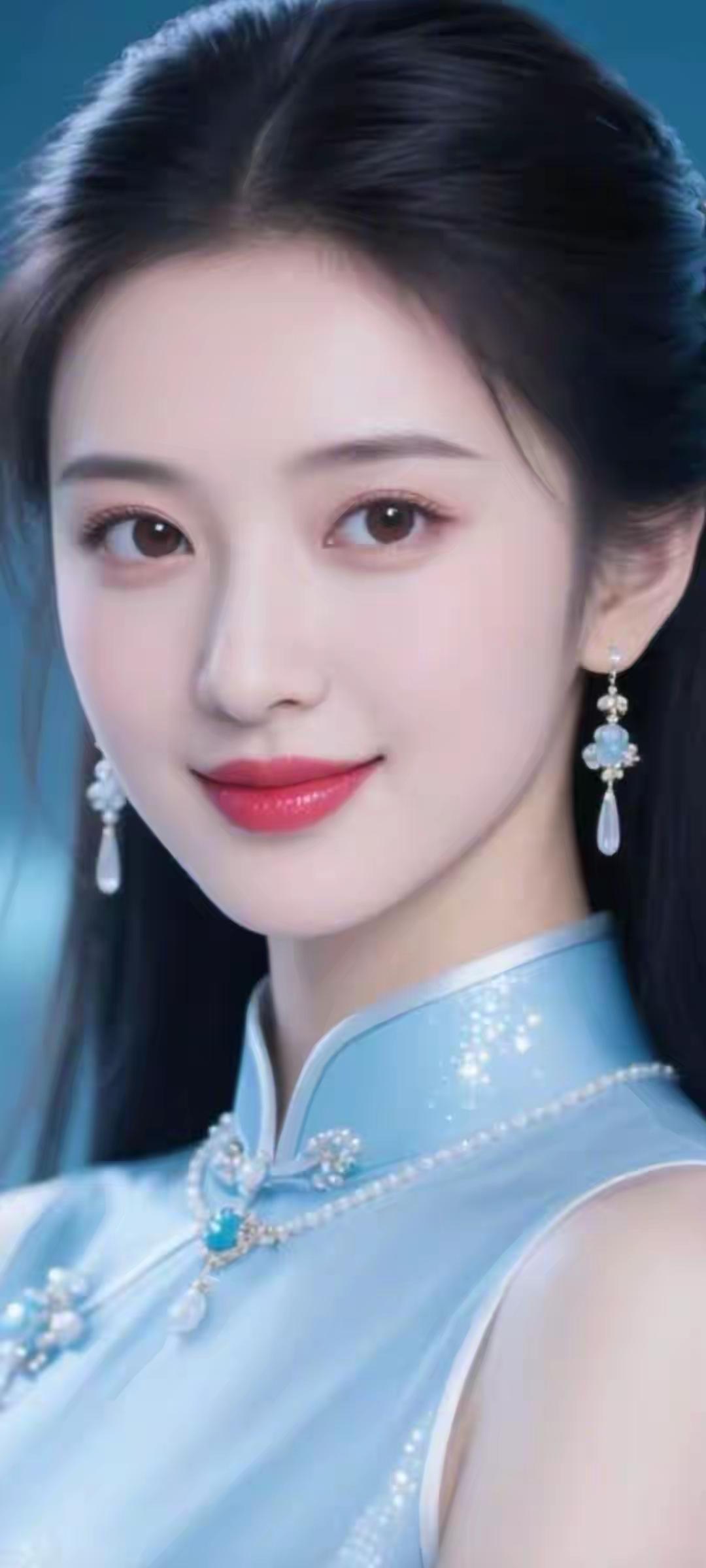 蓝色旗袍,珠宝闪耀,甜美微笑,美丽加芬