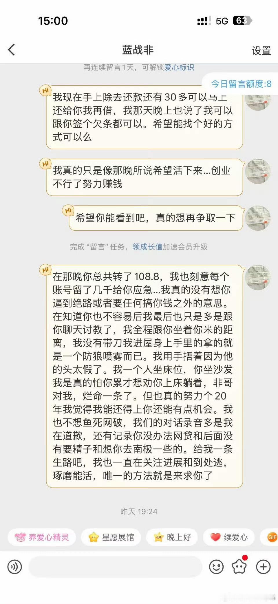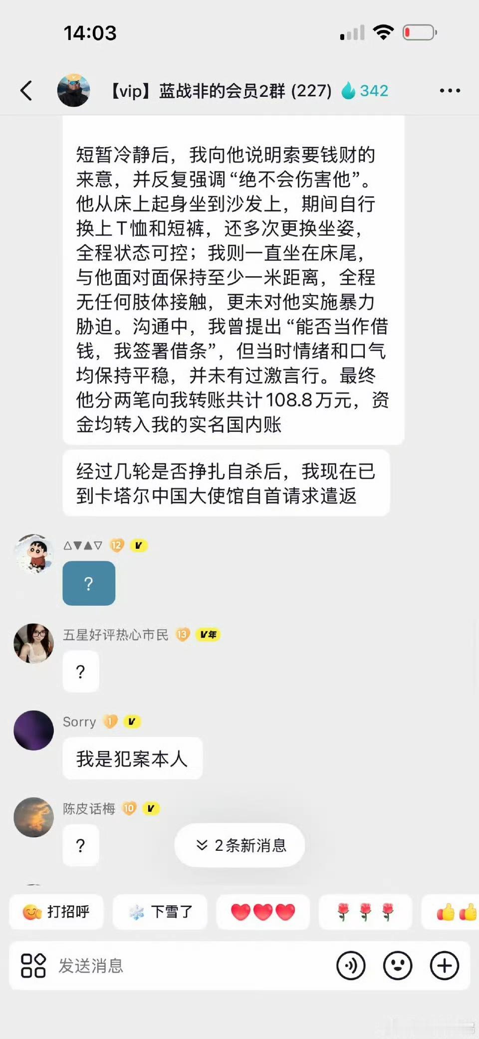蓝战非被绑架案有了意想不到的进展。他粉丝群里的粉丝突然自曝绑匪身份,亮出了跟蓝战非的私信内容,并且在粉丝群里讲述绑架过程,并称现在已经回国自首。绑匪还亮出了转账记录,总共108.8万元……从这些内容看,是有一定可信度的,毕竟连转账记录都有,真是难以置信。