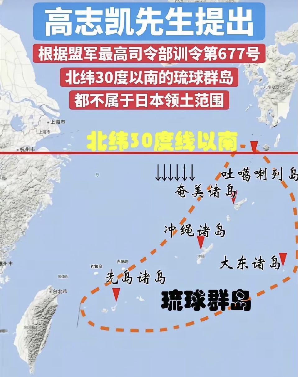 高志凯教授又给日本画线了,必须龟缩回去北纬30度以北! 第一,1945年日本无条件投降后,根据盟军最高司令部训令第677号,北纬30度以南的琉球群岛都不属于日本领土范围。 第二,《波斯坦公告》明确规定日本的领土只包括日本九州北海道四岛,其他的地方均为非法所得,不属于日本固有领土。 若高教授不提,估计很多人遗忘这个文件了,让人觉得琉球是日本的,搞得日本军国主义战败了还能得到便宜,这是对日本军国主义的绥靖,后患无穷,不行! 这条线很重要!将来台岛收复后琉球群岛就是同日本国的缓冲区…… 高教授所言极是!合法合理!支持!从经典的“高志凯线”,到菲律宾的“东经118多线”,再到现在给日本画的线,都很绝! 高教授就是我们需要的大喇叭,文科生的楷模!向高教授致敬,期待划高教授第四线!