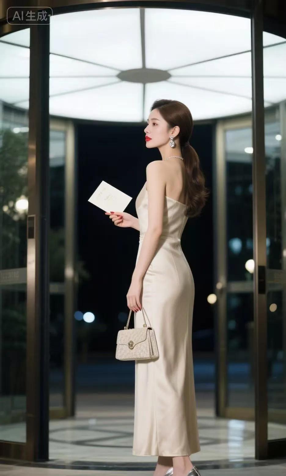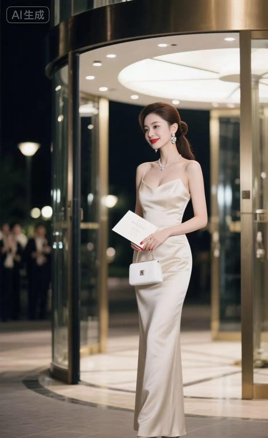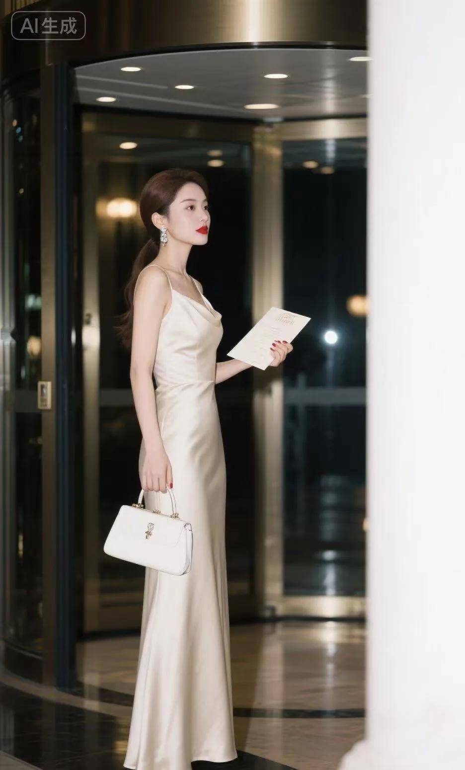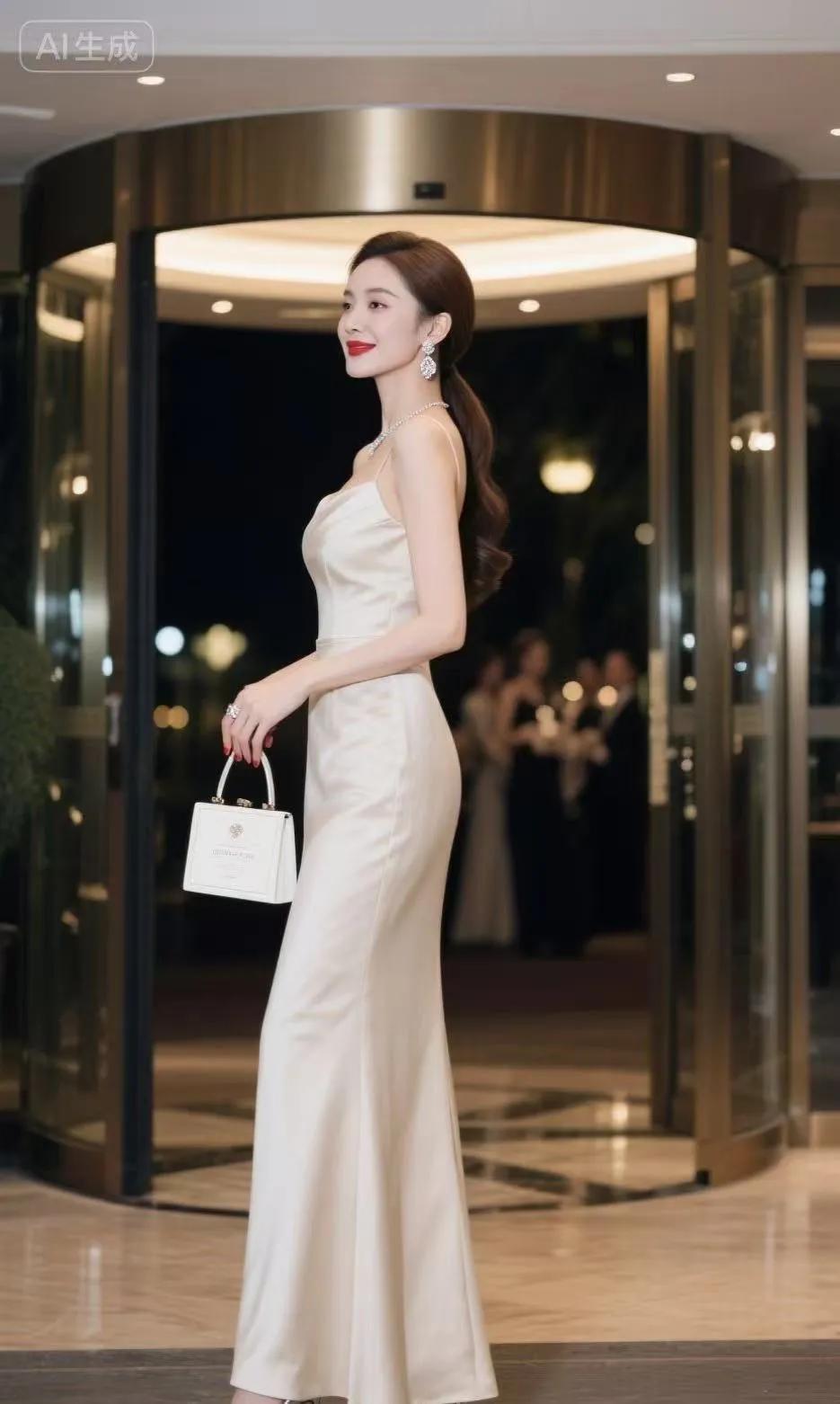 城市天际线下的温柔侧颜,轻纱飘逸,静谧如诗。