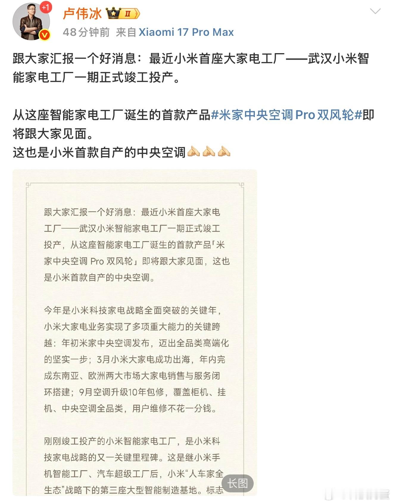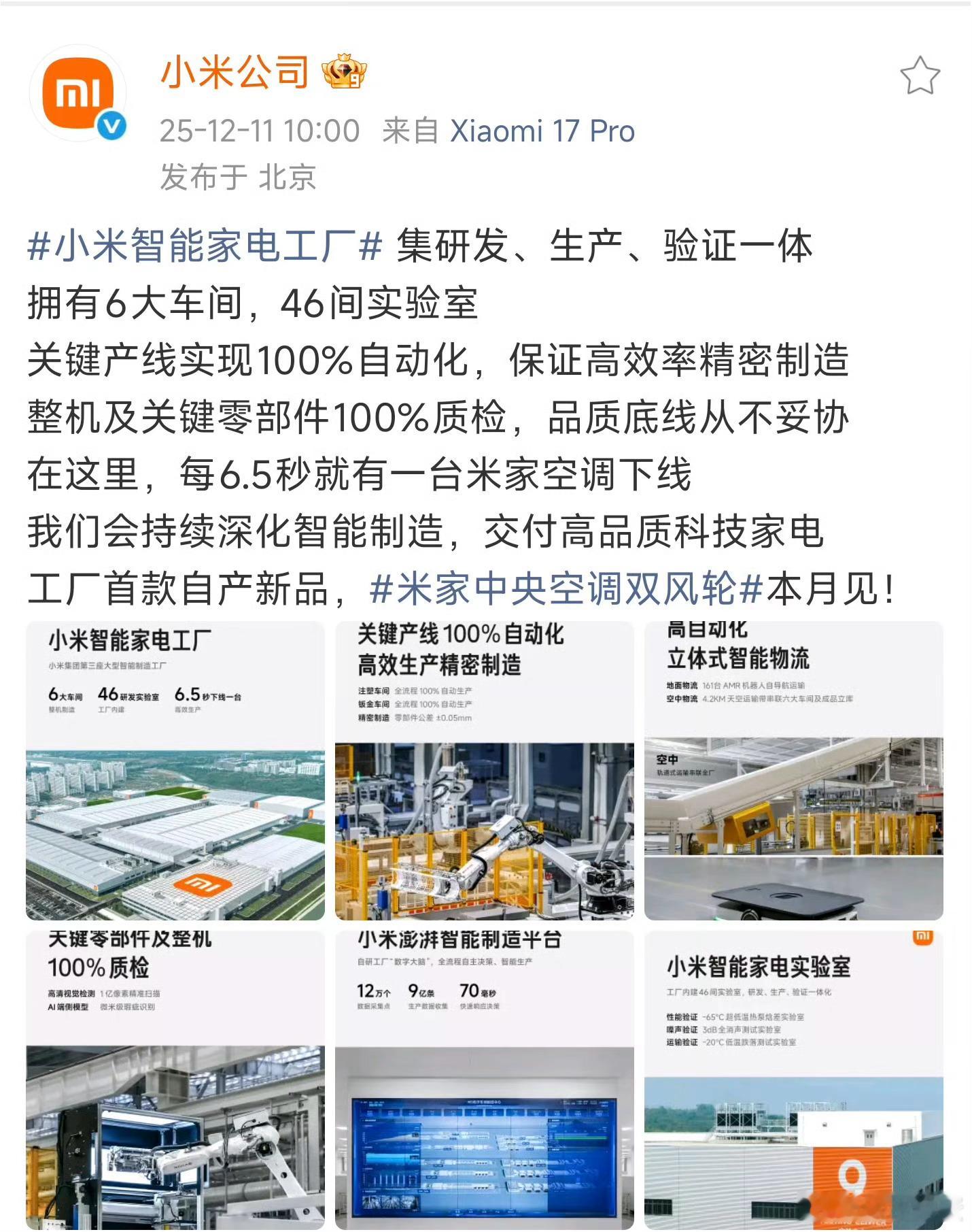 卢伟冰宣布小米将发布自产中央空调小米自产中央空调,狗蛋其实也不意外,之前在家安了巨省电系列空调,用起来的确不错。再说小米又不是只靠生态链贴牌的方案整合商,而是正儿八经地要成为握有工厂和核心制造能力的重装选手,最硬的证明就是自建工厂和敢喊十年包修。从技术最复杂、门槛最高的中央空调开始自研自产,直接把做手机和汽车那套严苛的智能制造标准、精密工艺和自动化产线,搬到了家电生产线上。敢给全系空调提供十年保修,这绝对是对自家品控和供应链有绝对底气才敢做的承诺。所以当大家还在质疑它“会不会做家电”时,它已经用工厂和十年保修,回答了“怎么做”和“能做多好”的问题。这条路一旦跑通,它对传统家电行业的冲击,会比当初智能手机行业来得更彻底。