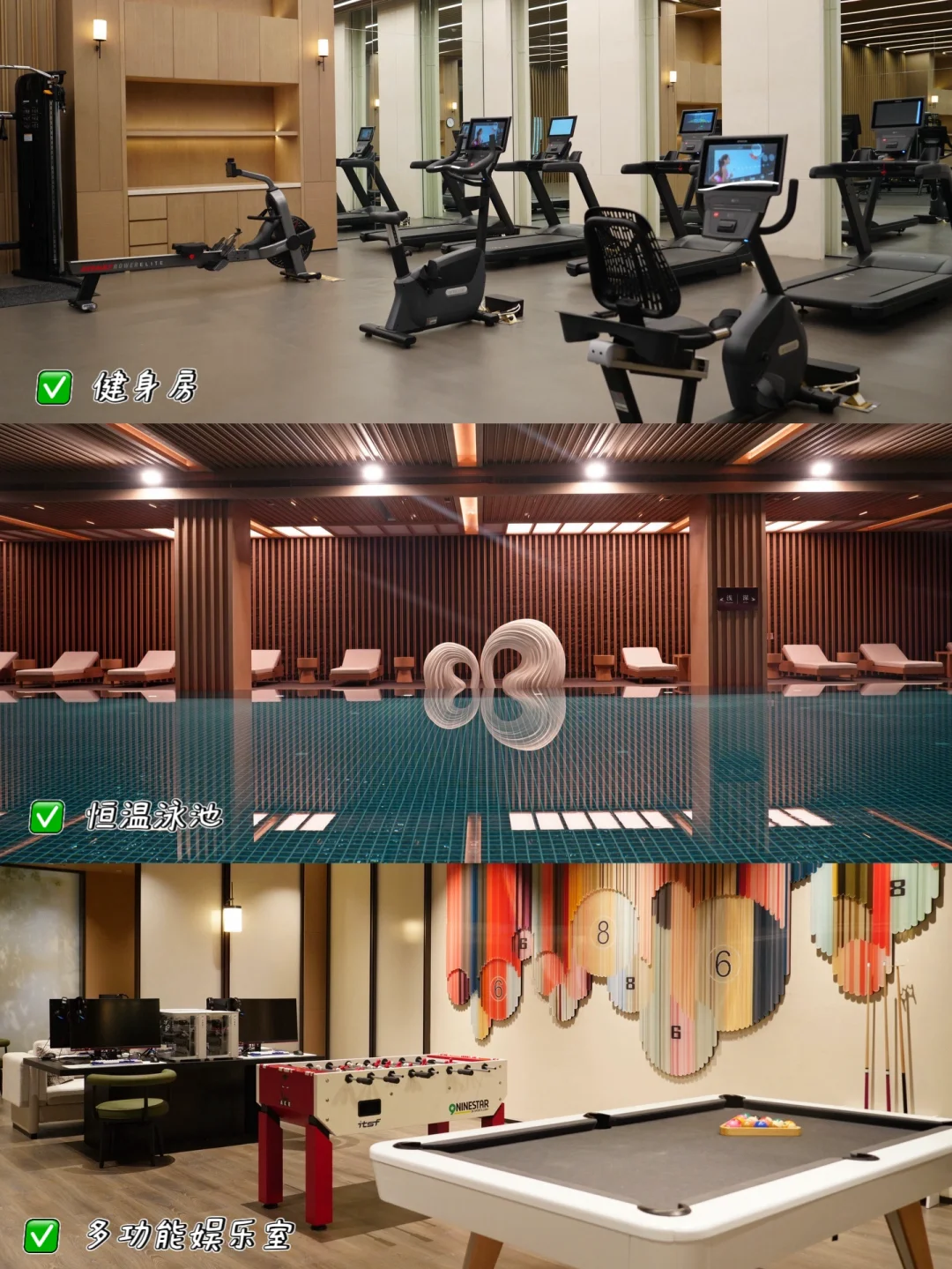 健身房、恒温泳池、棋牌电竞也全都有,大人偷闲充电也很方便。傍晚步行到酒店附近的未来谷园区,大草坪上遛狗散步,惬意得很!
