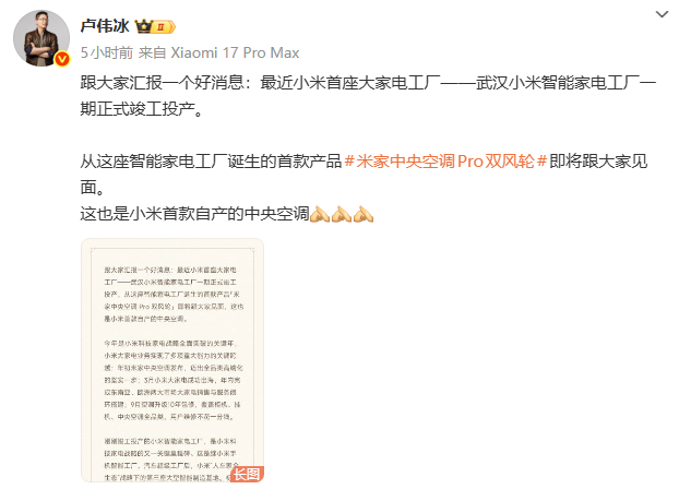 小米首座大家电工厂——武汉小米智能家电工厂一期正式竣工投产即将发布的首款自产的中央空调就是从这诞生,不知道工厂有没有机会开放参观