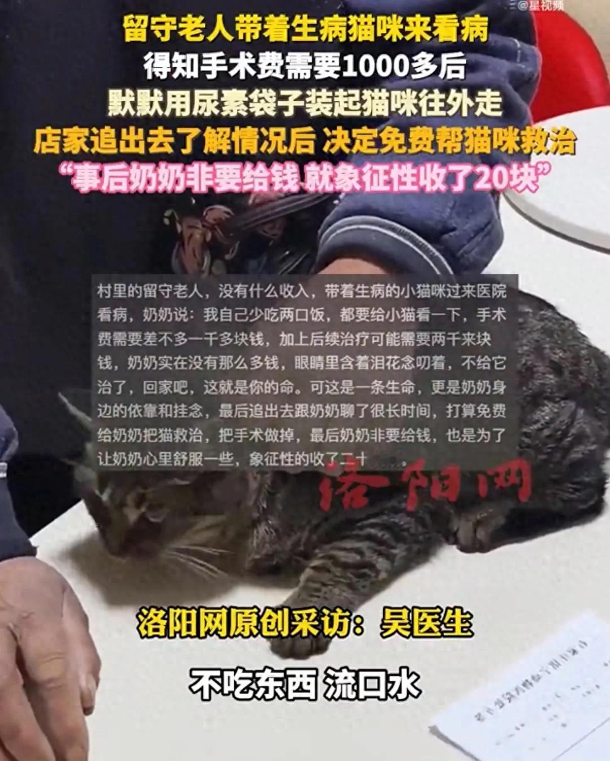 留守老人带猫咪看病得知手术费1000多后含泪离开,店家追出免费救治,“事后奶奶非要给钱,象征性收了20元” 在这个快节奏的社会里,总有一些温暖的瞬间,让人心头一暖。今天的故事,关于一位留守老人和她心爱的猫咪,也许没有轰轰烈烈的剧情,但那份真情实感,却足以让人动容。 老人带着猫咪走进宠物店,眼神中满是担忧和无助。医生告诉她,猫咪需要手术,费用大约在一千多元。这个数字,对于很多普通家庭来说,可能就像天上的星星那么遥不可及。老人听完后,眼眶微微泛红,含泪离开了店铺。她的心在挣扎:这是救命的手术,但又那么昂贵,她该怎么办? 店家看到老人那一刻的无助,心里也不是滋味。于是,店主追出门外,坚定地说:“不用担心,我们免费帮猫咪做手术。”这份善意,让人感受到社会的温暖。老人听到后,眼眶更加湿润,嘴角微微颤抖,非要拿出几块钱表示感谢。店主笑着摇摇头:“不用了,救猫咪是应该的。”最终,老人象征性地拿出了20元,表达心意。 这个故事告诉我们,善良从来都不是一件小事。或许一份免费救治、一句温暖的话语,就能在别人最需要的时候,点亮一盏灯。老人或许没有太多金钱,但她的那份感激和信任,却胜过千言万语。 更令人感慨的是,社会上有太多像这位老人一样的普通人,他们用最质朴的方式,传递着爱与温暖。而我们每个人,也许都可以在日常生活中,成为那一束光。无论是为流浪动物提供一点帮助,还是在他人困难时伸出援手,都能让这个世界变得更加温馨。 这件事,虽然只是生活中的一幕,但它折射出的是人性中最善良、最真诚的部分。希望每个看到这个故事的人,都能被这份善意感染,也许下一次,是你我伸出援手的那一刻。毕竟,温暖,是这个世界上最坚不可摧的力量。