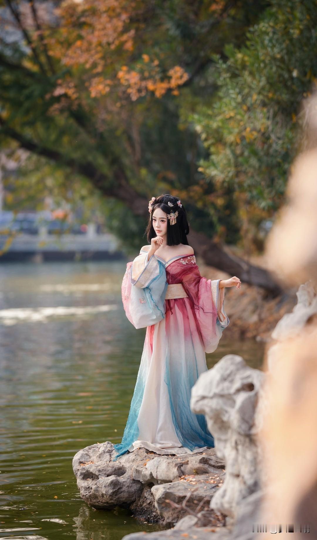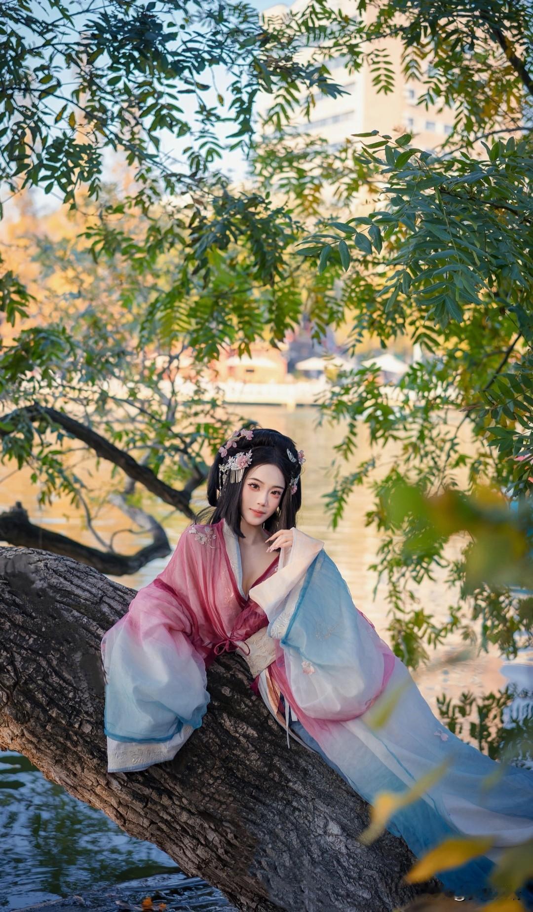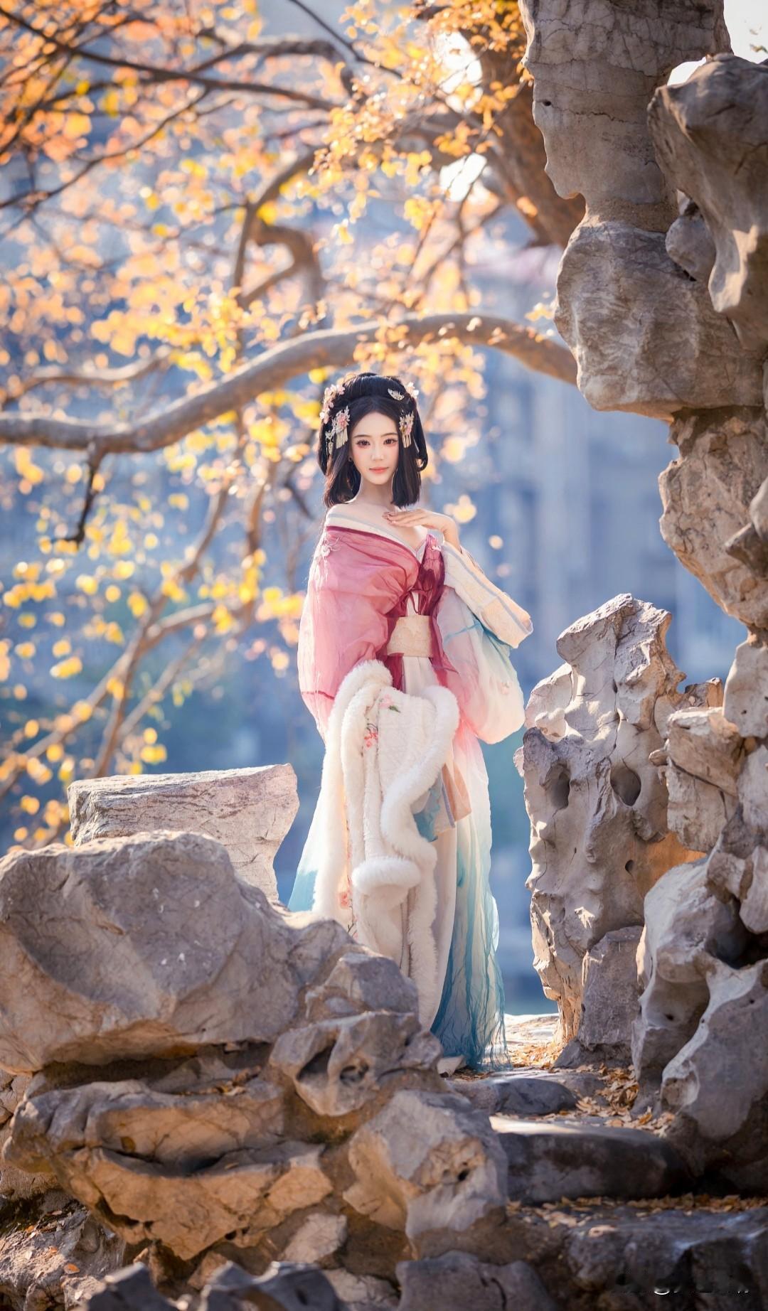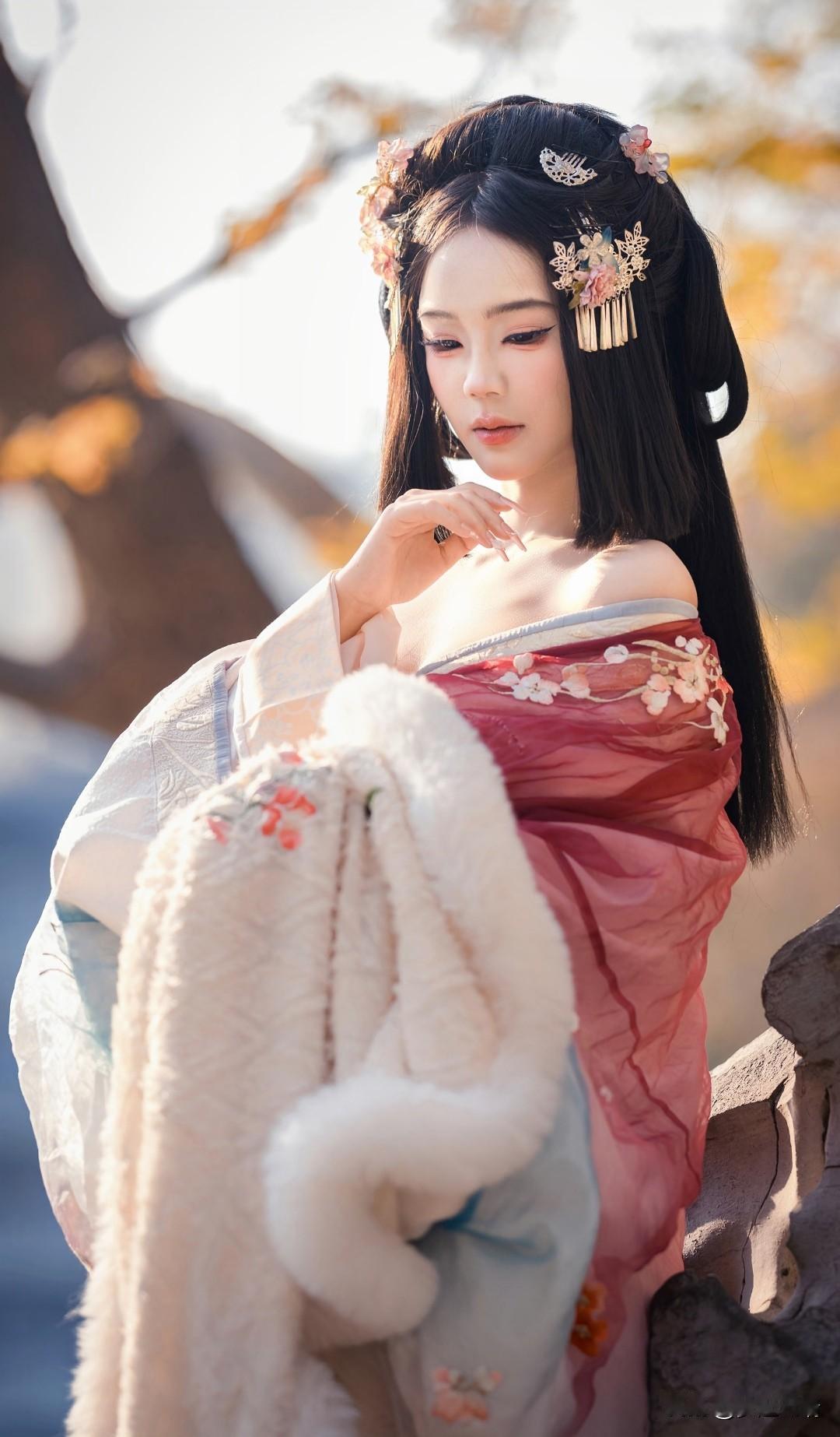 秋日仙境中的古典美人,红衣飘逸,花枝招展。