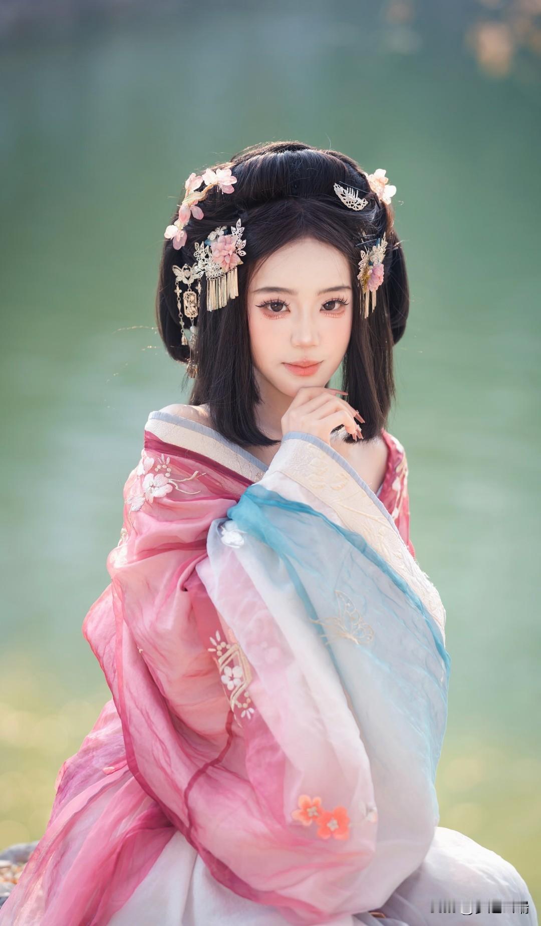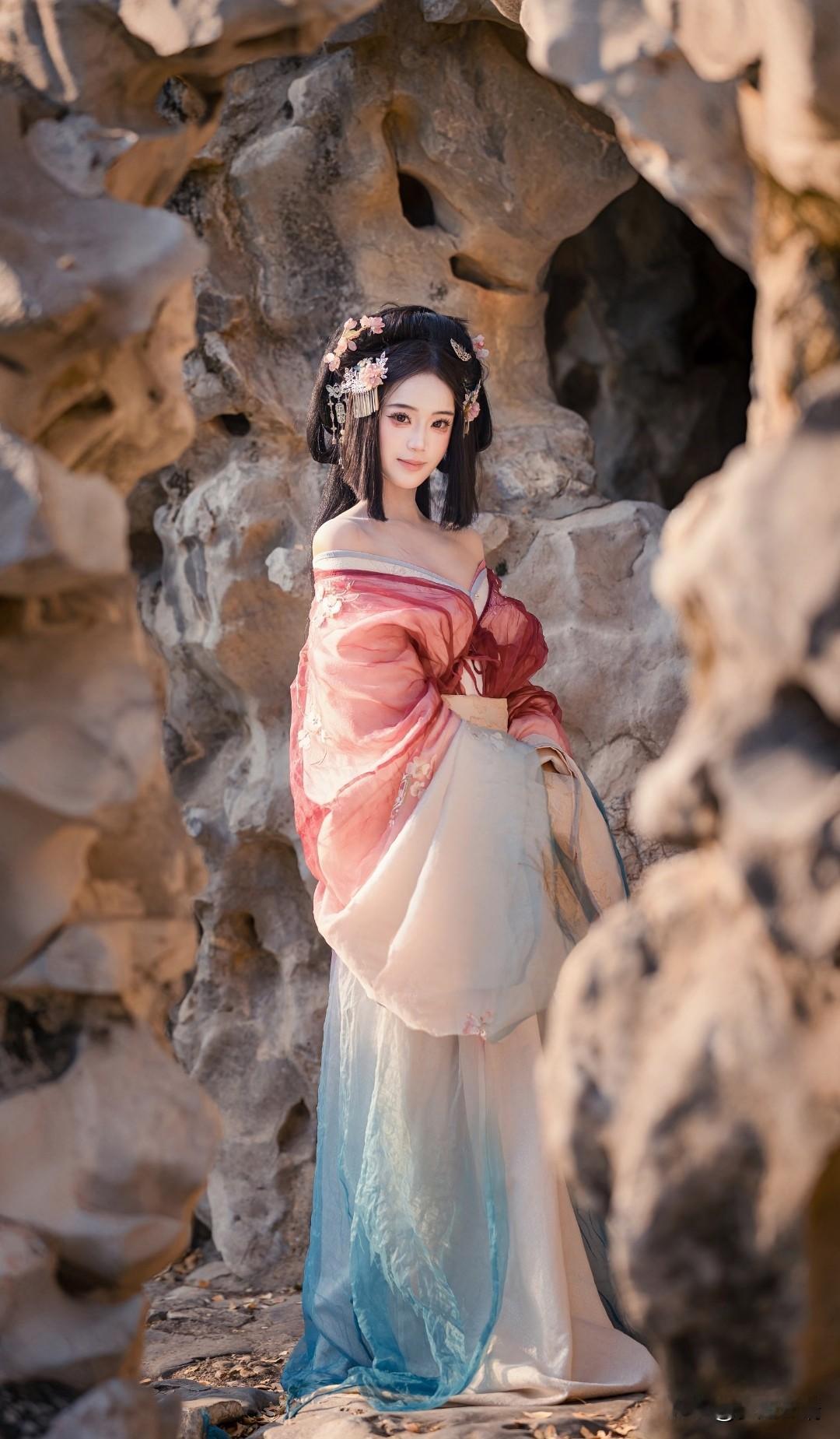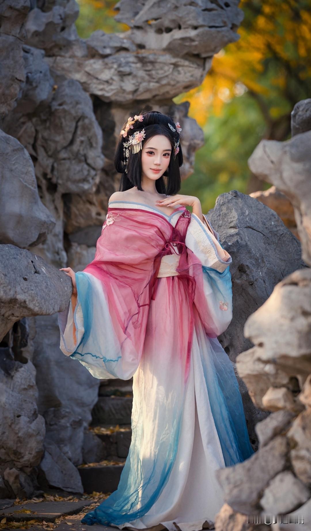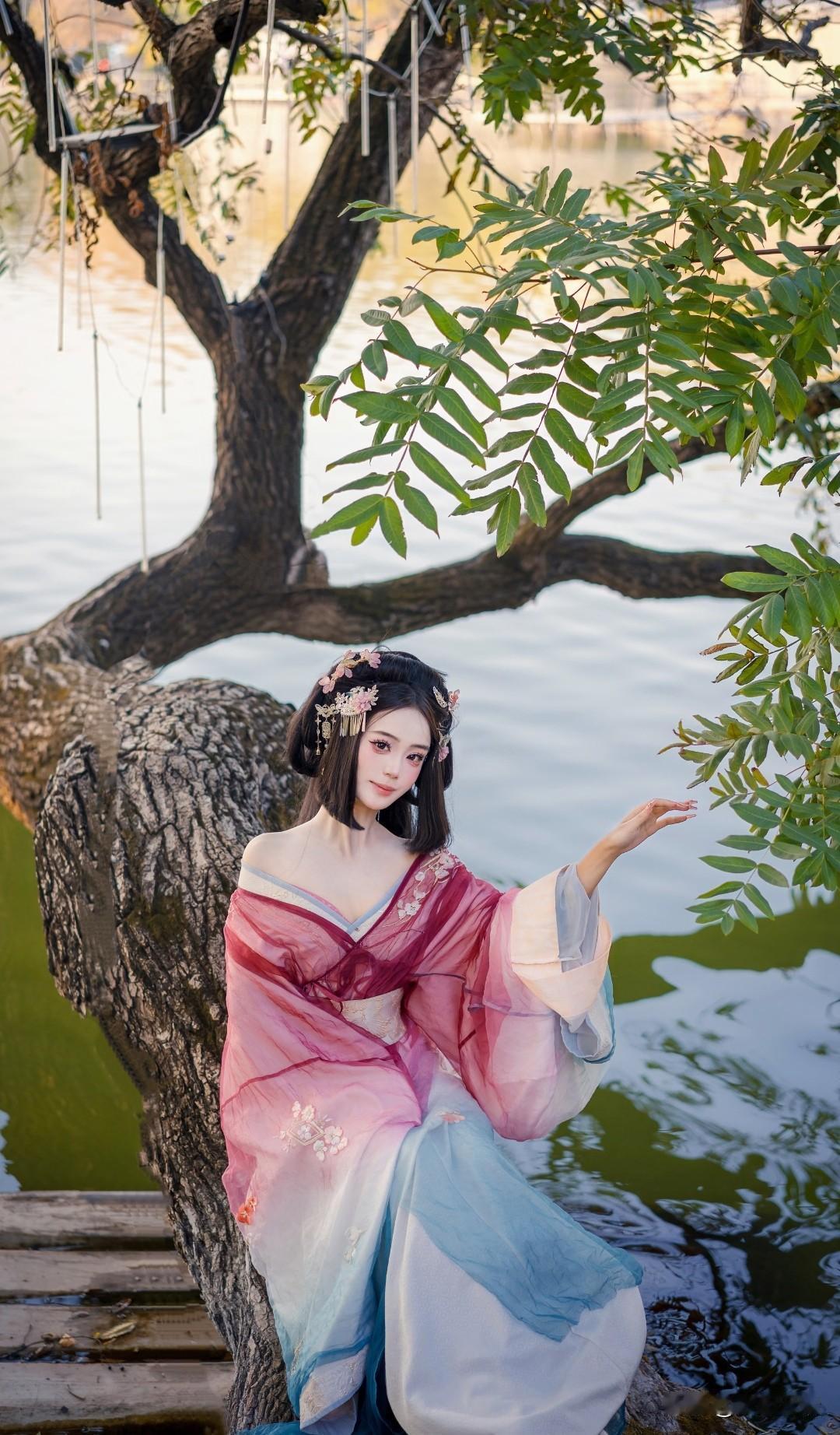 秋日仙境中的古典美人,红衣飘逸,花枝招展。