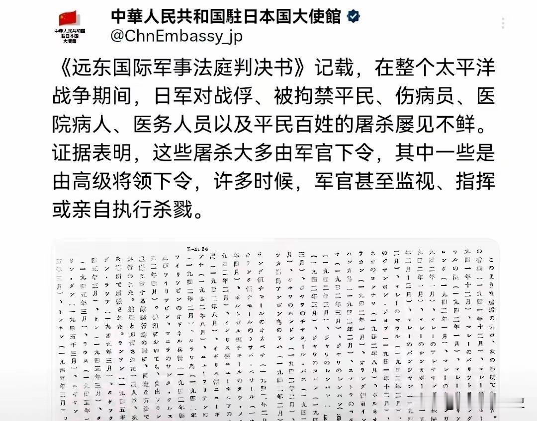 终于到这个环节了,中国驻日本大使馆今天(12月11日)发文写道:“《远东国际军事法庭判决书》记载,在整个太平洋战争期间,日军对战俘、被拘禁平民、伤病员、医院病人、医务人员以及平民百姓的屠杀屡见不鲜。证据表明,这些屠杀大多由军官下令,其中一些是由高级将领下令,许多时候,军官甚至监视、指挥或亲自执行杀戮。” 读着这段文字,心里像压了块石头。这些冷冰冰的判决词背后,是一条条曾经鲜活的人命。法庭上堆积如山的证据,不是纸上谈兵,那是血泪浸透的历史。 南京城里三十万冤魂,至今还在风中呜咽。那些数字我们背得滚瓜烂熟,可每次提起,心还是揪着疼。日本人刺刀下的婴孩,被活埋的老人,这些画面在档案馆里封存着,却刻在我们民族的记忆里。 有些人不爱听这些,说老提旧账没意思。可这不是旧账,这是未愈合的伤口。你看那些幸存者,九十多岁了,梦里还会惊醒。历史不会因为谁闭上眼睛就消失。 东京审判过去七十多年了,判决书上的墨迹早就干了。但有些人的记忆好像也跟着褪色了。教科书上轻描淡写,神社里还供着战犯,这算哪门子“反思”?简直是对逝者的二次伤害。 我们记住这些,不是为了延续仇恨。恰恰相反,正是为了让悲剧不再重演。一个民族如果连自己的伤痛都能忘记,还谈什么走向未来?那些喊着“往前看”的人,先得看清楚来时的路。 国际法庭的证据链摆在那儿,谁也抹不掉。从将军到士兵,整个战争机器都沾着无辜者的血。这不是某个士兵一时冲动,而是系统性的暴行。这套机制若不彻底清算,谁能保证不会借尸还魂? 每到十二月,南京的警报声就会响起。那声音穿越时空,提醒着我们:和平不是天上掉下来的。是先辈用血肉换来的,是无数冤魂用生命警示的。忘记这段历史,就是对他们的背叛。 真相或许沉重,但我们必须扛着。不仅为我们自己,也为全人类。二战过去这么久了,世界上的枪声却从未停歇。只有直面人性的深渊,才能找到通向光明的小路。 各位读者你们怎么看?欢迎在评论区讨论。 中方对日本态度 中方正告日本 中国驻日本 中方对日本表态