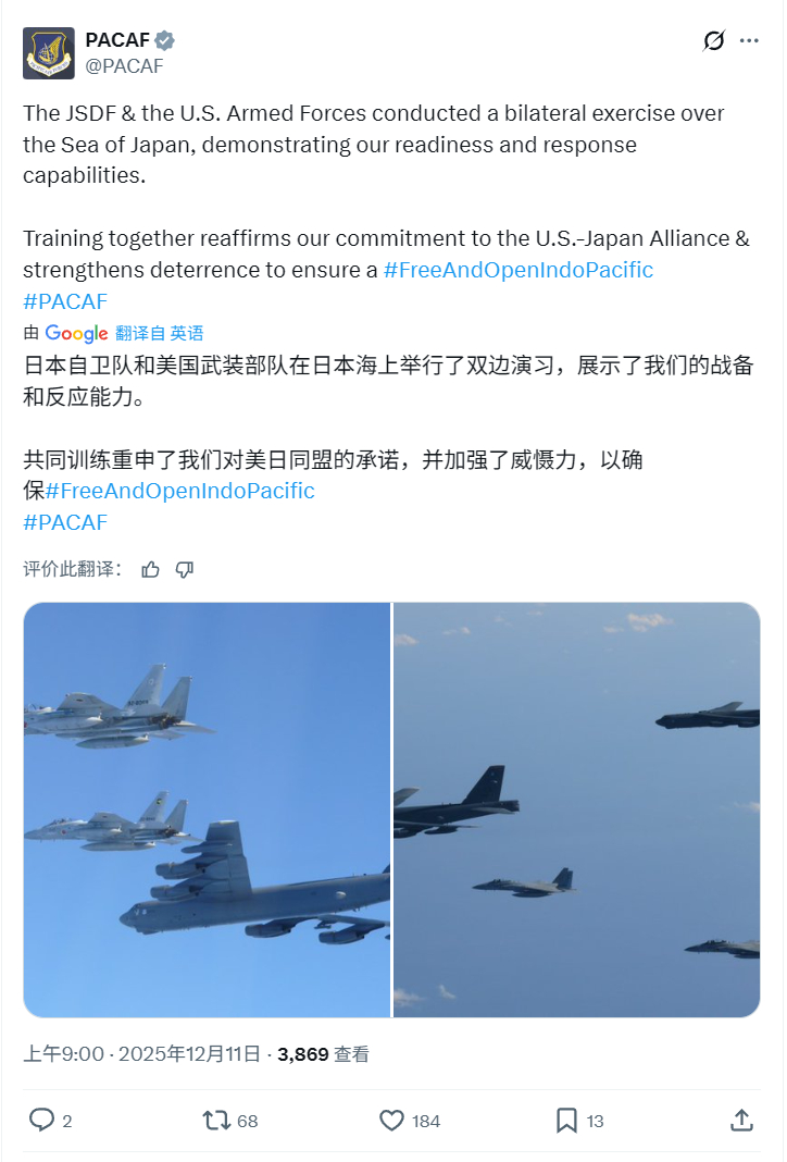 今天日美也搞了个联合巡航,太平洋空军司令部和日本防卫省同时发帖宣布。B-52和F-15J ,日本说为了应对最近的紧张局势,但美军称巡航位置在日本海