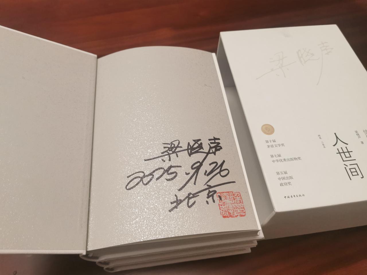 梁晓声签名精装版《人世间》,一份十分珍贵的礼物! 尽管看过根据梁晓声同名小说改编的年代电视连续剧《人世间》,但是从内心里仍然想认真的读读原著。因为,读书与看剧的感受还是不一样的,尤其是人物的内心等细腻处,那不是镜头能够反应出来的。 我的同事、好友本事很大,居然搞到了一套作家签名的精装版(图二图五),而且大度的送给了我。这让我感动的不要不要的。2026年的元旦就要到了,这就算是我的一份新年礼物了,而且是一份十分珍贵的新年礼物。 小郑同志,谢谢你啦,并祝你工作顺心,事事如意[作揖][作揖][作揖]