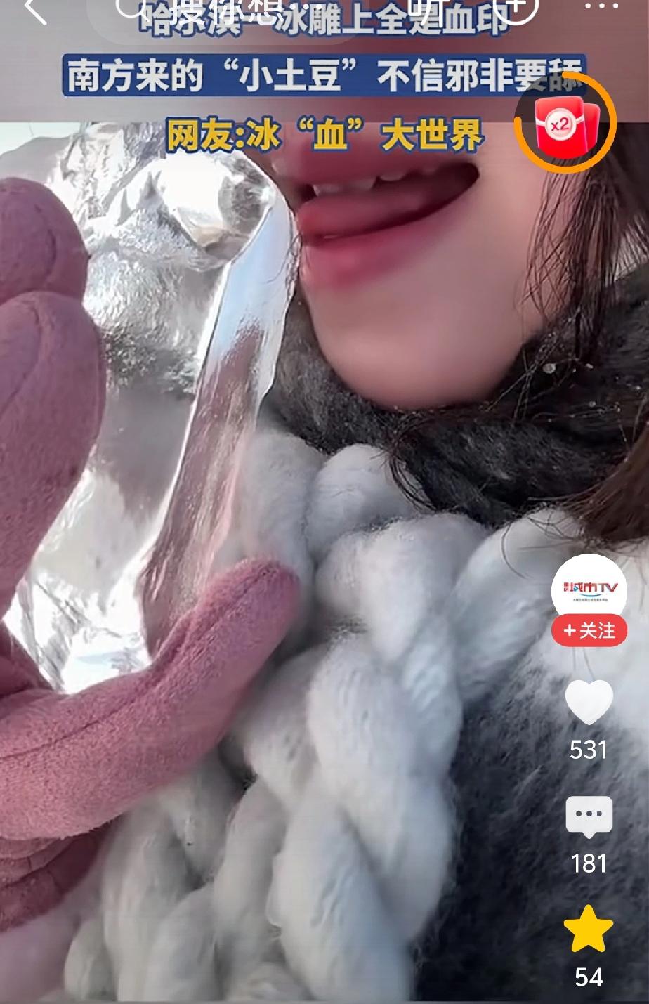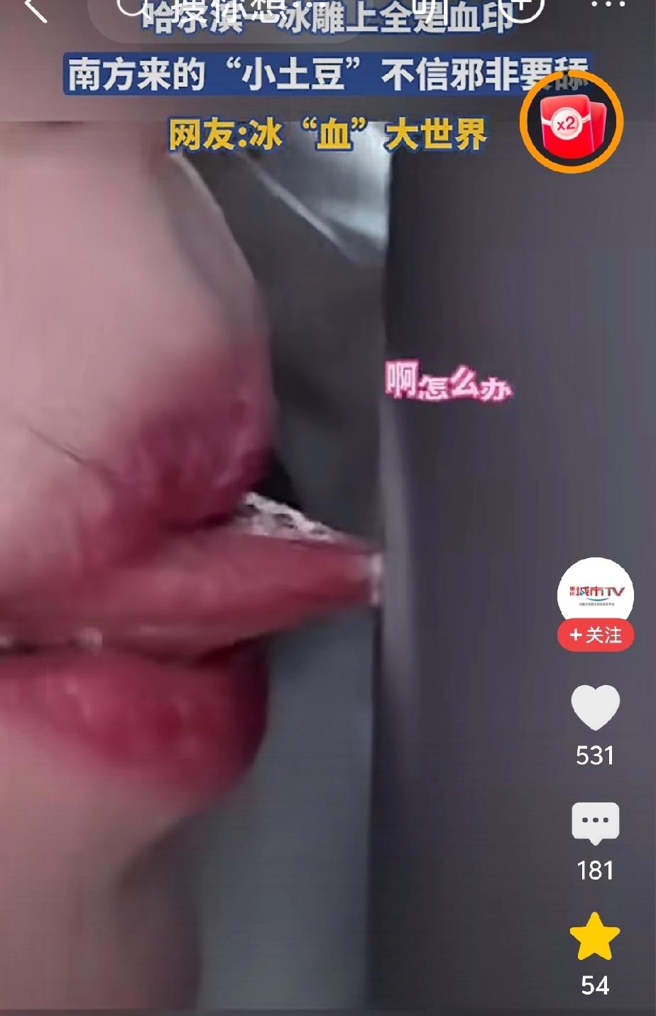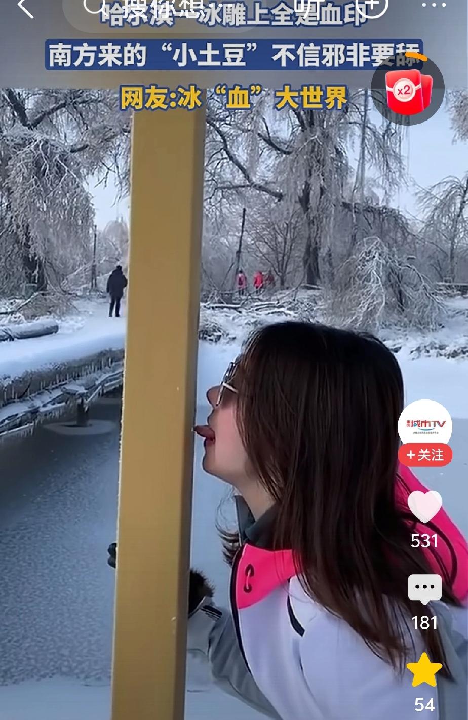 哈尔滨的冰雕上,为什么有红血印? 听来的事情不为准,必须要亲自尝试一下,这叫不信邪。 原来,南方来的小可爱们,可能听说过北方人的经验之谈,那就是东北的冬天特别冷,冰会把嘴给粘住。 可是他们不相信,非要事必躬亲,去试一试。结果,把嘴或者舌头贴到冰雕上,结果刚一接触,就和冰这不开了。因为东北室外的温度特别低,这时的肉皮特别脆,使劲一拉,果然把肉皮都给拽下来了,连着红红的血。 其实,这种事不光发生在南方小土豆的身上,土生土长的东北人,更是没少吃过这方面的苦。看看评论区里可热闹了,谁小时候没有上过这种当,没吃过这亏的,那他就不叫东北人。 祖国这么大,一个地方有一个地方的稀罕事。其实,这都不是啥大事。 图片来自网络侵删致歉!