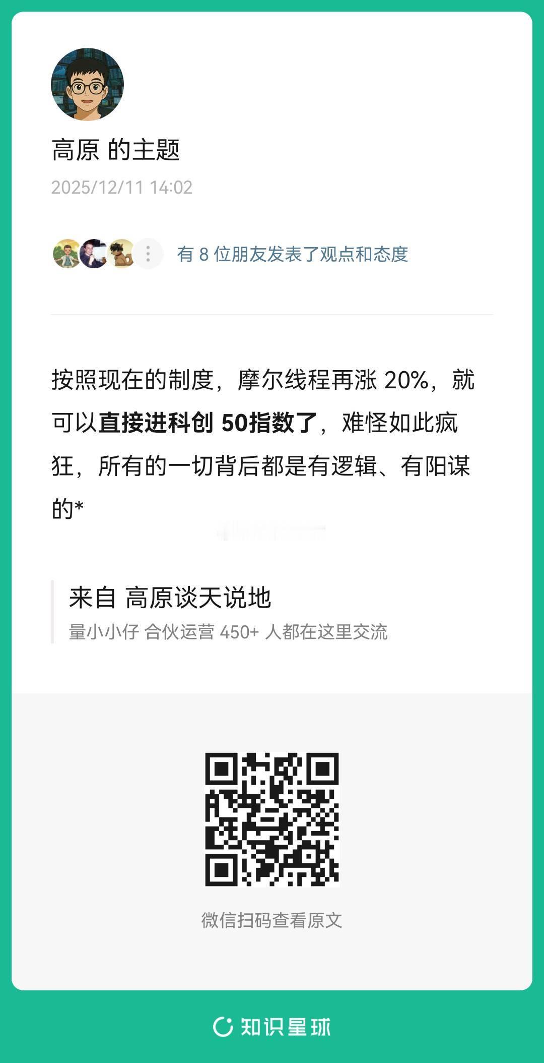 我早上在星球里就说了,摩尔线程被爆炒不是真的“无脑”,其实背后的资金很阴险,几乎是一场阳谋,12月恰好是科创50指数调成份股的时间窗口,机构们把摩尔线程炒高之后,由于其市值足够高,有直接纳入指数让广大基民接盘的的可能性摩尔线程涨爆了A股