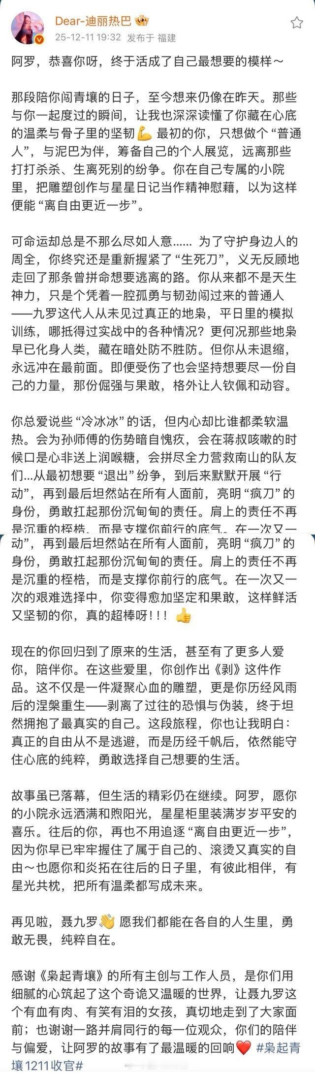 迪丽热巴发文告别聂九罗不要带走这个九罗啊下个角色再见👋期待热巴的下一部作品迪丽热巴发文告别聂九罗枭起青壤1211收官狠狠期待迪丽热巴聂九罗期待迪丽热巴的新作品迪丽热巴把角色演出了灵魂迪丽热巴聂九罗角色热度周冠迪丽热巴演出了非人感