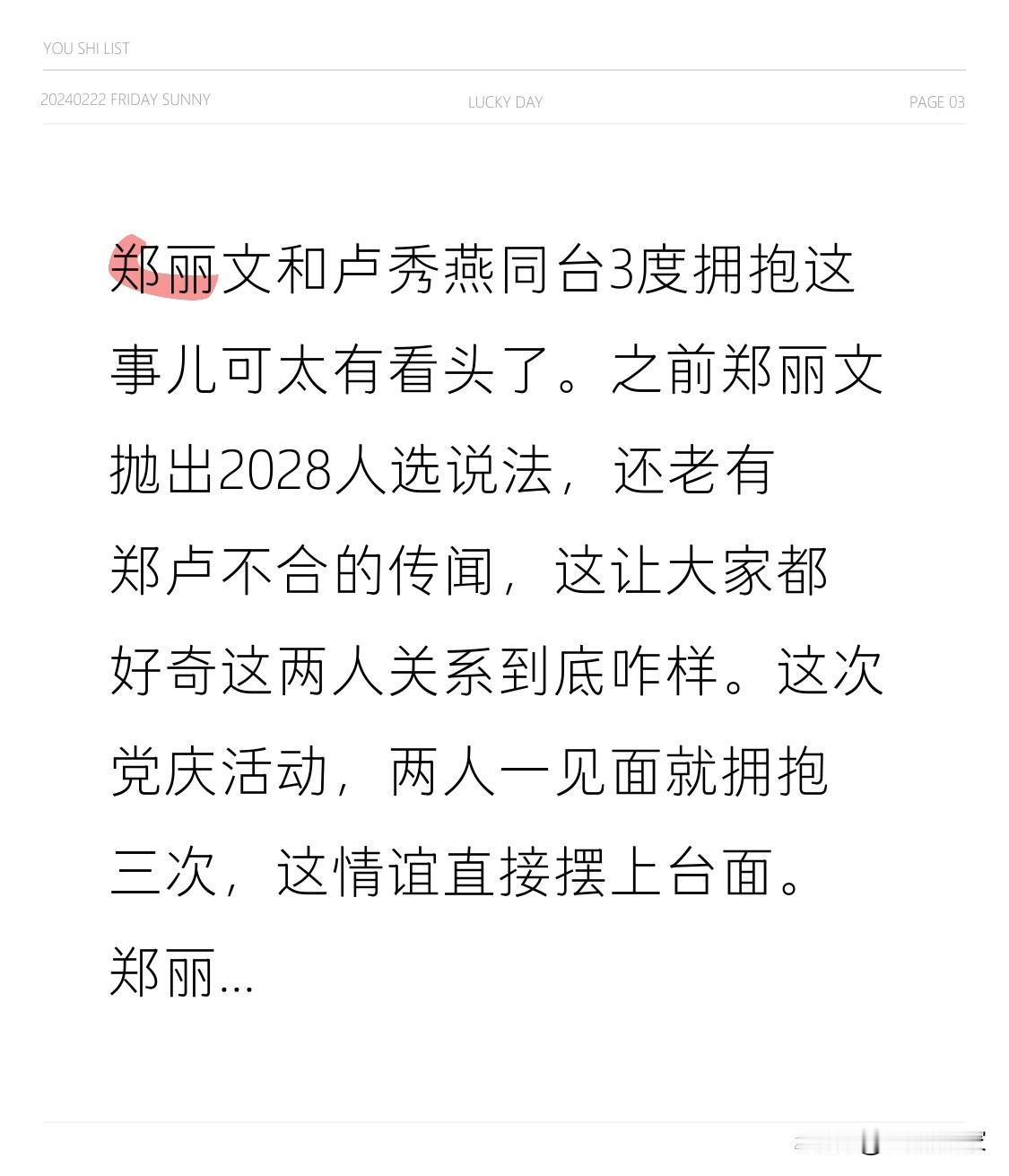 郑丽文和卢秀燕同台3度拥抱这事儿可太有看头了。之前郑丽文抛出2028人选说法,还老有郑卢不合的传闻,这让大家都好奇这两人关系到底咋样。 这次党庆活动,两人一见面就拥抱三次,这情谊直接摆上台面。郑丽文夸卢秀燕辛苦,还赞她危机处理能力强,卢秀燕也回忆郑帮她竞选的过往,强调两人是好姐妹。 这俩人的互动到底是真情实意,还是为了党内团结做做样子呢?大家觉得她们后续还会有啥新动作不? 台湾省郑丽文 台湾省郑丽文 郑丽文访大陆 郑丽文怒呛 郑丽文简历 郑丽文跳舞 郑丽文拒美邀约 郑丽红
