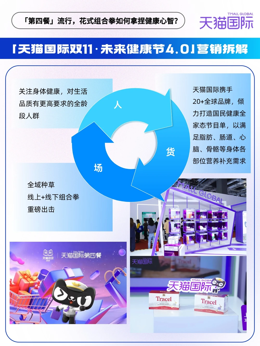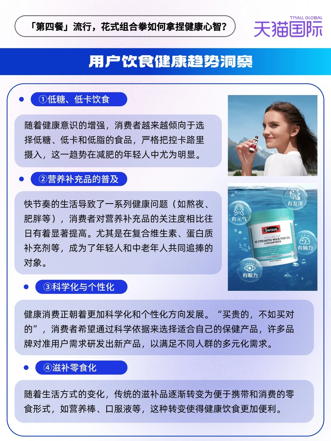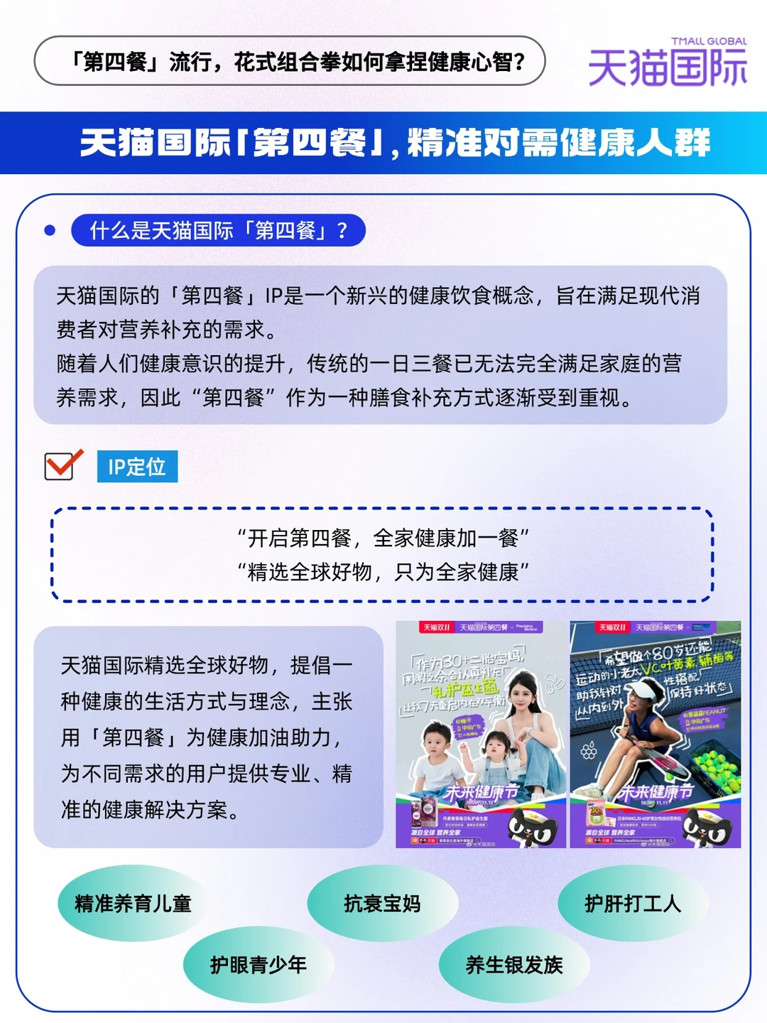 🔵随着人们健康意识的提升,天猫国际提出了「第四餐」IP,它是一个新兴的健康饮食概念,作为一种膳食补充方式逐渐受到用户重视。