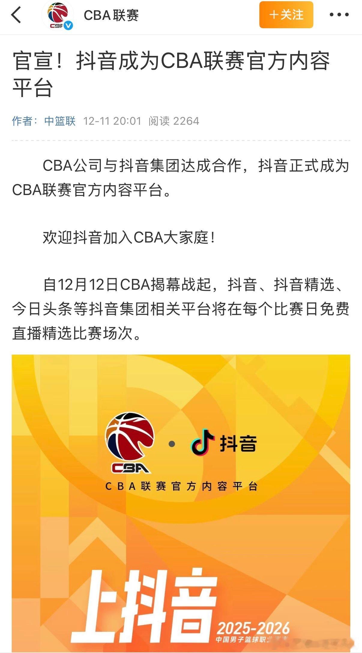 CBA联赛抖音正式“加入”,说明不是独播。“精选场次”即部分场次。PS:咱辽台
