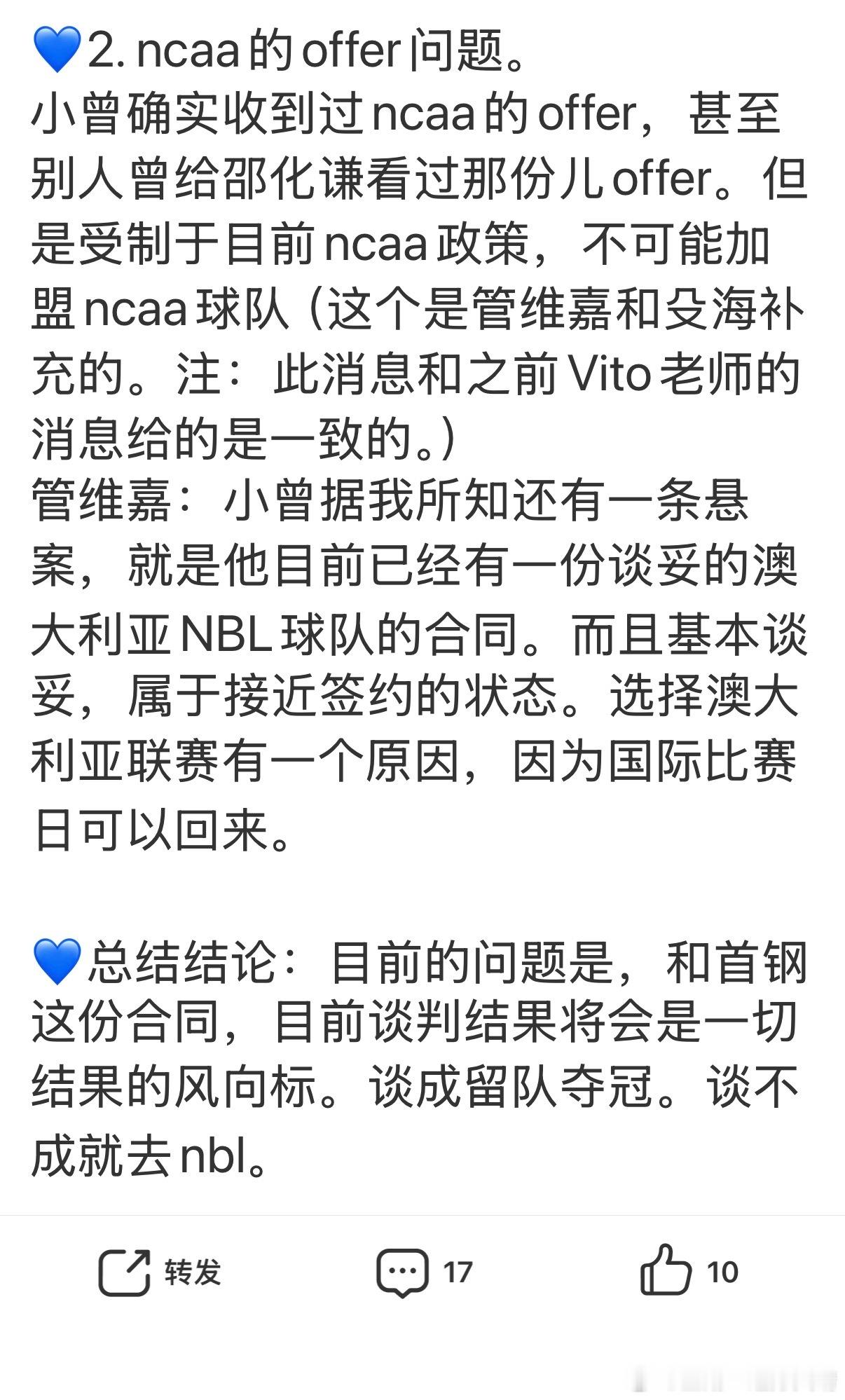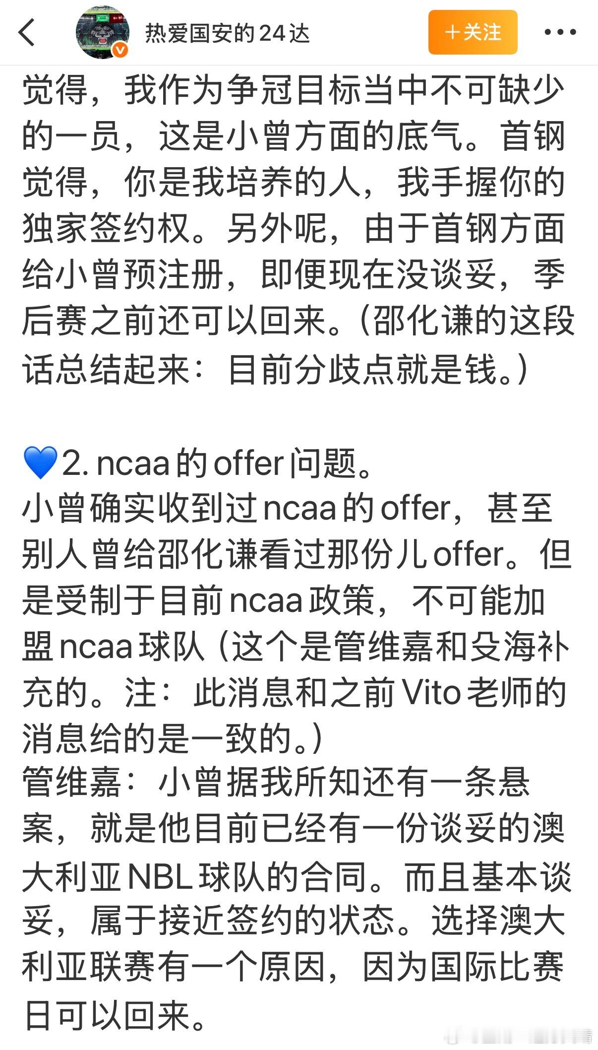 看看别人 体坛篮球讨论小曾的问题,大概就是薪水谈拢就留下来,否则就去NBL。这里我补充一个信息,今年北京国安一直传出欠薪传闻,所以也不要对京城有太多滤镜。更何况,有没有钱,和给不给高工资,这是两件事。