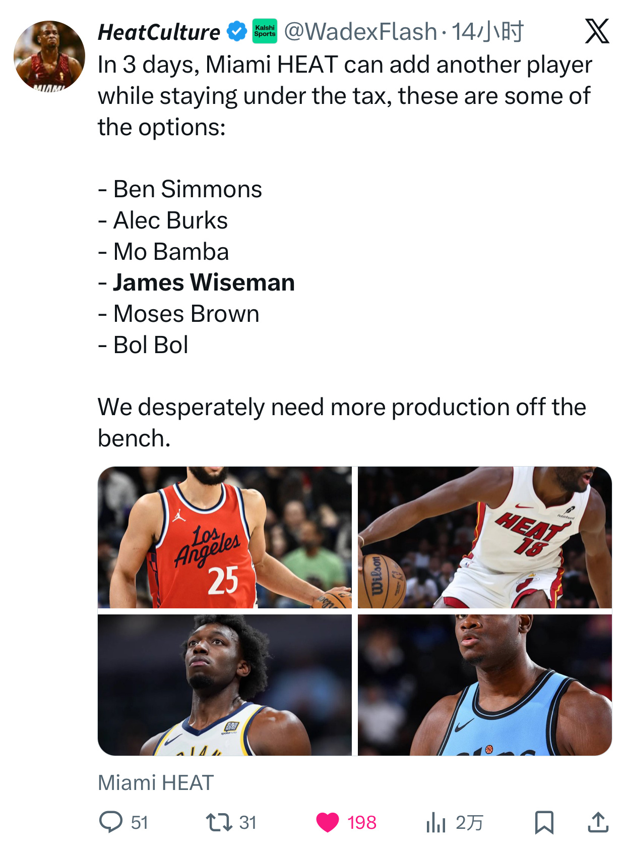 绝了,迈阿密热火球迷组织又发了关于签约第十五人的预测,怀斯曼上榜(不过大概率无缘)heatculture:三天之内,迈阿密热火队可以在不超出奢侈税线的情况下再签下一名球员,以下是一些选择:本西蒙斯旧将伯克斯(可能性有点)班巴怀斯曼摩西布朗波尔波尔(可能性有点)我们急需增加替补球员的上场时间。迈阿密热火