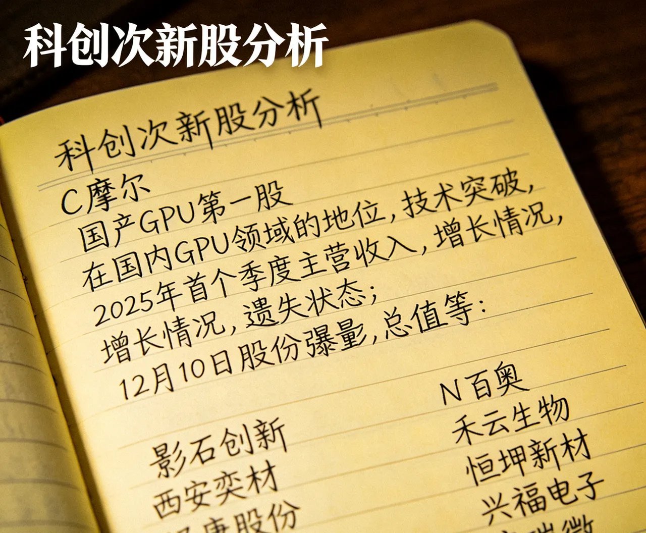 掘金科创次新:10家潜力标的全景解析科创次新股板块向来是机遇与风险并存的投资高地,兼具高成长性与高波动性的特质。以下聚焦10家具有代表性的科创次新企业,从技术壁垒、业绩表现、市场前景等维度展开深度剖析。1. C摩尔:身披“国产GPU第一股”光环,在国内GPU赛道占据领先身位。依托自主研发的MUSA架构,成功攻克单芯片架构兼容多类计算加速的技术难题,实现关键突破。2025年前三季度,公司营收规模达到7.85亿元,同比增幅高达181.99%,增长动能强劲;不过现阶段尚未实现盈利,仍处于亏损周期。12月10日股价大涨16.98%,总市值攀升至3454.71亿元。2. 影石创新:深耕智能影像设备赛道,核心业务涵盖全景相机、运动相机的研发、生产与销售。2025年三季报数据亮眼,每股净资产达14.28元,基本每股收益2.10元,毛利率稳定在49.63%,净资产收益率13.83%,财务基本面扎实稳健。凭借产品的全球竞争力,叠加智能影像设备市场的扩容红利,公司业绩增长具备可持续性。12月10日股价上涨2.38%,总市值达1052.50亿元。3. 西安奕材:在半导体材料领域沉淀了独特的技术优势,发展潜力值得期待。12月10日股价上涨3.15%,总市值达990.47亿元。目前公司在业务细节与财务数据方面披露相对有限,但立足半导体产业链的关键环节,其长期发展前景具备较高关注价值。4. 屹唐股份:是半导体装备领域的核心玩家,主营半导体专用设备的研发、生产与销售,在刻蚀、清洗等半导体制造关键工艺环节,积累了深厚的技术储备与可观的市场份额。12月10日股价微涨0.76%,总市值748.35亿元。伴随半导体行业的持续高景气,公司将充分享受行业红利,业绩增长空间广阔。5. 海博思创:专注于新能源汽车动力电池系统研发、生产及销售,凭借扎实的技术实力与优质的客户资源,产品广泛应用于新能源汽车领域。12月10日股价下跌8.12%,总市值471.84亿元。尽管短期股价存在波动,但放眼新能源汽车市场的快速发展趋势,公司长期成长逻辑依然清晰。6. N百奥:作为新晋上市的科创次新股,市场表现十分活跃。12月10日股价飙升146.63%,总市值达294.06亿元。公司在生物科技领域疑似具备创新能力与发展潜力,不过由于上市时间较短,业务模式的成熟度与业绩的稳定性仍需时间验证。7. 禾元生物:聚焦植物源重组蛋白药物研发赛道,手握独特的技术平台与丰富的研发管线。2025年三季报显示,公司每股净资产1.85元,毛利率达50.09%,但净利润仍未摆脱亏损状态。随着在研项目的稳步推进与产品商业化进程的提速,公司未来有望实现扭亏为盈的关键跨越。8. 恒坤新材:主营高性能工程塑料及特种工程塑料的研发、生产与销售,2025年三季报数据显示,每股净资产4.15元,基本每股收益0.19元,毛利率43.60%,净资产收益率4.66%。其产品广泛应用于汽车、电子电器等下游领域,伴随业务版图的持续扩张,公司业绩有望实现稳步抬升。9. 兴福电子:是国内电子铜箔领域的重要供应商,而电子铜箔是锂电池、印制电路板等产品的核心原材料。12月10日股价大涨12.79%,总市值达133.38亿元。受益于新能源汽车与电子信息产业的双重爆发,电子铜箔需求持续攀升,公司发展将迎来强劲的行业东风。10. 昂瑞微:专注于射频、模拟领域的集成电路设计,是国家级专精特新重点“小巨人”企业。其5G高集成度模组相关技术方案与产品性能,达到国内领先、国际先进水平,已成功切入主流手机品牌旗舰机型供应链并实现大规模应用。凭借在射频前端芯片领域的硬核技术实力与市场竞争力,公司未来发展前景值得期待。风险提示:以上内容均基于公开信息整理,不构成任何投资建议。投资者布局科创次新股时,需综合考量公司基本面、行业发展前景、市场竞争格局等多重因素,审慎决策。