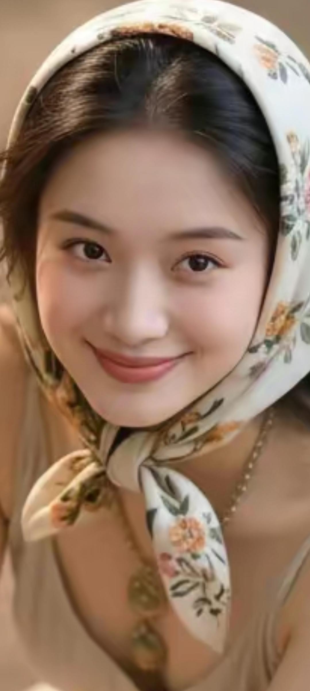 温柔甜美的微笑,花色头巾点缀,散发自然魅力!🌸😊