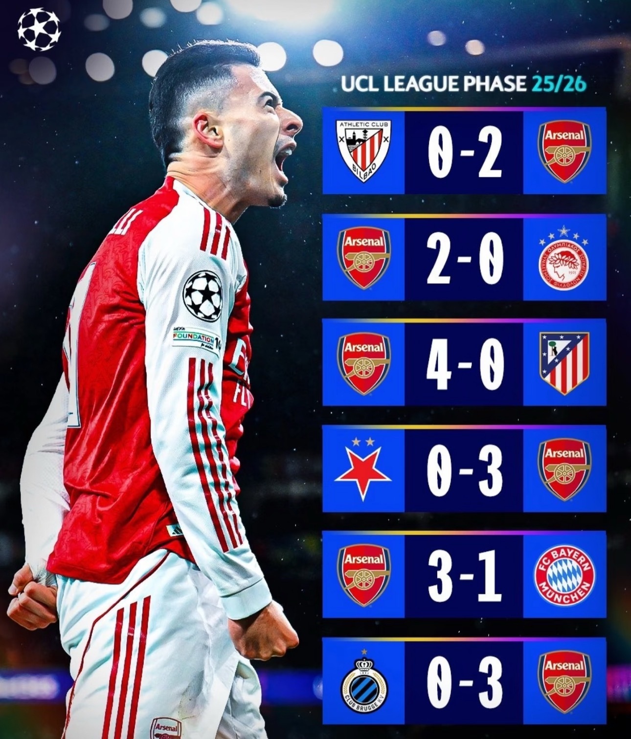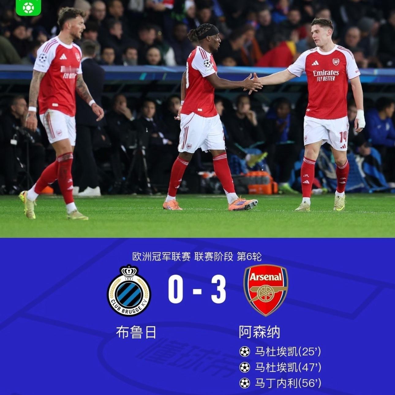 欧冠神迹!阿森纳3-0横扫布鲁日,6战全胜创队史纪录2025-26赛季欧冠小组赛第6轮,阿森纳客场3-0完胜布鲁日,以6战全胜积18分的完美战绩锁定小组头名,成为本赛季欧冠唯一保持全胜的球队,更创下队史欧冠小组赛首次全胜的历史性时刻。亿元边锋马杜埃凯成为全场绝对主角,第25分钟接苏维门迪做球后,从中场连续突破两名防守球员,奔袭30米轰出贴地世界波,皮球击中横梁下沿入网;下半场刚开场90秒,他又接苏维门迪精准传中头球破门,完成梅开二度的同时,将个人欧冠进球数提升至3粒。巴西前锋马丁内利则书写队史新篇,第56分钟左路内切后轰出美妙弧线球直挂远角,达成连续5场欧冠破门的壮举,成为阿森纳队史首位获此成就的球员。整场比赛阿森纳统治力拉满,控球率68%、射门15次射正7次,防守端零封对手,门将拉亚多次关键扑救力保城门不失。6场小组赛阿森纳轰入17球仅失2球,攻防两端展现恐怖平衡,锋线三叉戟贡献12球,16岁新星萨尔蒙替补登场更显阵容深度。这场胜利不仅延续了枪手对阵比利时球队9战不败的纪录,更让他们稳居欧冠夺冠赔率榜首,青春风暴已然成为欧洲足坛不可忽视的夺冠力量!阿森纳欧冠全胜 马杜埃凯双响