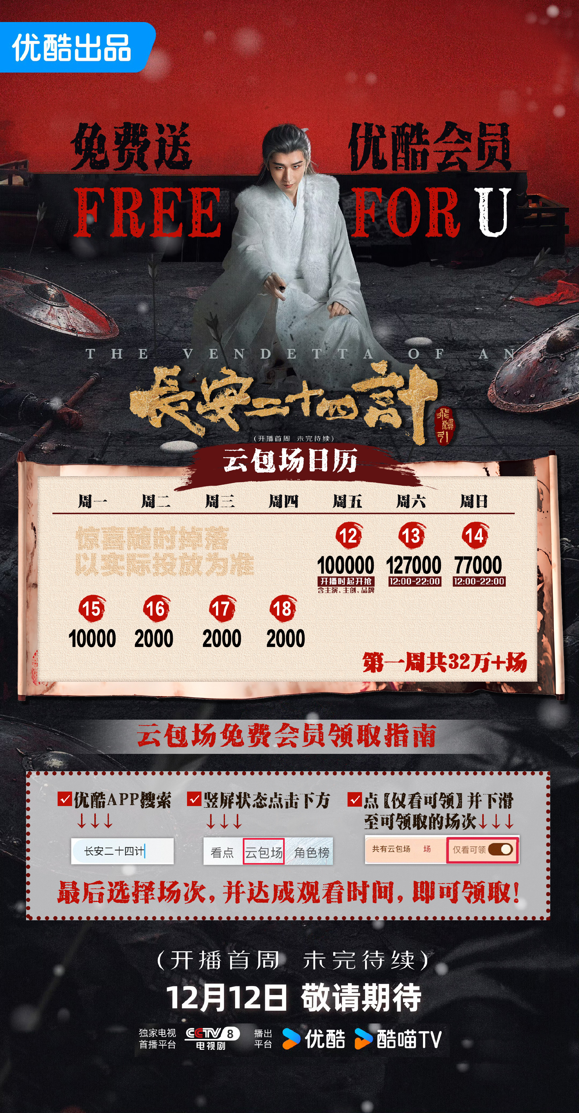 长安二十四计明日开播,成毅粉丝送出云包场37.7W+座,连续一周投放,未完待续。成毅连续三个月播三部剧,每一部剧的云包场都这么震撼,ie还是太有实力了!长安二十四计年末古装复仇爽剧天花板,速来看剧抢会员。