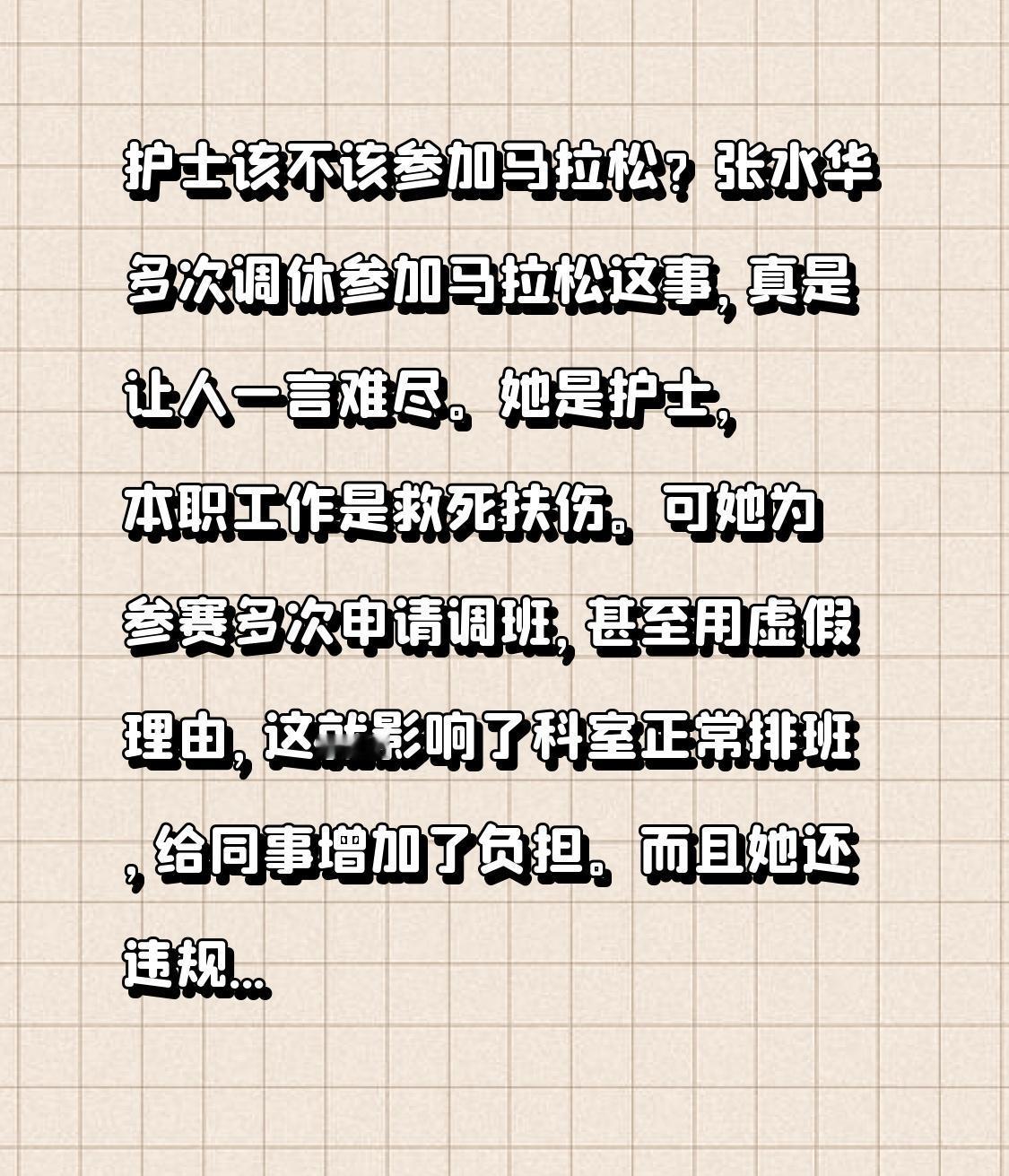 护士该不该参加马拉松? 张水华多次调休参加马拉松这事,真是让人一言难尽。她是护士,本职工作是救死扶伤。可她为参赛多次申请调班,甚至用虚假理由,这就影响了科室正常排班,给同事增加了负担。 而且她还违规兼职取酬,和公司签约代言却不履行报批手续,这显然违反了医院规定。虽说追求爱好没错,她跑马拉松也取得过好成绩,但不能以牺牲工作秩序为代价。医院对她警告处分6个月,不能参与2025年评优,这处理挺合理。工作和爱好得平衡好,不能顾此失彼。 护士马拉松