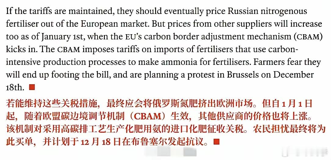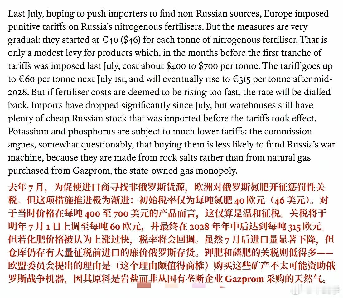 由于制裁了俄罗斯天然气所以欧洲生产不出化肥,于是转而从俄罗斯购买成品化肥。
