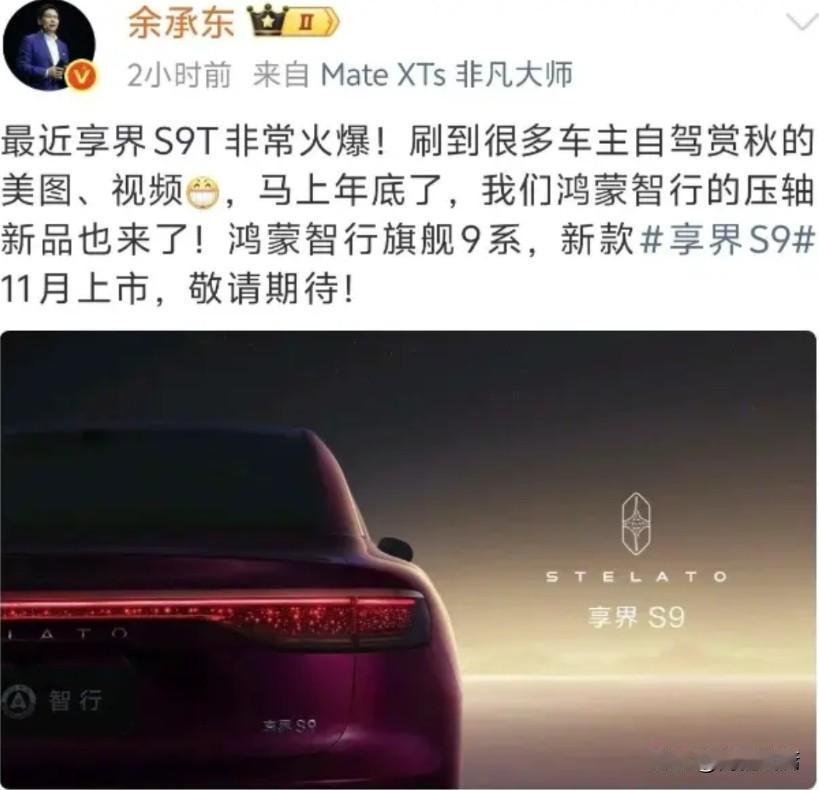 新款享界S9将成鸿蒙智行年底大招?余承东官宣11月上市 鸿蒙智行年底的压轴新车到底是什么?12月,华为余承东在社交平台给出答案:归属鸿蒙智行旗舰9系的新款享界S9,将于11月正式上市。 余承东提到,近期享界S9T热度爆棚,不少车主分享了用车辆自动驾驶功能赏秋的美图、视频,也让市场对享界S9系列的新品更加期待。从曝光的海报来看,新款享界S9车尾延续品牌标识设计,紫红色车身搭配贯穿式尾灯极具辨识度,“鸿蒙智行”与“享界S9”的字样也明确了其生态核心属性。 作为华为与北汽联手打造的高端车型,享界S9此前凭借鸿蒙智能座舱、高阶智驾技术圈粉不少。此次选在11月上市,正值年底车市消费旺季,新车大概率会在配置、智驾体验上带来升级。 不过目前新款享界S9的具体参数、售价还未公布,余承东口中的“压轴新品”究竟会有哪些惊喜,还得等后续官方披露。