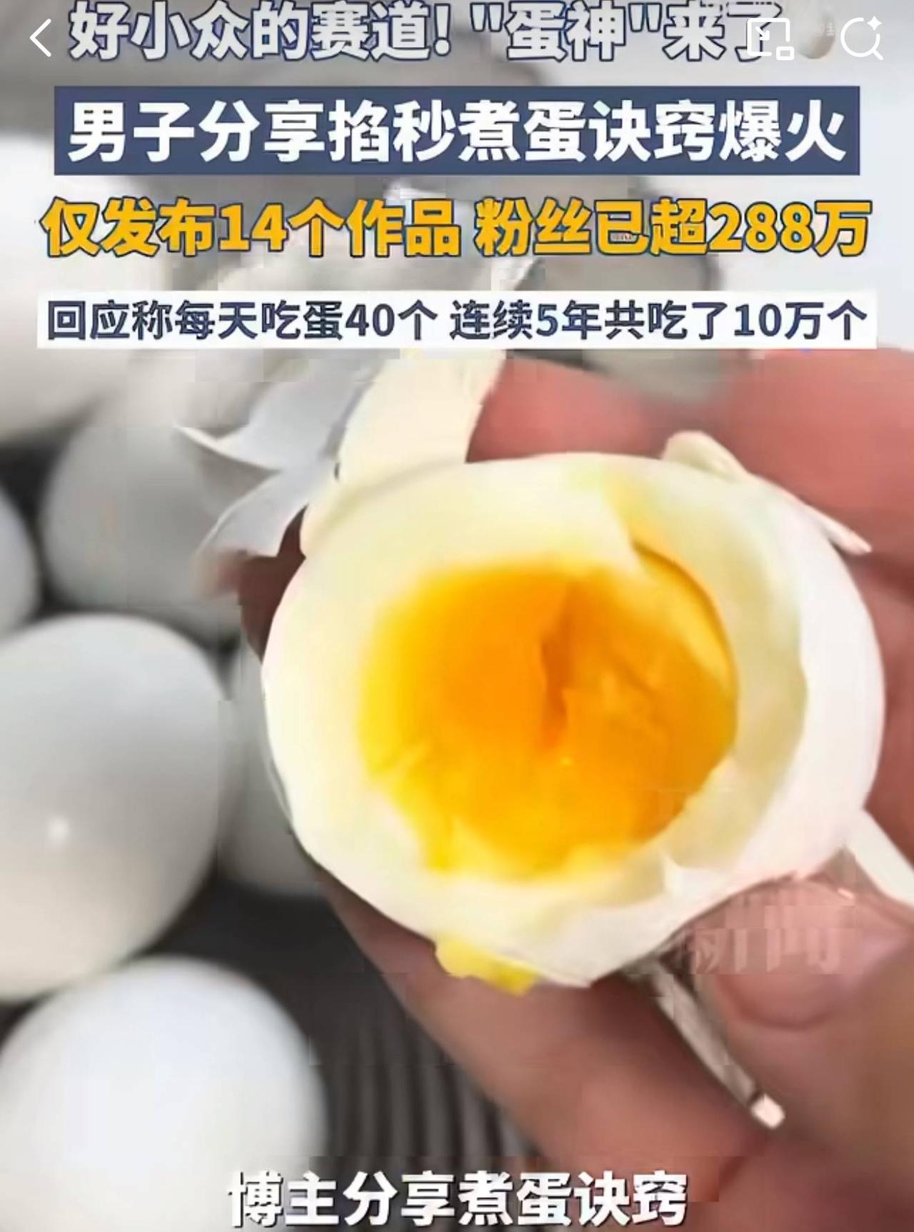 社恐博主靠煮蛋爆火!8天涨粉356万,9分12秒的秘诀藏着流量密码 谁能想到,2025年末的流量黑马,竟然是一个煮鸡蛋的!12月11日,抖音博主“爱吃蛋”冯先生彻底火了,仅凭一句“水开下蛋9分12秒过凉水”,8天狂揽356万粉丝,15条煮蛋教程获赞超千万,硬生生把“煮蛋”做成了顶流生意。 说出来你可能不信,这位爆红的博主竟是个“社恐”。面对突如其来的走红,冯先生反复强调“完全没想过会火”,坦言每天被大量关注包围,压力大到失眠,但还是会坚持分享挑蛋、保鲜等干货,从溏心蛋到金沙蛋,每一个步骤都精准到秒,堪称“煮蛋界的工匠精神”。 网友的反应更是两极反转。有人把他的教程奉为“厨房圣经”,实测后留言“终于煮出不流心、不硬芯的完美鸡蛋”;也有网友质疑“精准到秒的人设太假,明显是有剧本”,甚至拿“日食40个蛋”的传言追问,对此冯先生选择闭口不回应,专注打磨内容。 其实这场“煮蛋神话”,藏着流量时代最朴素的逻辑:大家追捧的从来不是“煮蛋”本身,而是把平凡小事做到极致的匠心。生活里总有人执着于“高大上”的赛道,却忽略了厨房、阳台这些烟火气的场景,冯先生的爆红恰恰证明,再普通的领域,只要深挖细节、提供价值,就能戳中大众的需求痛点。 但爆红之后的考验才刚刚开始。对于素人网红来说,如何平衡内容质量与商业变现,避免“昙花一现”,是绕不开的课题。有人担心冯先生会被流量裹挟,放弃精准的教程转而直播带货;也有人期待他能拓展更多美食干货,把“极致精神”延续下去。 你试过按秒煮蛋吗?你觉得冯先生能守住这份“煮蛋匠心”,还是会沦为流量的过客?评论区聊聊你的看法~