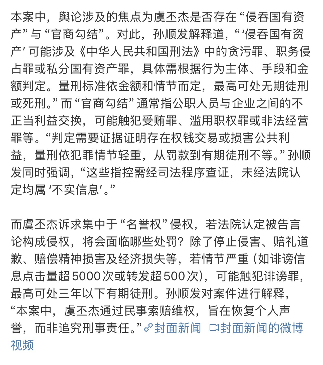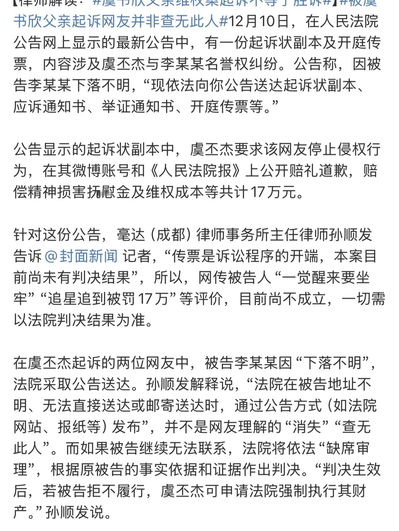 虞书欣父亲维权案起诉不等于胜诉律师解释的非常到位了,索赔17w未必是最终判决17w,本质上网友质疑虞书欣父亲的相关问题需要si法程序去调查,这种调查一旦深入,谁更害怕可想而知,走名誉权疑似是想偃旗息鼓,把胜诉声张为网传质疑全部为假,来达到掩盖大众质疑的目的,维权如果变为掩饰真相的手段,是非常可怕的事情,我个人建议si法程序走起,深入调查,还虞书欣父亲一个清白,也可以给大众一个交代,你们觉得呢?