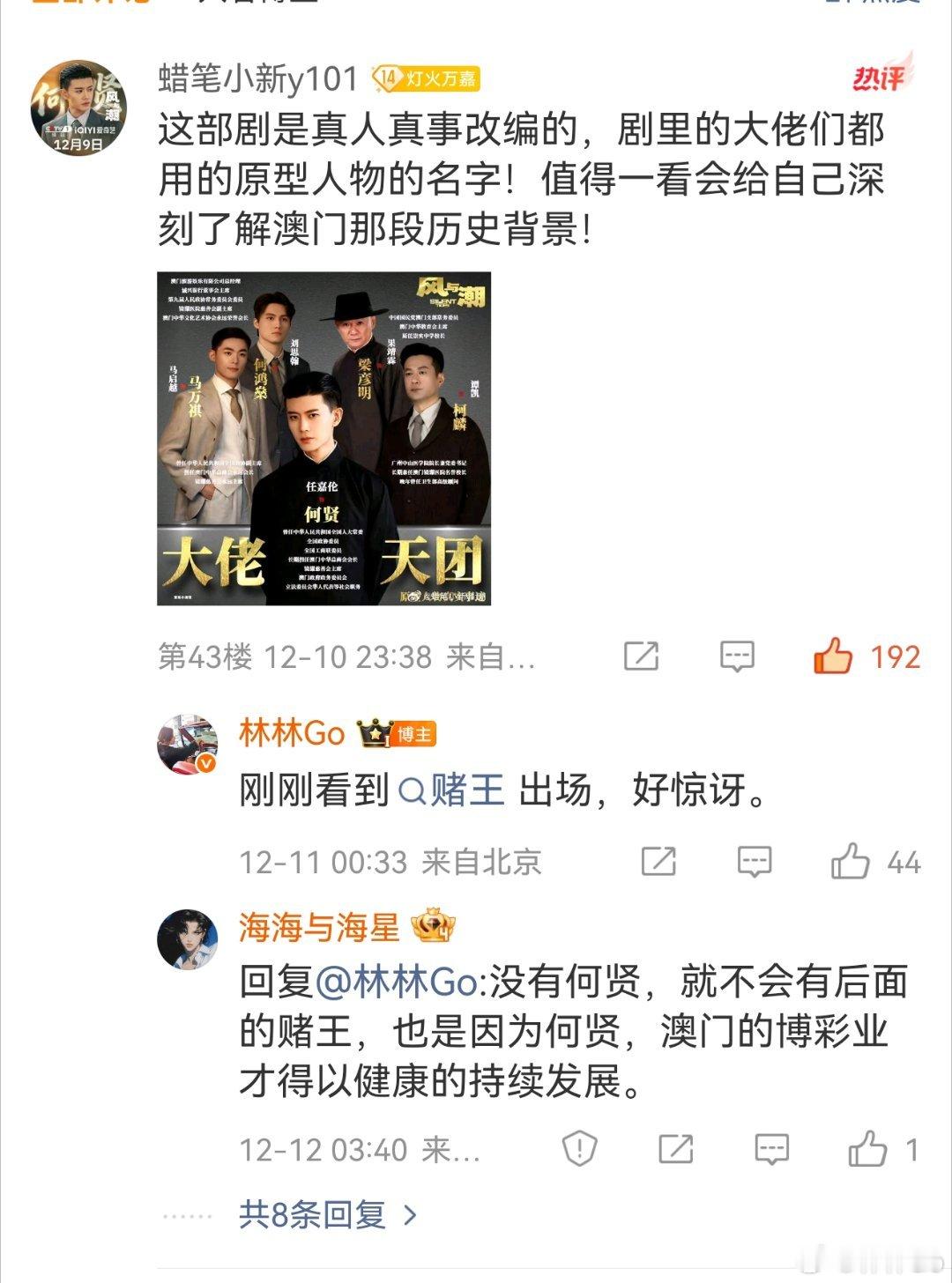 起先我只是觉得难得看到一个剧本拍摄、人物塑造、故事节奏这么好的片子,后来有好多朋友给我留言介绍故事背景。我也去学习了下澳门王何贤的故事背景,现实比故事更跌宕。敢作敢当有胆识,时代造就英雄。任嘉伦非常适合何贤这个角色,沉稳的内敛。而且这个时代人物的装扮在他身上,一点没有违和感,感觉就是量身定做的。不剧透,但是必须要提一句,第七集何贤与柯大夫在医院促膝长谈的那个场景,看得我哭得稀里哗啦的。英雄难当啊!制作水准特别好的一部剧,推荐大家去看。任嘉伦风与潮