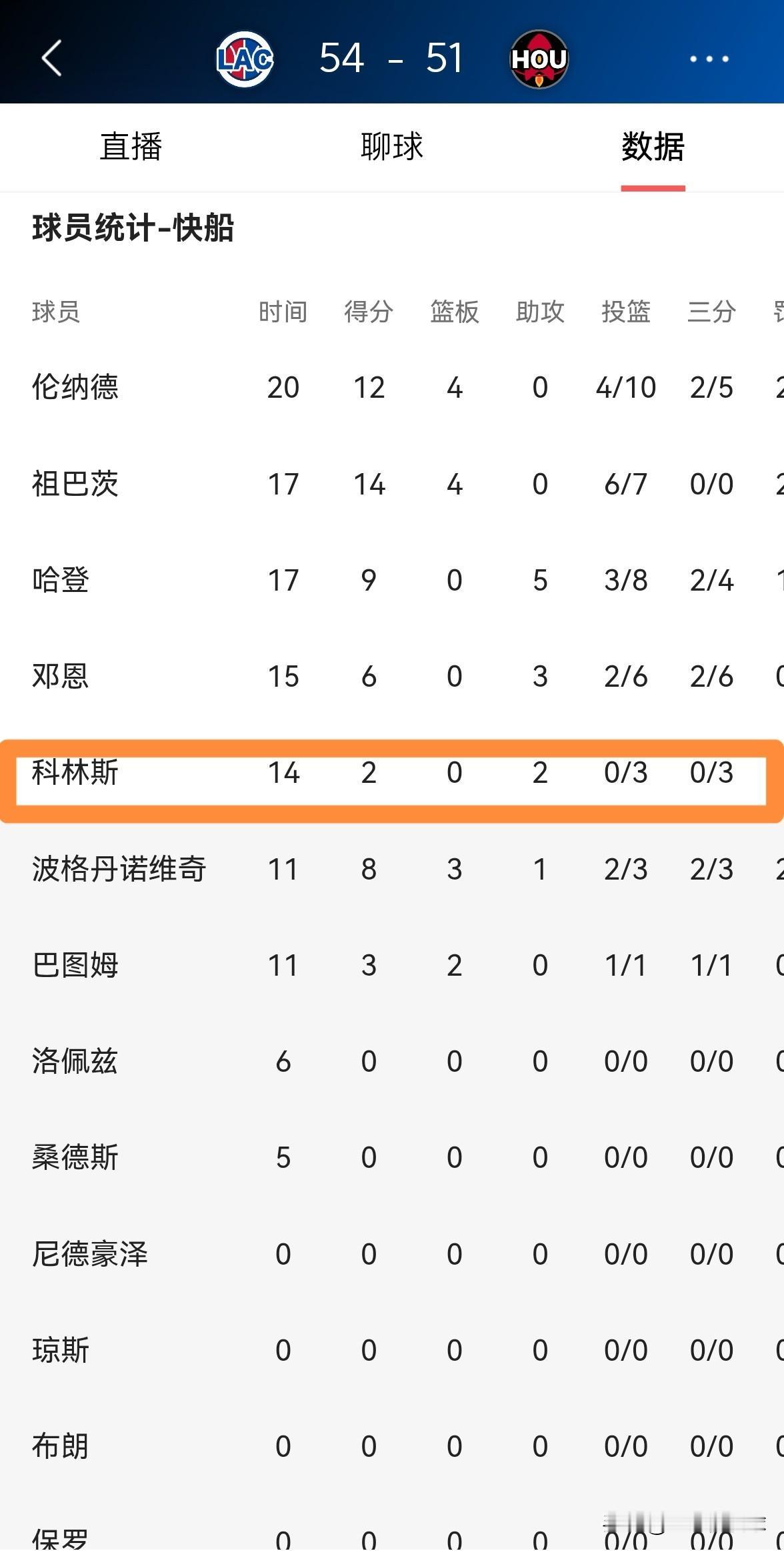 快船大将科林斯真是太让人失望了!在今天进行的快船和火箭的比赛中,目前双方半场战罢,快船暂时以54:51领先对手。在上半场比赛中,科林斯首发出战14分钟,投篮3中0仅仅依靠罚球得到2分,还出现了2次失误。 毫不夸张的说,以科林斯目前的糟糕表现来看,他距离被交易已经越来越近了。