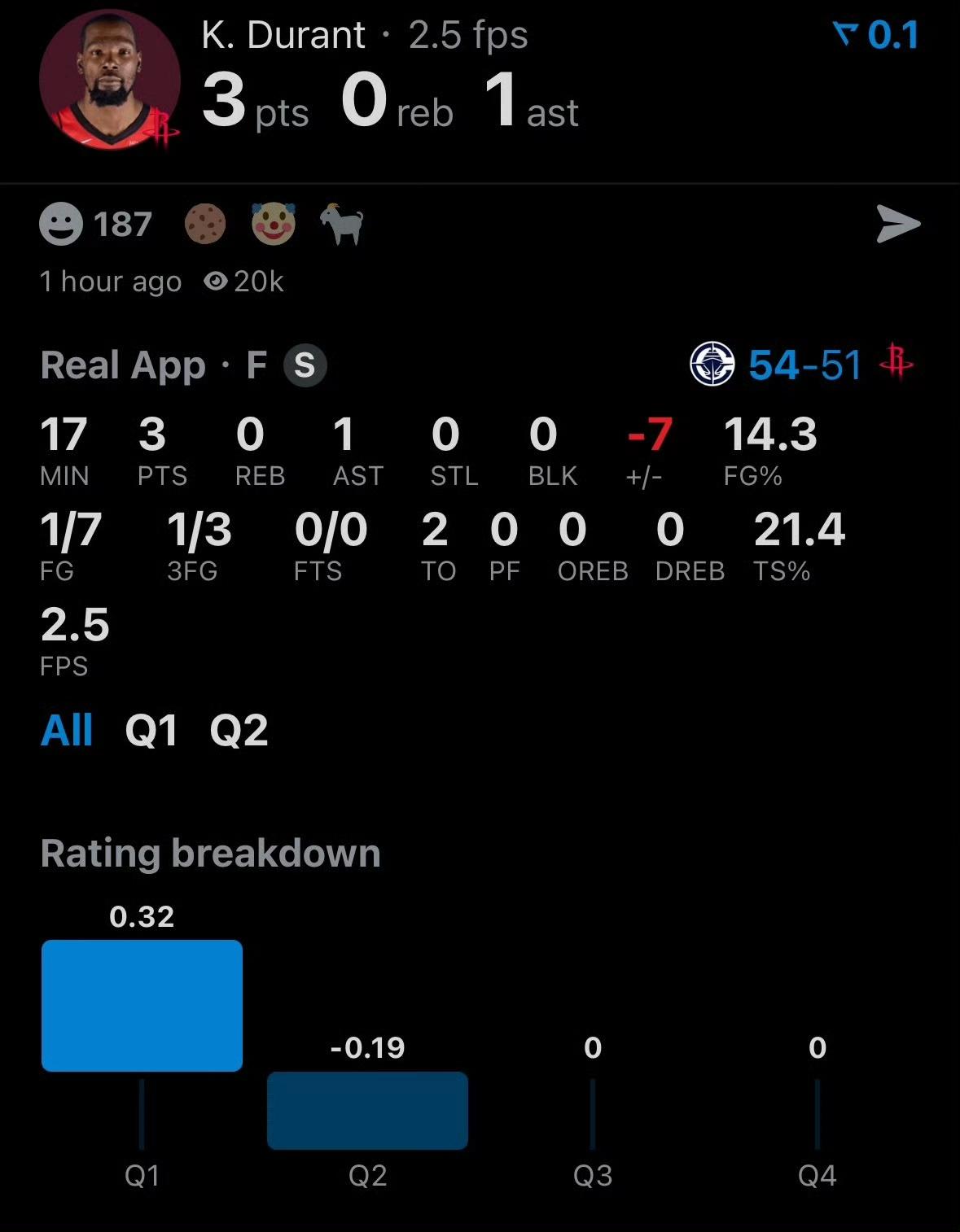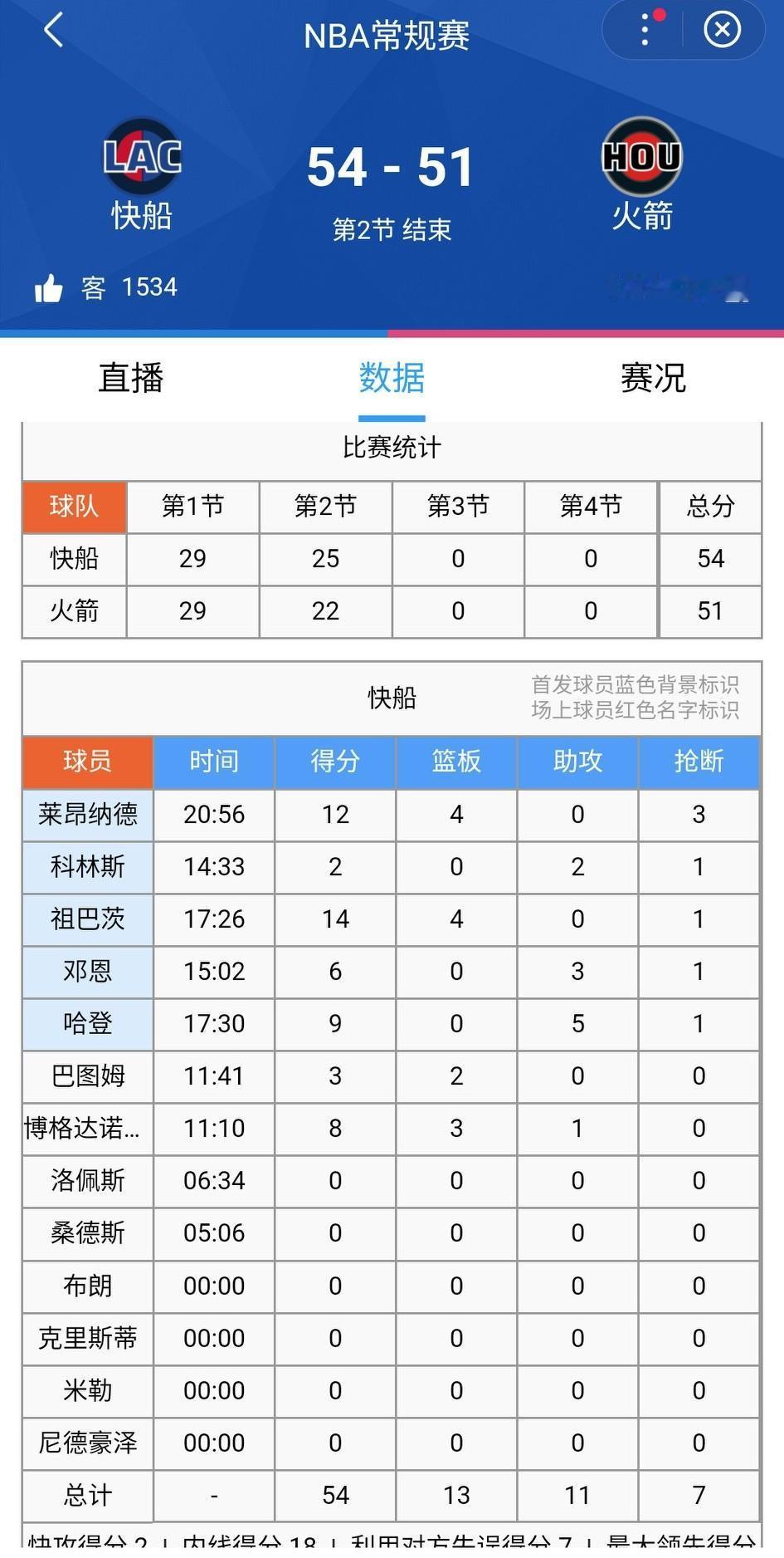 半场结束,快船险胜火箭3分,可惜比赛时间是48分钟!快船54-51火箭 杜兰特7中1,得到3分1助攻2失误。按今天的状态,快船能赢一把? 火箭五大还得练,打个快船都这么费力。